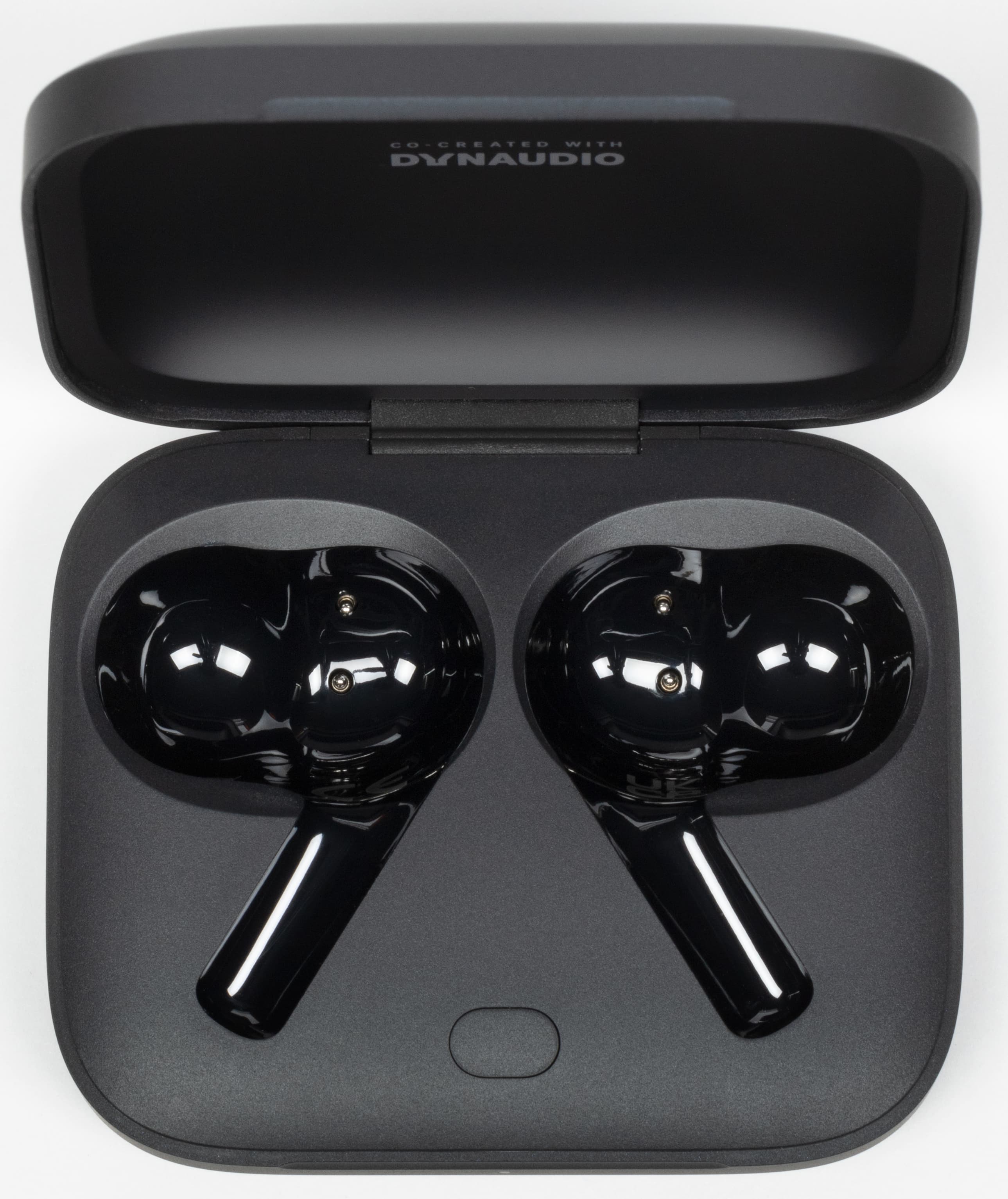 Наушники лежат в своих слотах «бочком», потому вынимаются крайне просто — достаточно потянуть за «палочку». При этом они надежно удерживаются и хорошо защищены от случайного выпадения за счет магнитных креплений. Внутри слотов виднеются подпружиненные контакты для зарядки. Под слотами находится небольшая кнопка, активирующая режим Bluetooth-сопряжения.