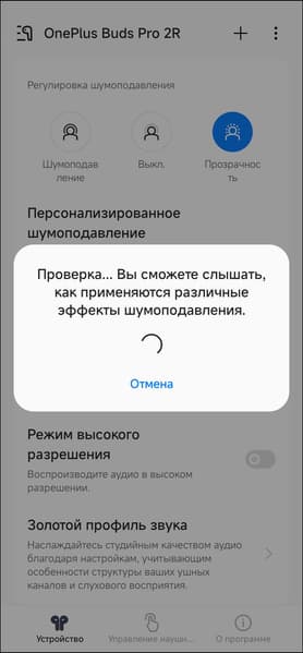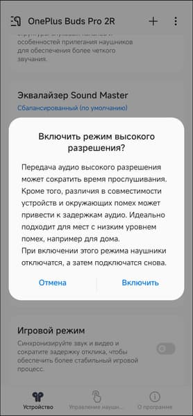 Следующий выключатель на главном экране позволяет включить «режим высокого разрешения», задействующий профили кодека LHDC с потенциально более высоким качеством звука. Ее запуск несколько сокращает время автономной работы наушников, увеличивает задержку и снижает уровень стабильности связи, о чем напоминает всплывающее окно.