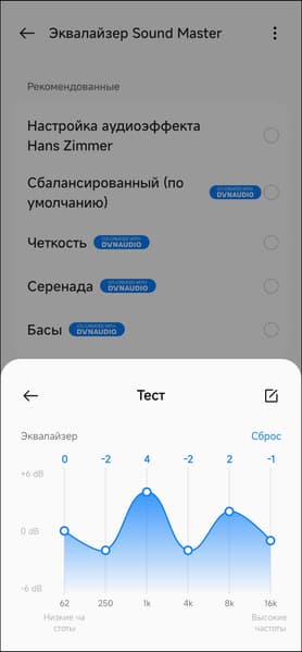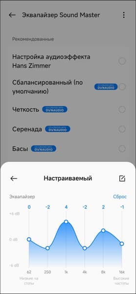 Предусмотрена и возможность создавать свои «звуковые профили» с помощью шестиполосного эквалайзера. Для тонкой настройки частотного баланса он вряд ли подойдет, но всё же позволяет более-менее эффективно управлять акцентами на основных диапазонах.