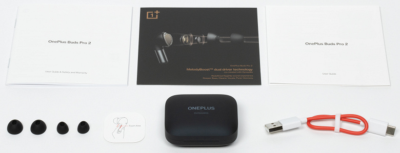 В комплект поставки входят кейс с наушниками, документация, две пары сменных силиконовых насадок (еще одна установлена по умолчанию) и зарядный кабель USB-A — USB-C длиной 20 см.