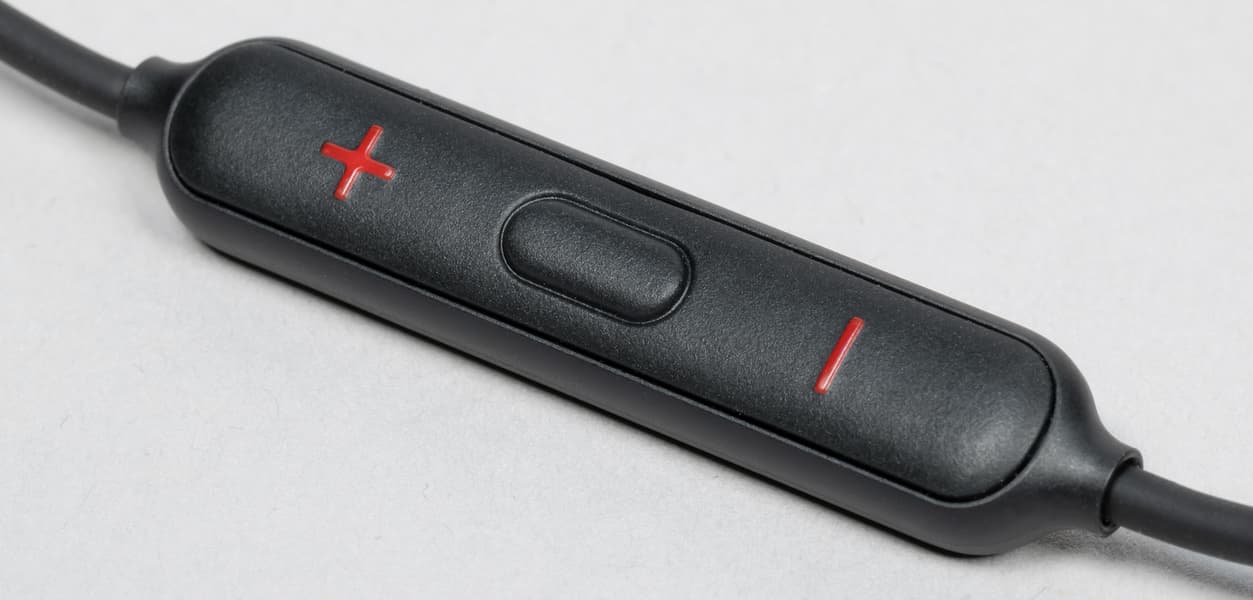 Кнопки маленькие, нащупывать их вслепую не очень удобно. Да еще и нажимаются с усилием чуть выше обычного. В общем, пульт — далеко не самая сильная сторона OnePlus Bullets Wireless 2. Однако после небольшого периода привыкания пользоваться им становится более-менее комфортно.