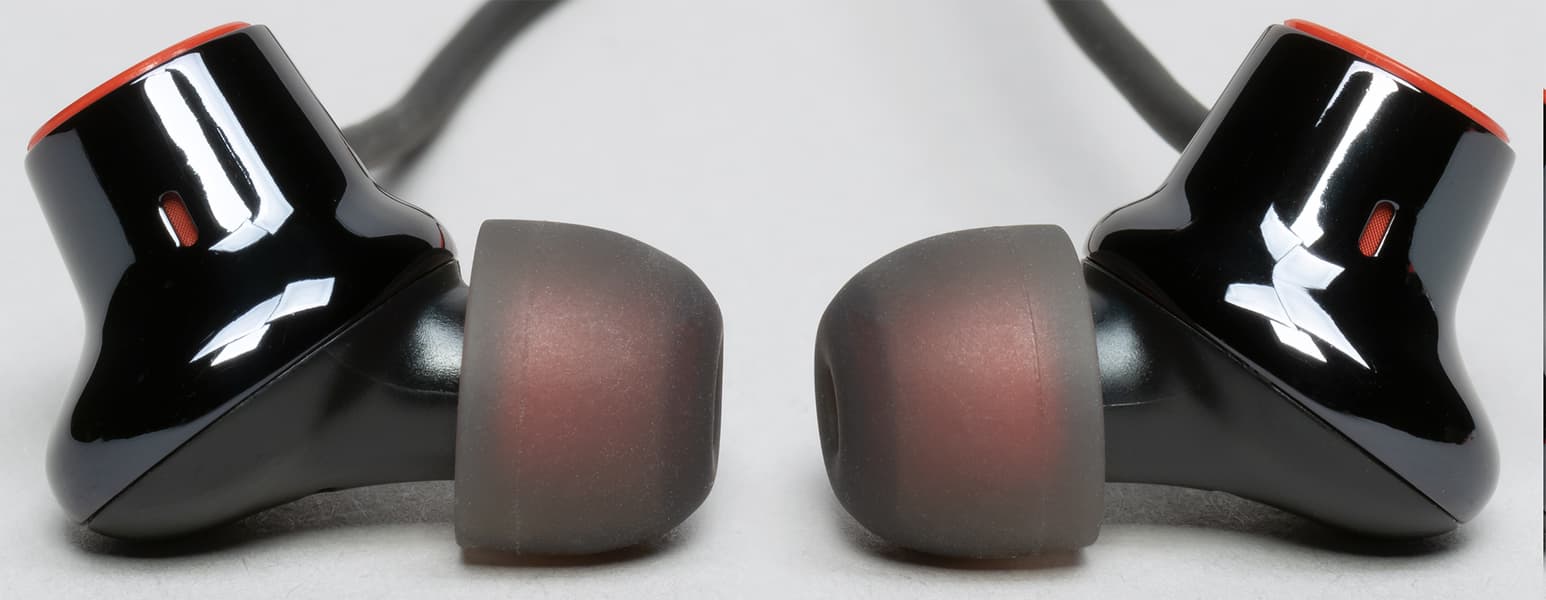 Сменные амбушюры с красным сердечником выглядят оригинально, но при этом без проблем могут быть заменены на стандартные модели.