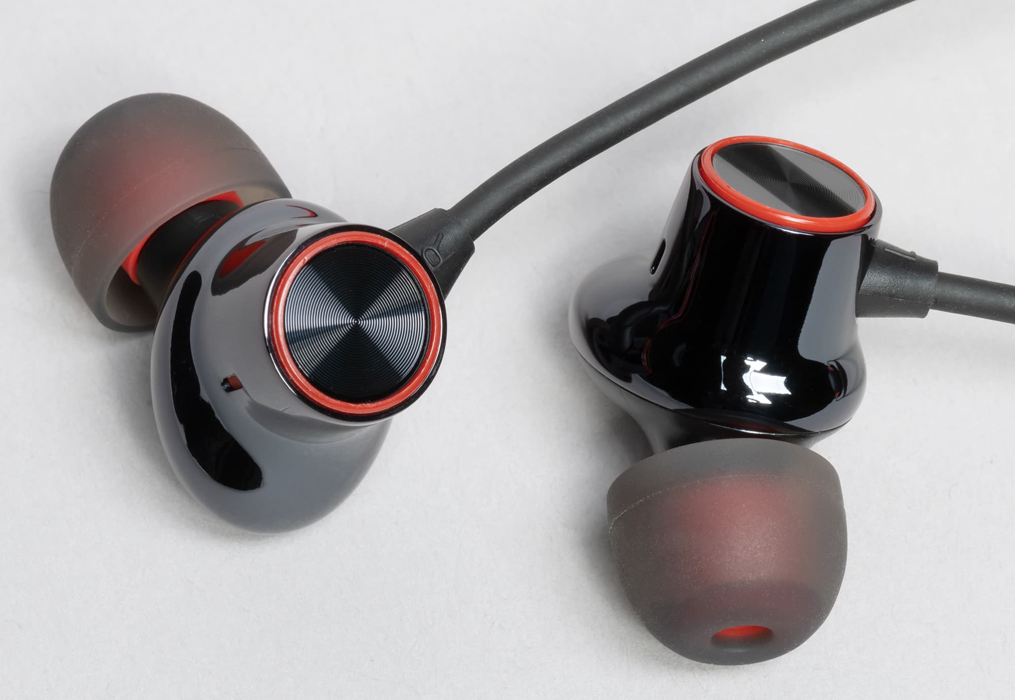 Внешняя часть корпуса наушников имеет глянцевое покрытие. На торце размещено кольцо красного цвета, внутри которого находится накладка с фактурой в виде концентрических кругов.