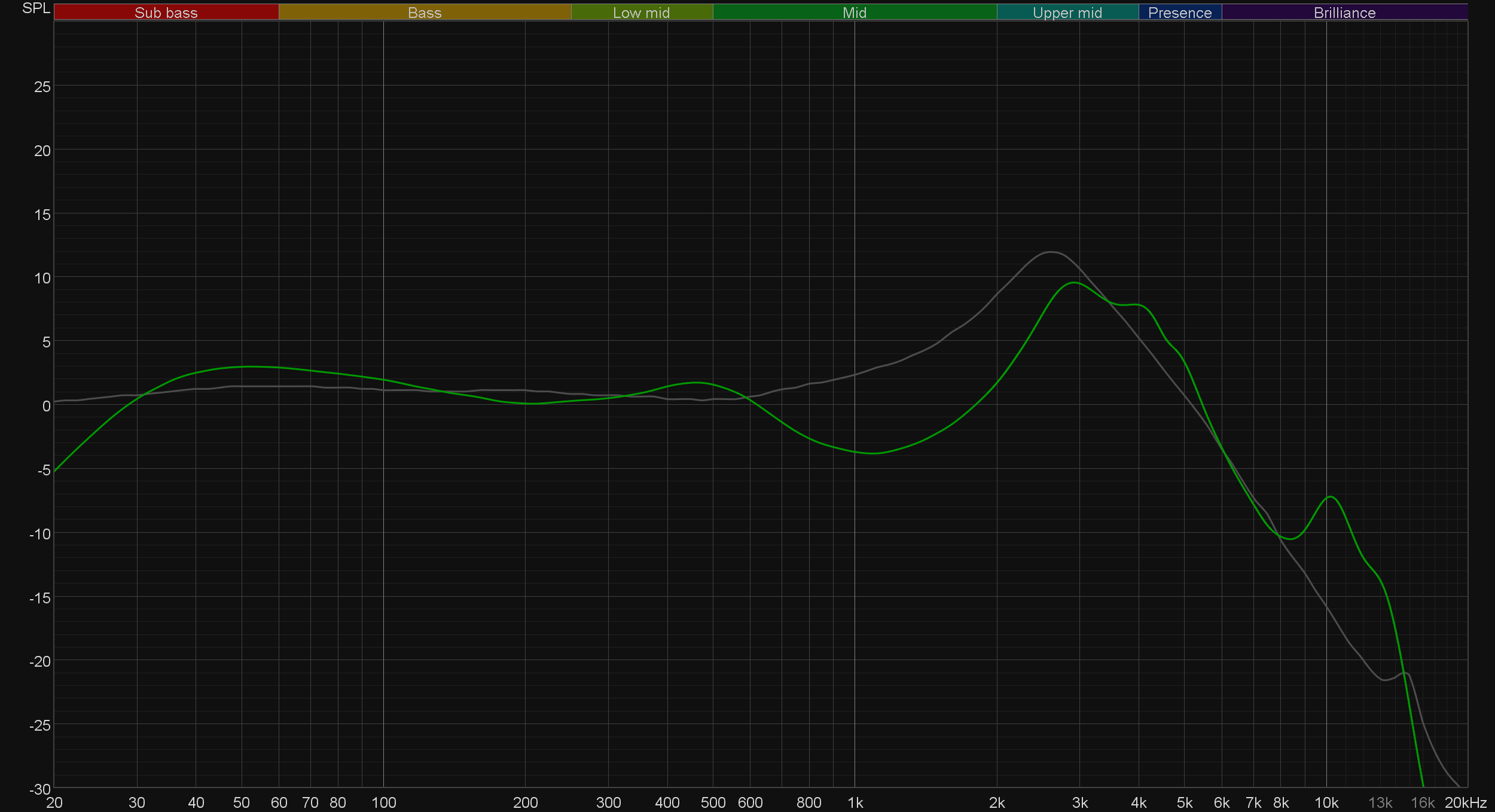 График АЧХ на иллюстрации выше показан на фоне кривой IDF (IEM diffuse field compensation), предоставленной производителем используемого стенда. Ее задача — помочь скомпенсировать резонансные явления в имитированном слуховом канале и особенности используемого оборудования, создав «звуковой профиль», максимально корректно иллюстрирующий то, как звучание наушников воспринимается слушателем. Ее можно рассматривать как адаптированный под конкретное устройство аналог так называемой «кривой Хармана», созданной командой Harman International под руководством доктора Шона Олива. Скомпенсируем полученный график АЧХ в соответствии с кривой IDF.