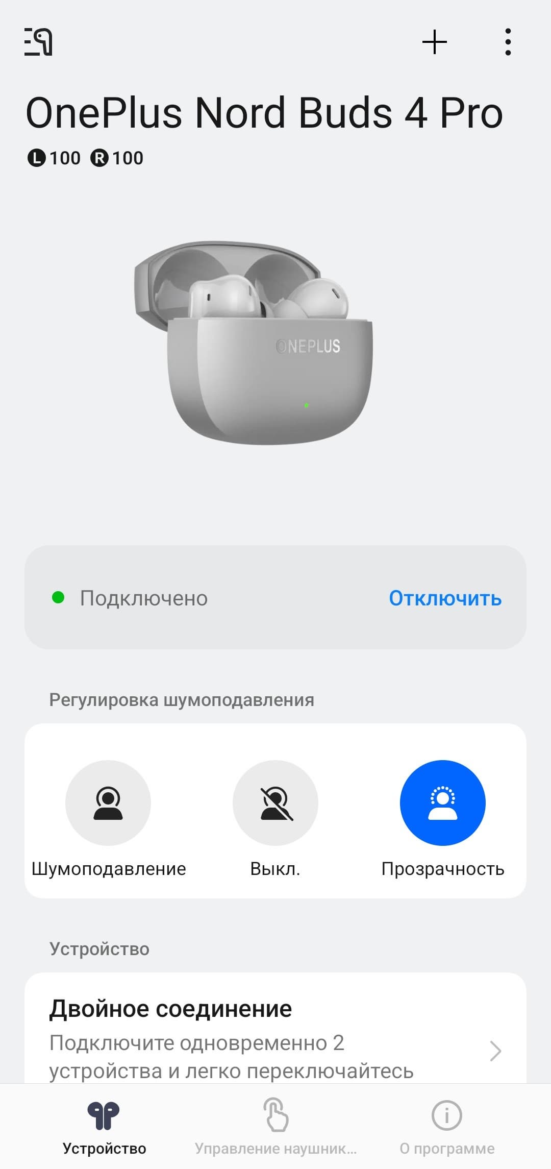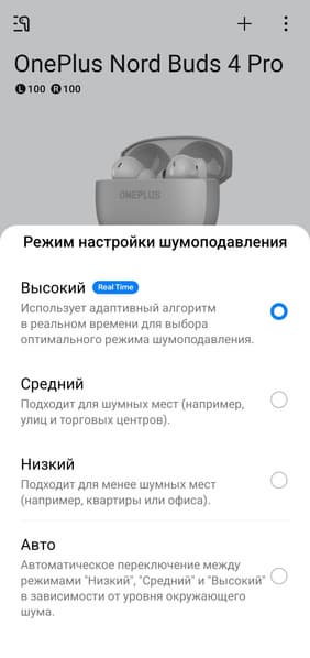 Маркетинговые материалы несколько завышают ожидания от системы шумоподавления OnePlus Nord Buds 4 Pro, хотя на практике она работает просто хорошо — для рассматриваемого ценового сегмента этого более чем достаточно. Не секрет, что все системы ANC лучше всего справляются с низкочастотными шумами, тогда как в среднем диапазоне заметно менее эффективны: голоса людей, скрипы в общественном транспорте и прочие подобные звуки нередко остаются вне зоны активного подавления. В данном случае заявлена эффективность вплоть до 5 кГц, по факту же работа «шумодава» на средних частотах ощущается, хотя и довольно слабо.