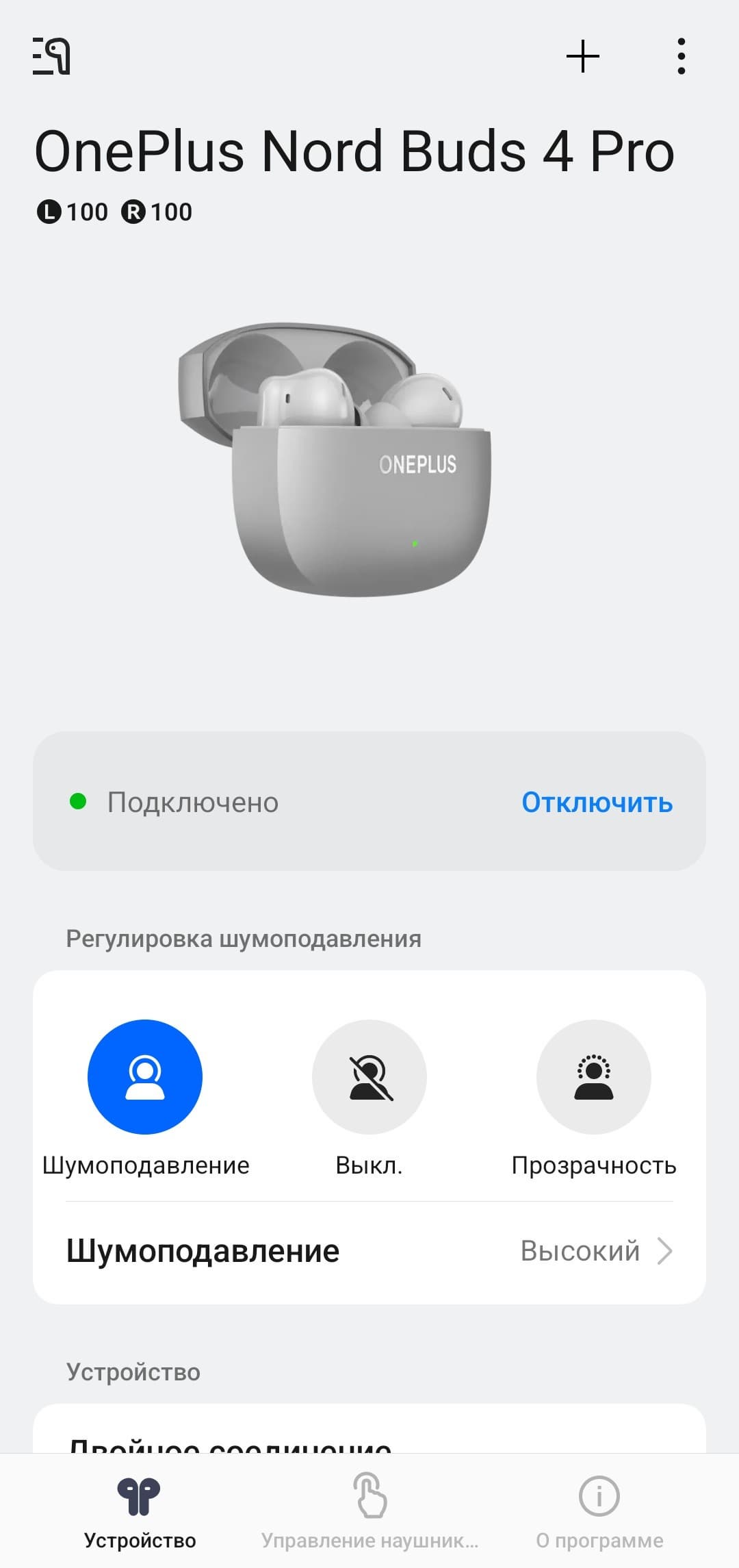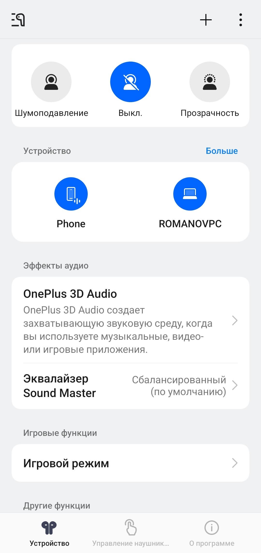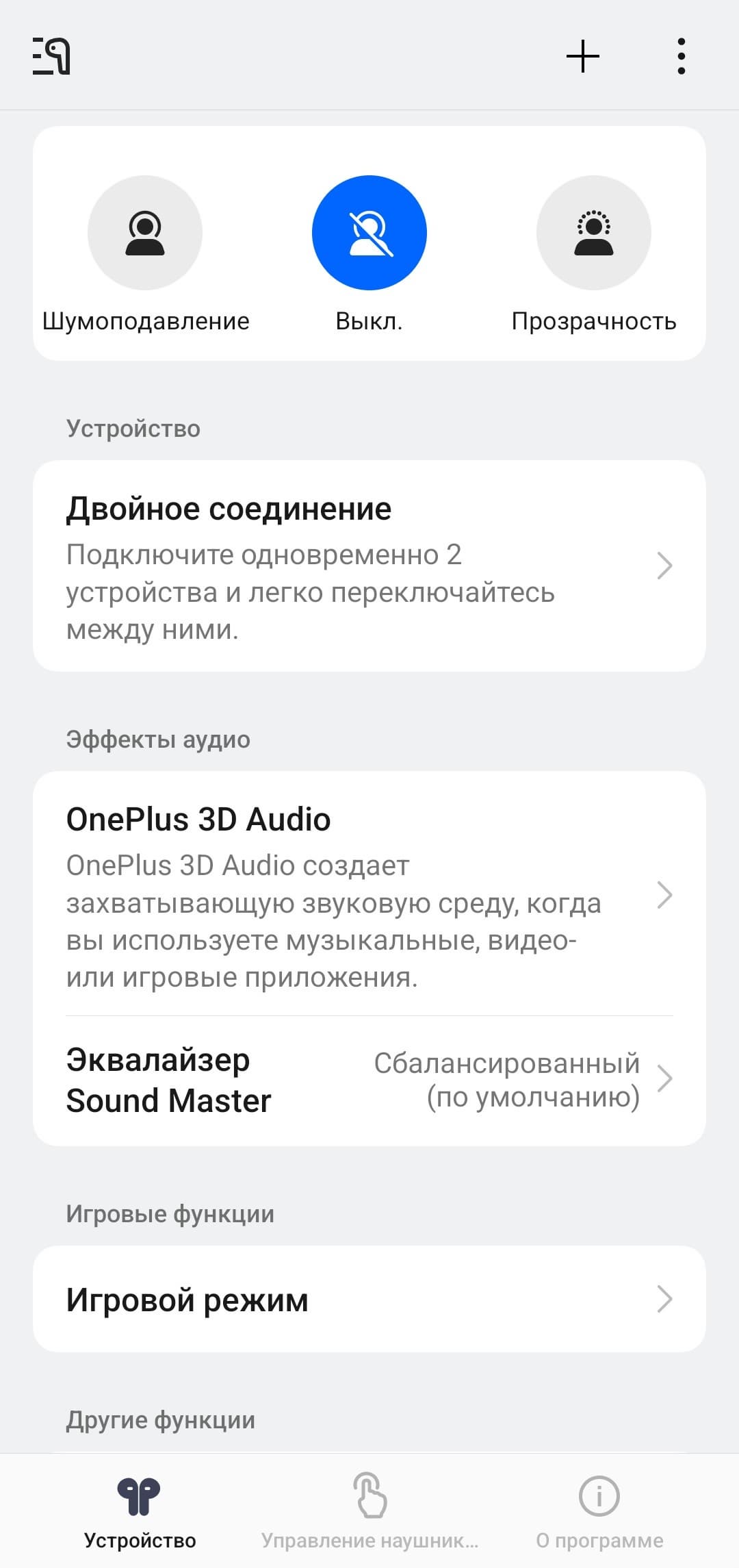 В центре экрана размещен модуль управления системой активного шумоподавления. Пользователю предлагается выбрать уровень агрессивности его работы: низкий, средний или высокий. На последнем используется адаптивный алгоритм, который в реальном времени подбирает оптимальный режим. Отдельно предусмотрено автоматическое переключение между уровнями шумоподавления. Также доступен режим «прозрачности», при котором микрофоны гарнитуры транслируют внешние звуки в динамики.