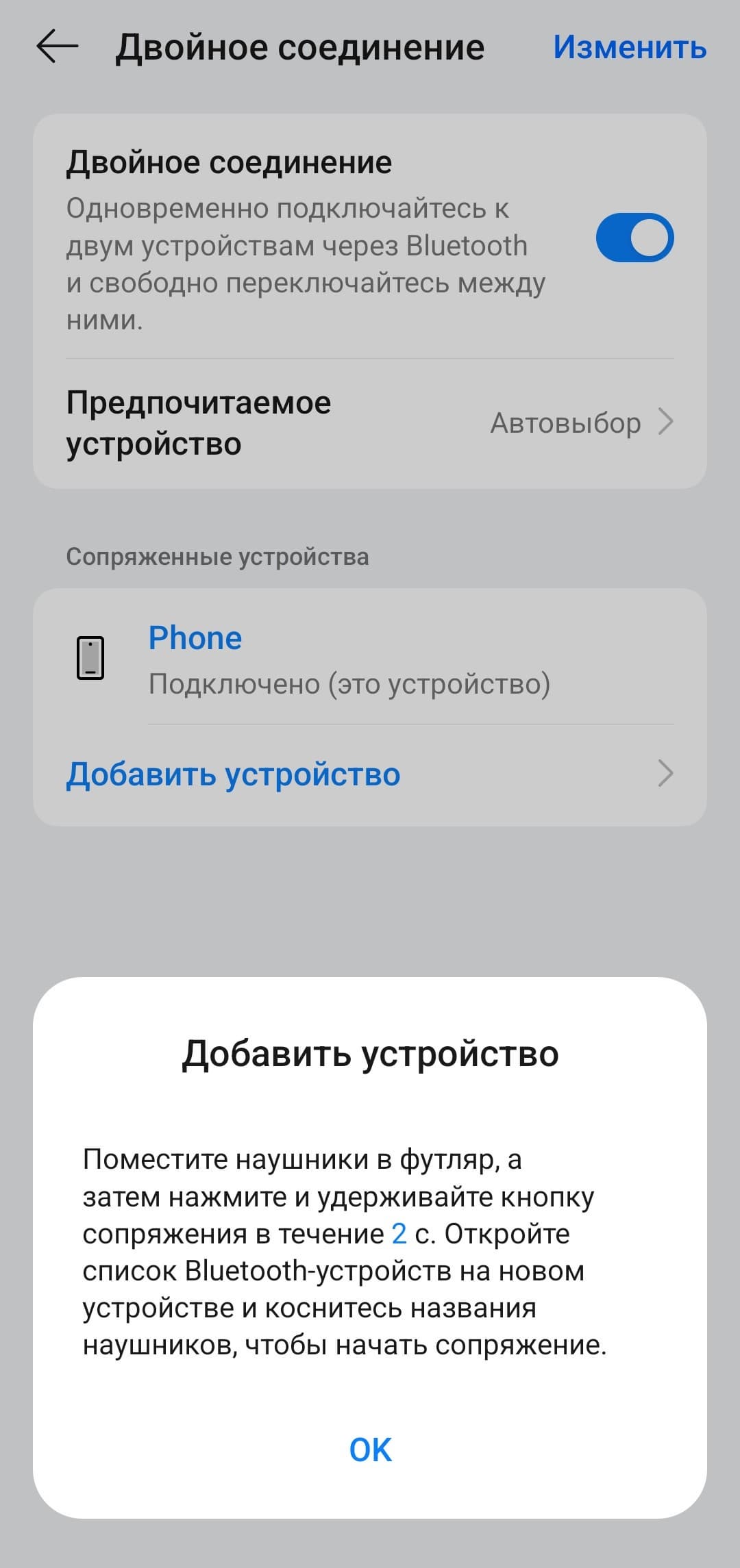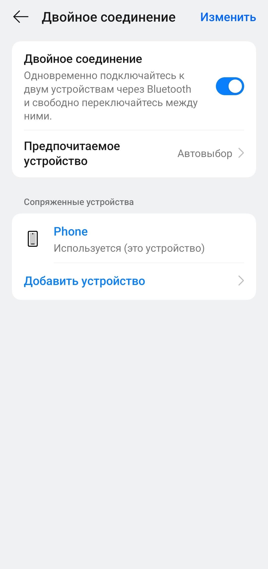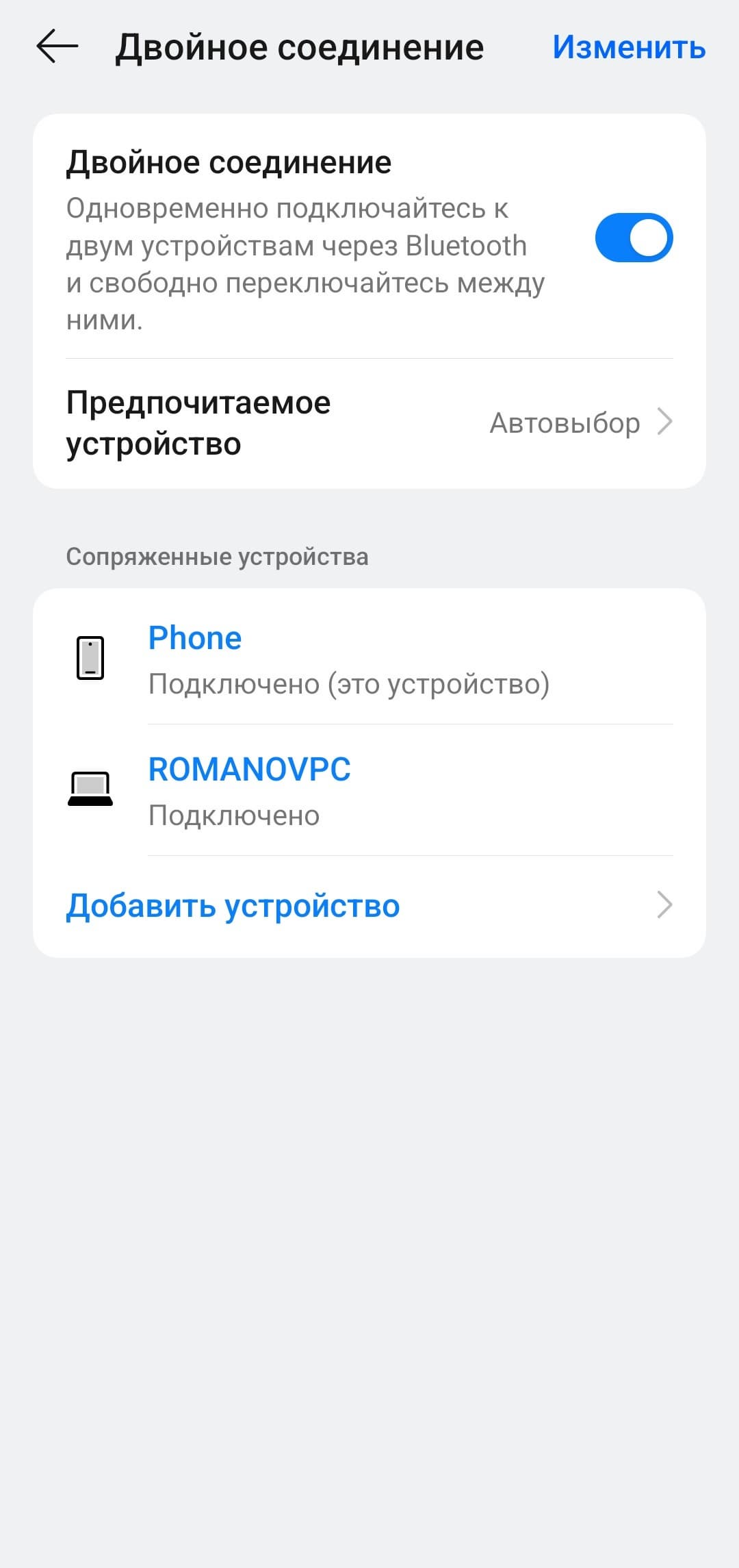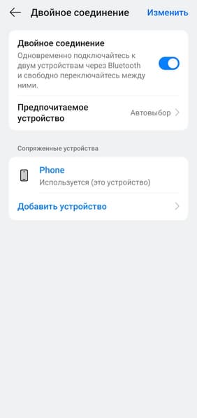 Настройки мультипойнта вынесены на отдельную страницу, где можно включить или отключить функцию, посмотреть список всех сопряженных устройств, добавить новое или выбрать приоритетное.
