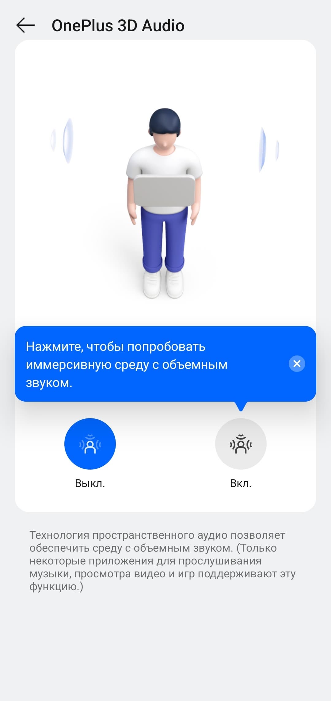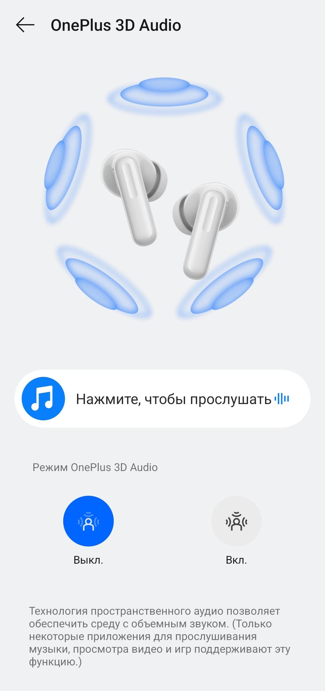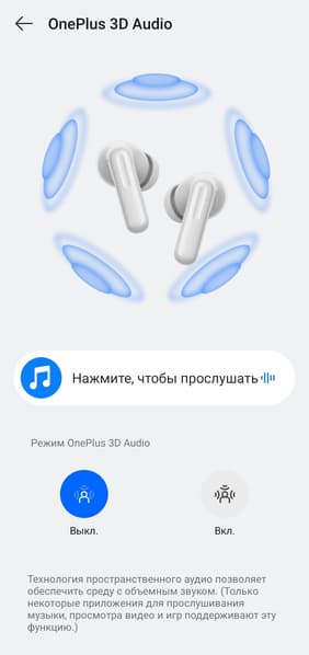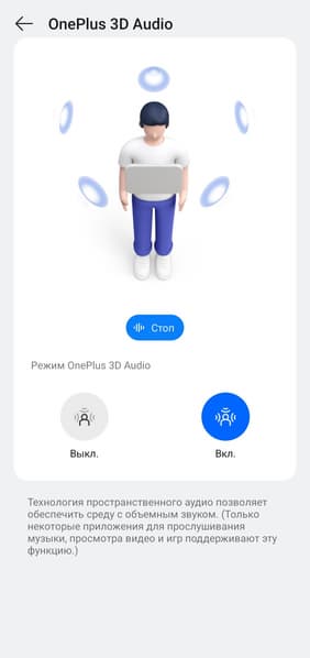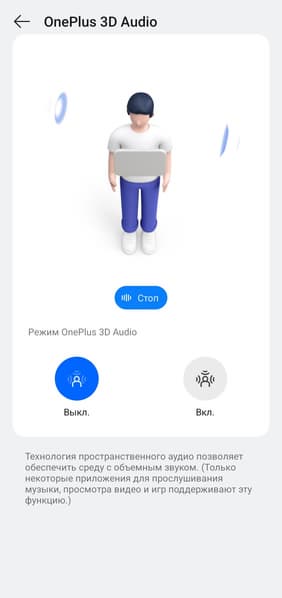 Так называемый режим 3D-аудио призван создать ощущение более объемного звучания. Проверить его работу можно на примере со страницы настроек. В целом функция любопытная: звук в кино, например, становится немножко более эффектным. На музыкальном материале все подобные эффекты звучат довольно спорно, но многим нравится — тут исключительно дело вкуса.