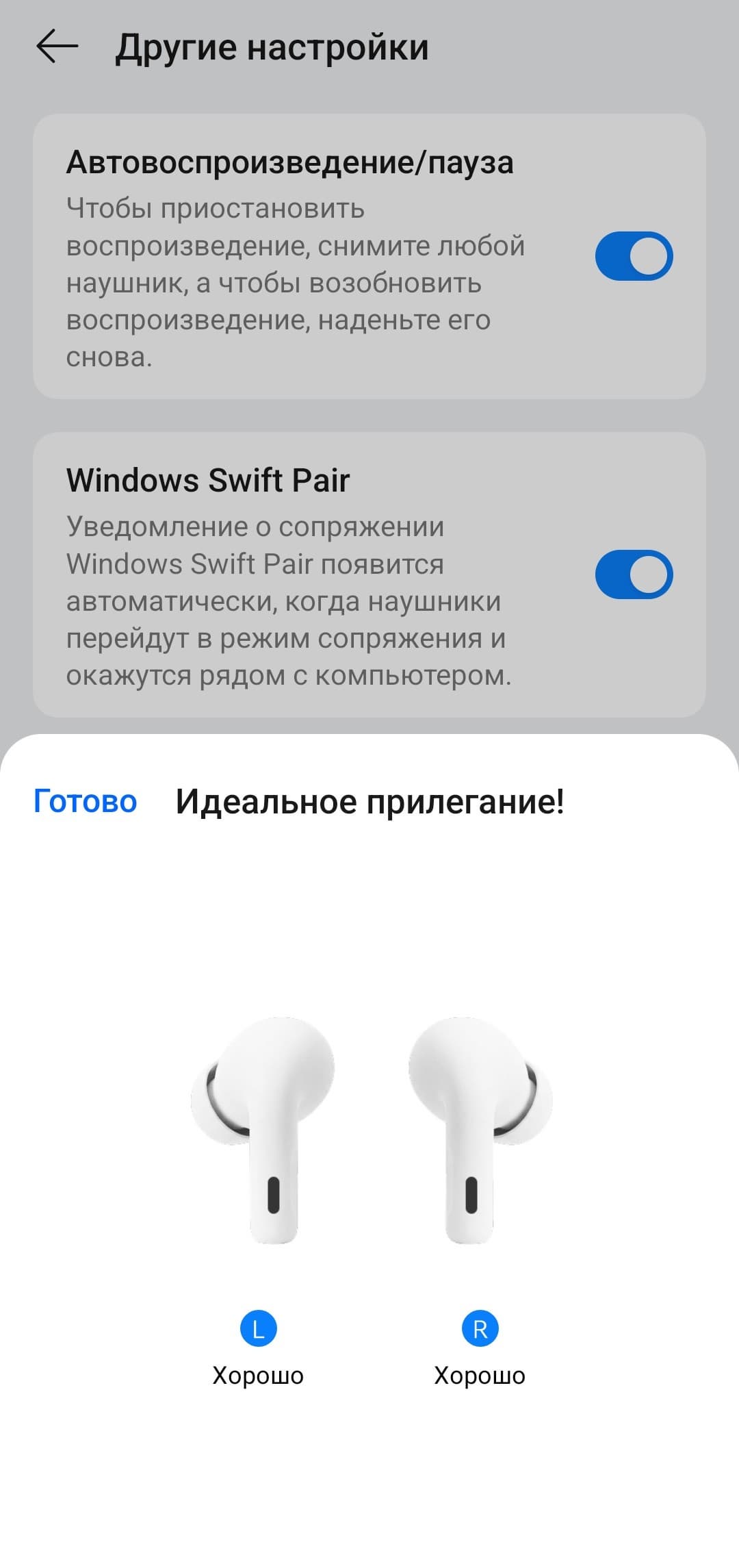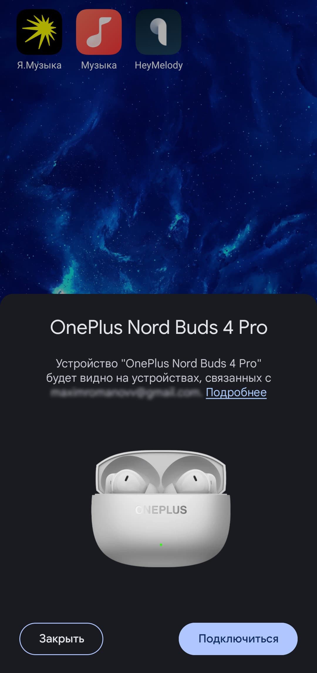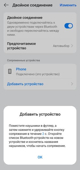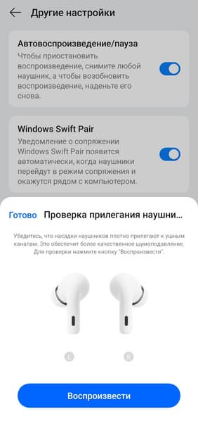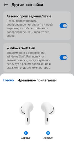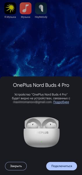 Гарнитура поддерживает Google Fast Pair и Swift Pair, поэтому к устройствам под управлением Android и Windows она подключается практически в автоматическом режиме. После открытия крышки устройство некоторое время ищет ранее сопряженные источники звука, а если не находит — запускает процесс поиска новых. Если по каким-то причинам этого не произошло, можно активировать сопряжение вручную, нажав кнопку на кейсе. Далее на экране появляется приглашение подключиться — остается лишь согласиться. Классический вариант подключения через меню гаджета, конечно, тоже возможен — если продвинутые технологии не сработают, всегда можно воспользоваться им.