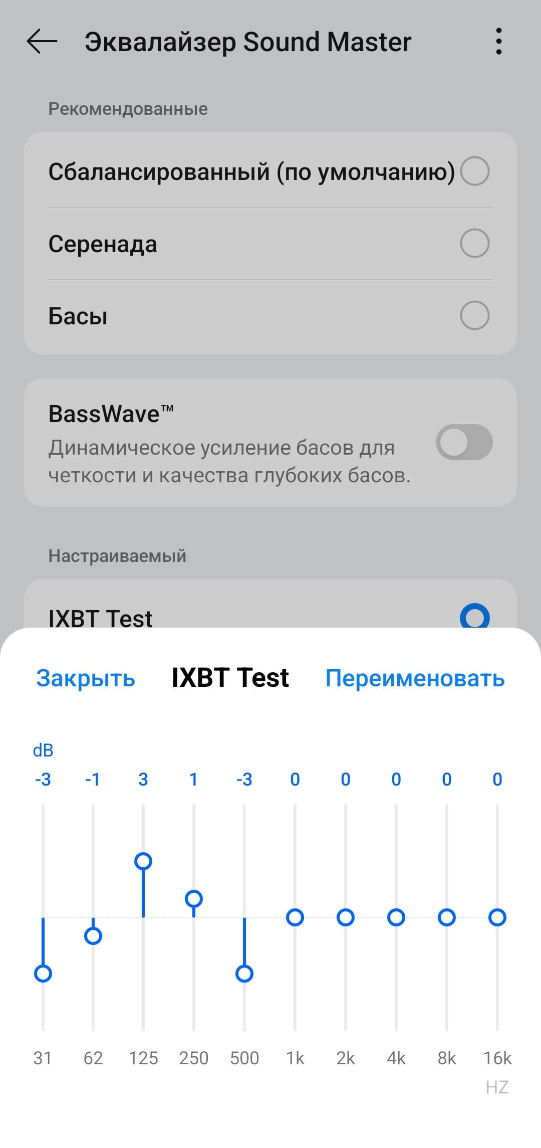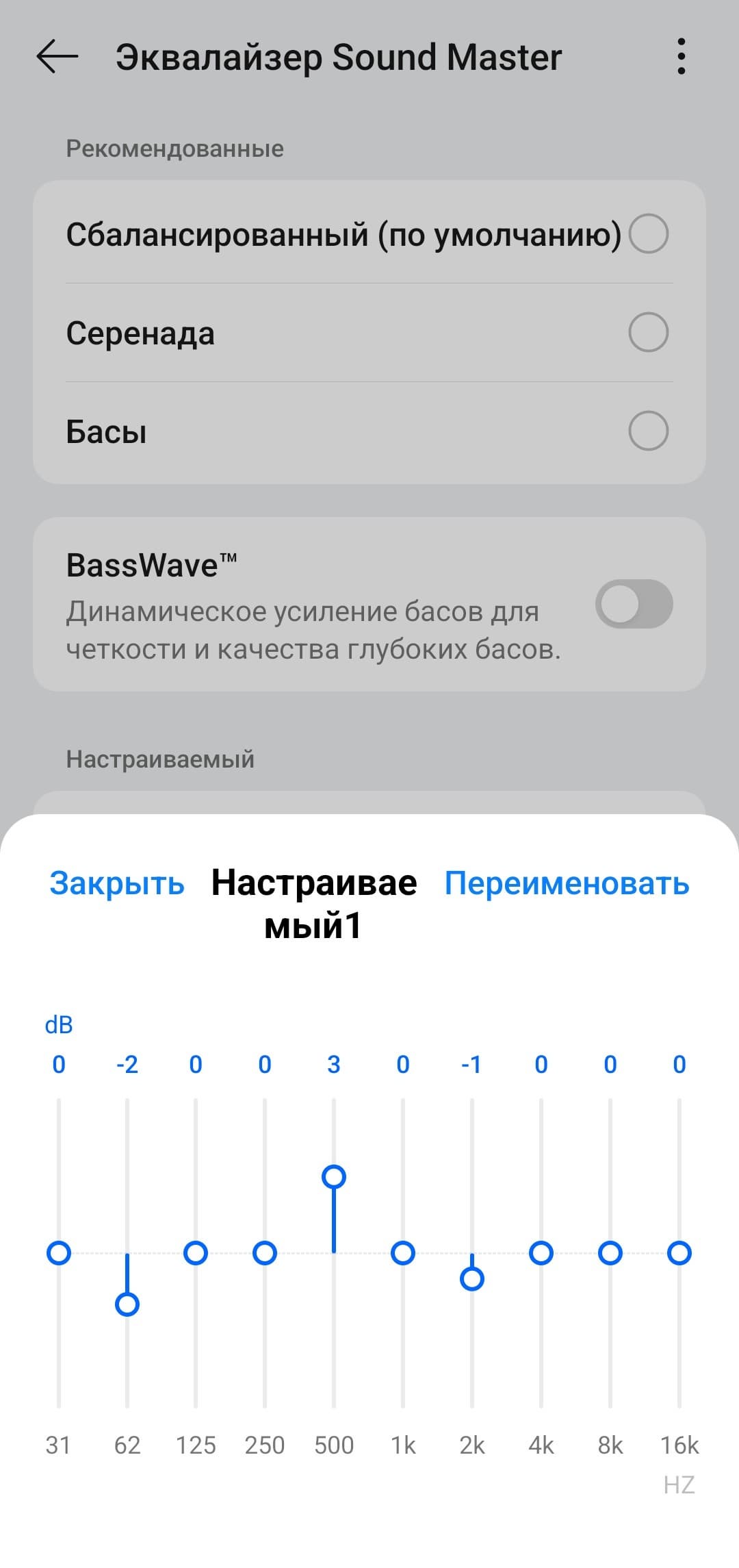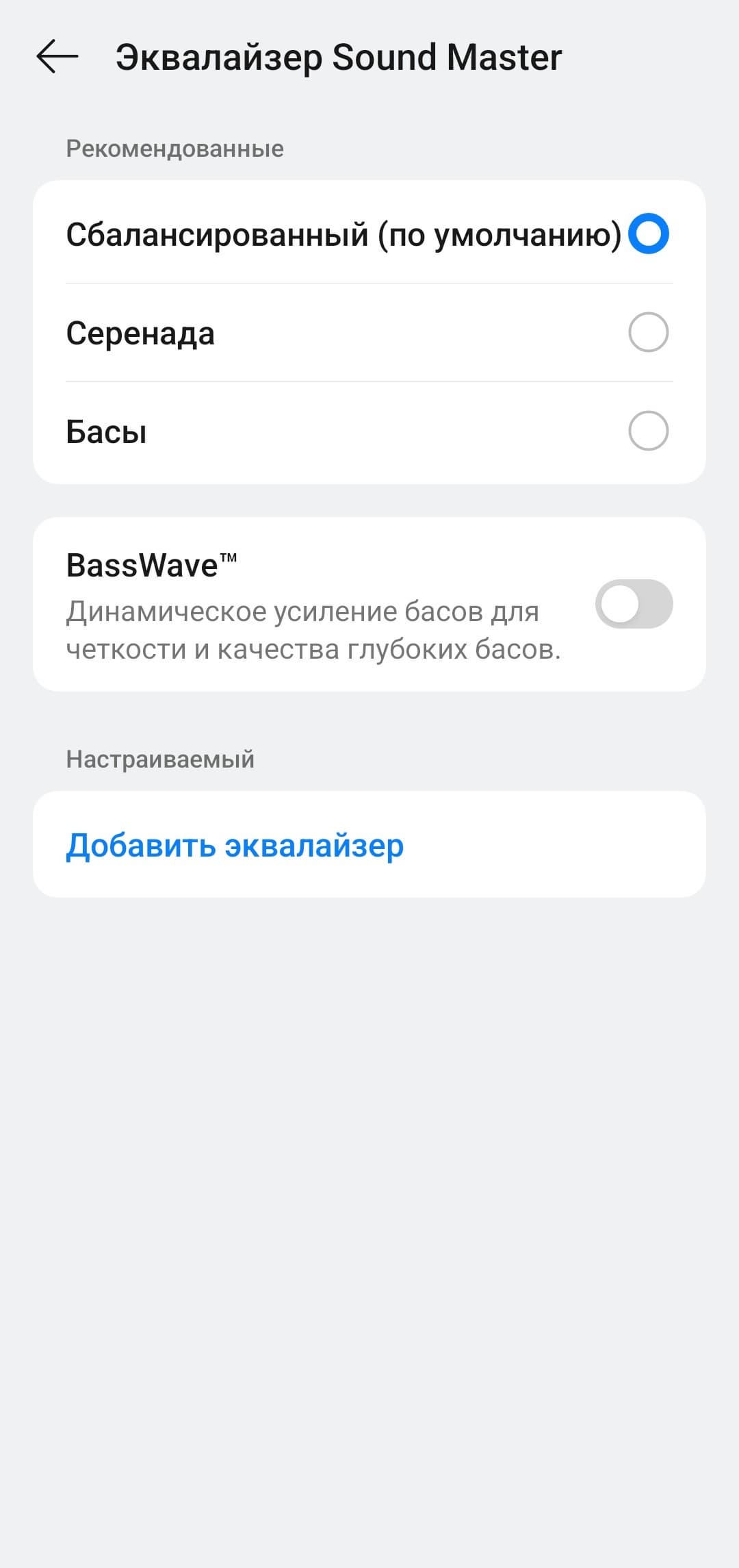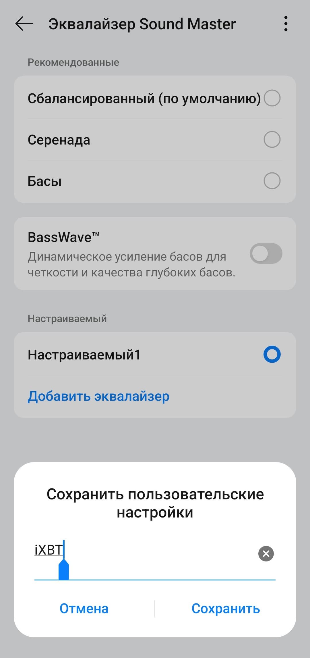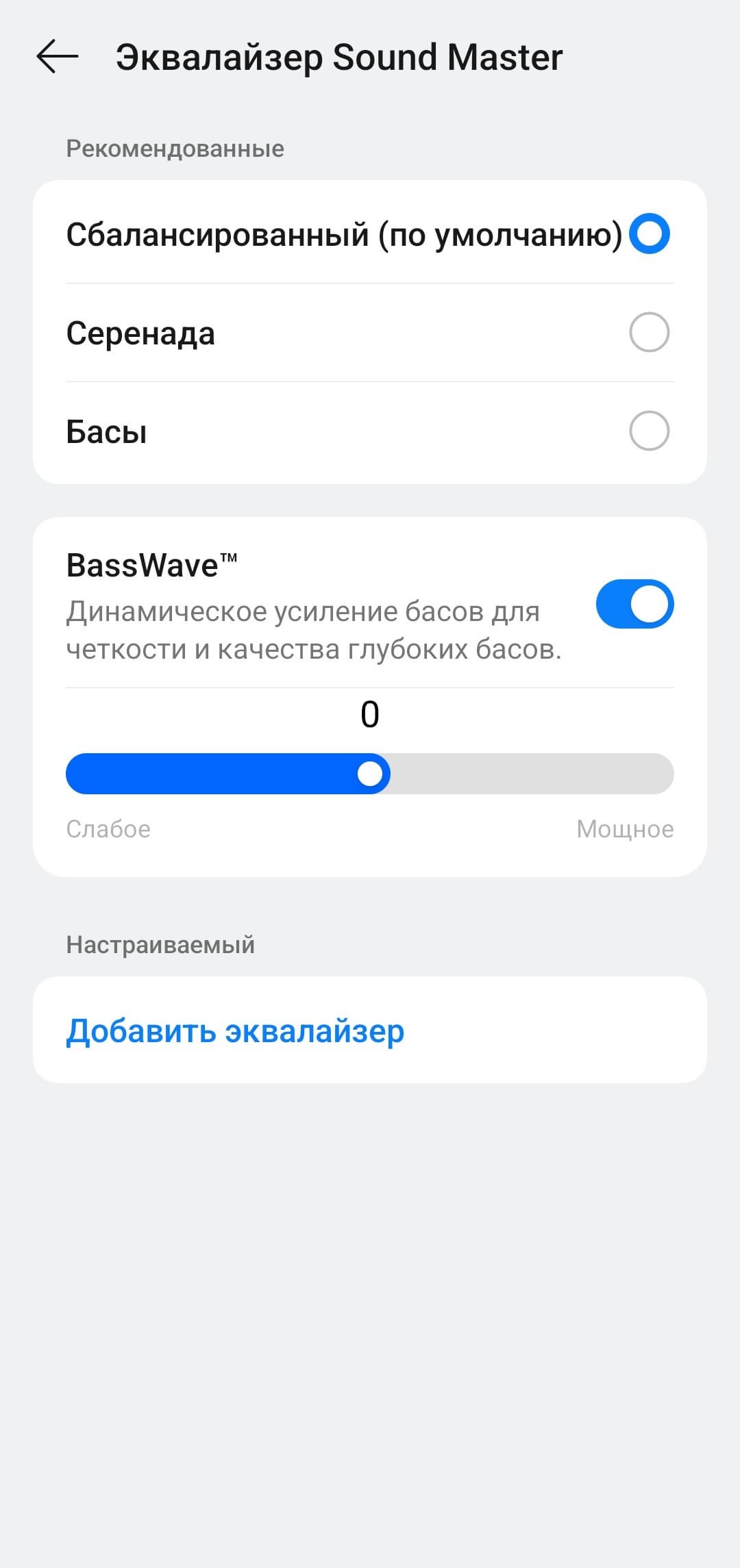 Встроенные пресеты эквалайзера работают эффективно и в первую очередь воздействуют на одну из главных особенностей настройки — акцент на саббасе. «Серенада» заметно ослабляет его, делая подачу более спокойной и ровной — приятно, что добиться такого эффекта можно одной кнопкой. Пресет «Бас», наоборот, добавляет напора, окончательно выводя низкие частоты на первый план.