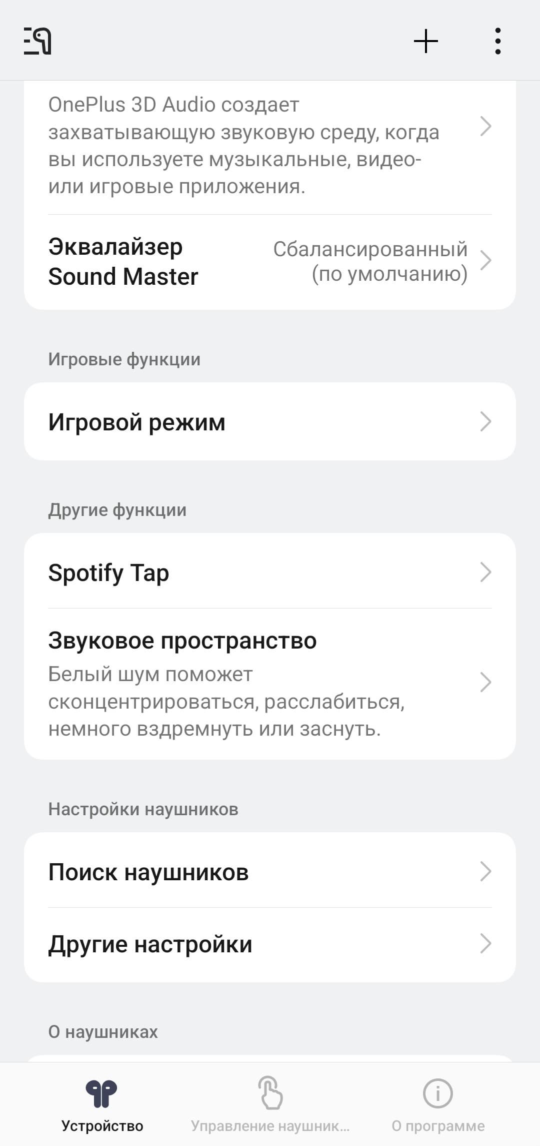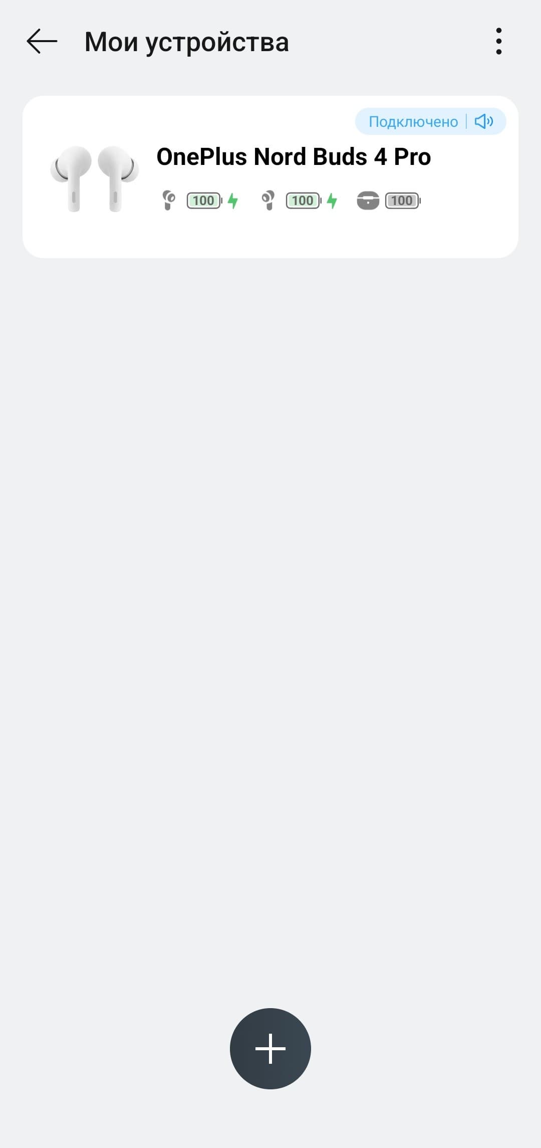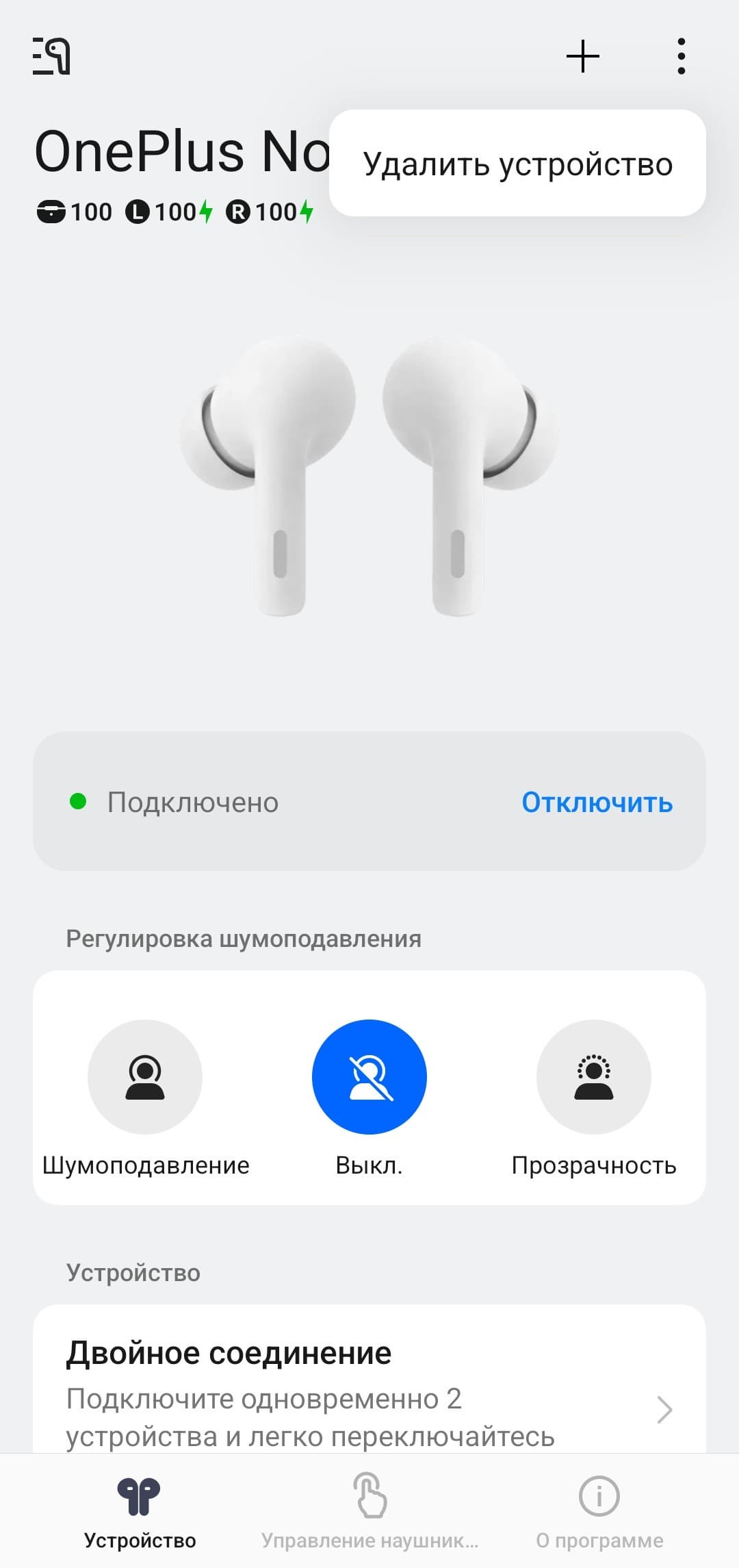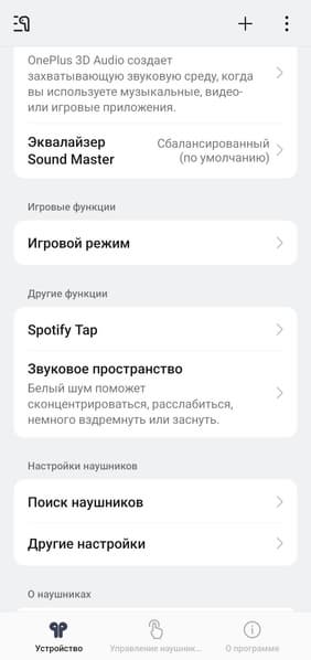При использовании смартфонов OnePlus управление наушниками осуществляется штатными средствами, обладателям же других устройств рекомендуется установить приложение HeyMelody. Процесс установки и подключения проходит привычно и без сложностей. После инсталляции открывается главный экран с изображением наушников и индикацией заряда каждого из них, а также кейса. Значок плюса в правом верхнем углу позволяет добавить еще одно устройство, а тап по иконке в виде трех точек открывает дополнительное меню с единственным пунктом — удалением текущего устройства.