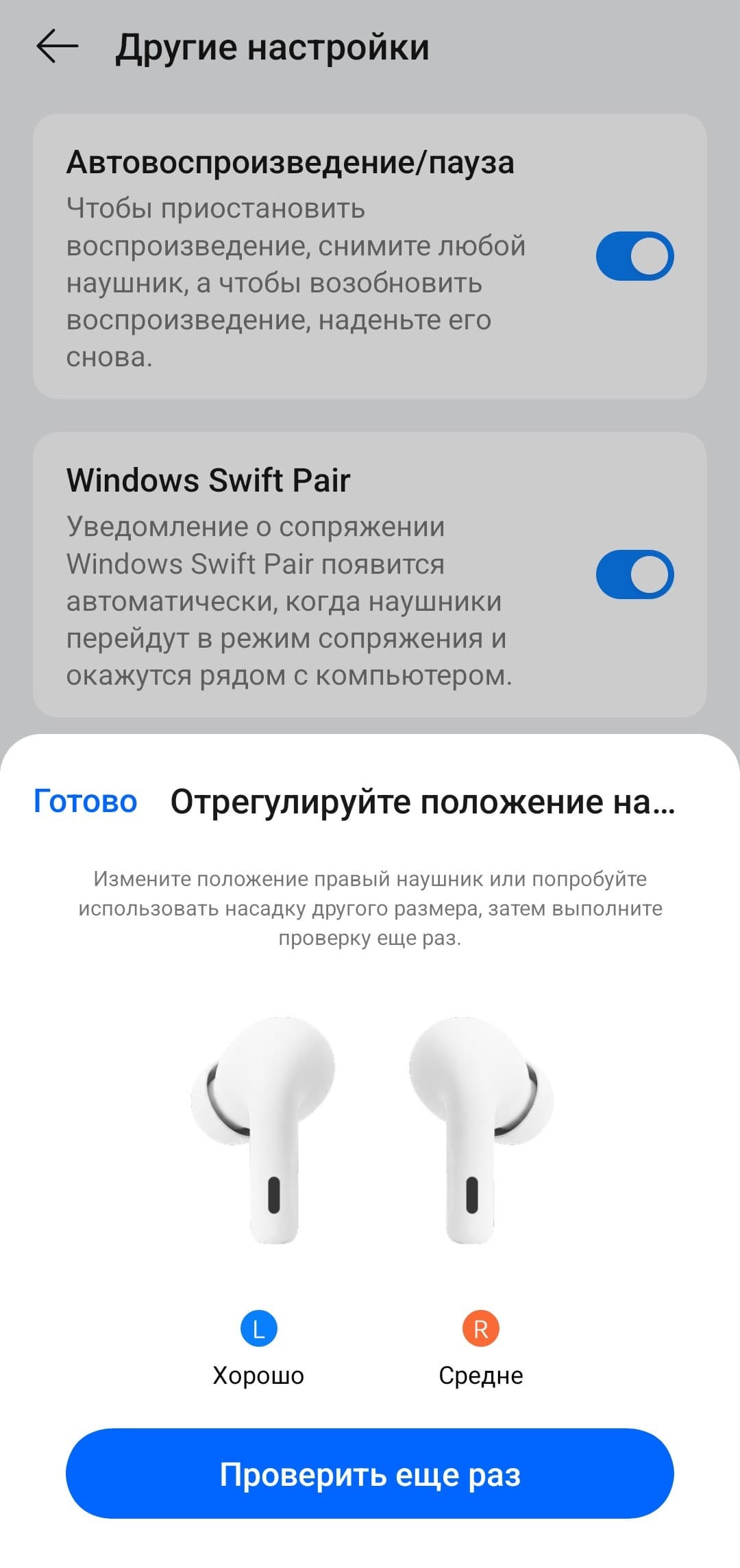 Есть и тест правильности посадки с подбором размера насадок: динамики воспроизводят звук, а внешние микрофоны пытаются его уловить. Если сигнал улавливается, значит утечки слишком велики и наушники сидят неплотно. Мы традиционно поэкспериментировали: пробовали заведомо неподходящие насадки и намеренно нарушали посадку — в большинстве случаев тест сразу сигнализировал о проблеме.