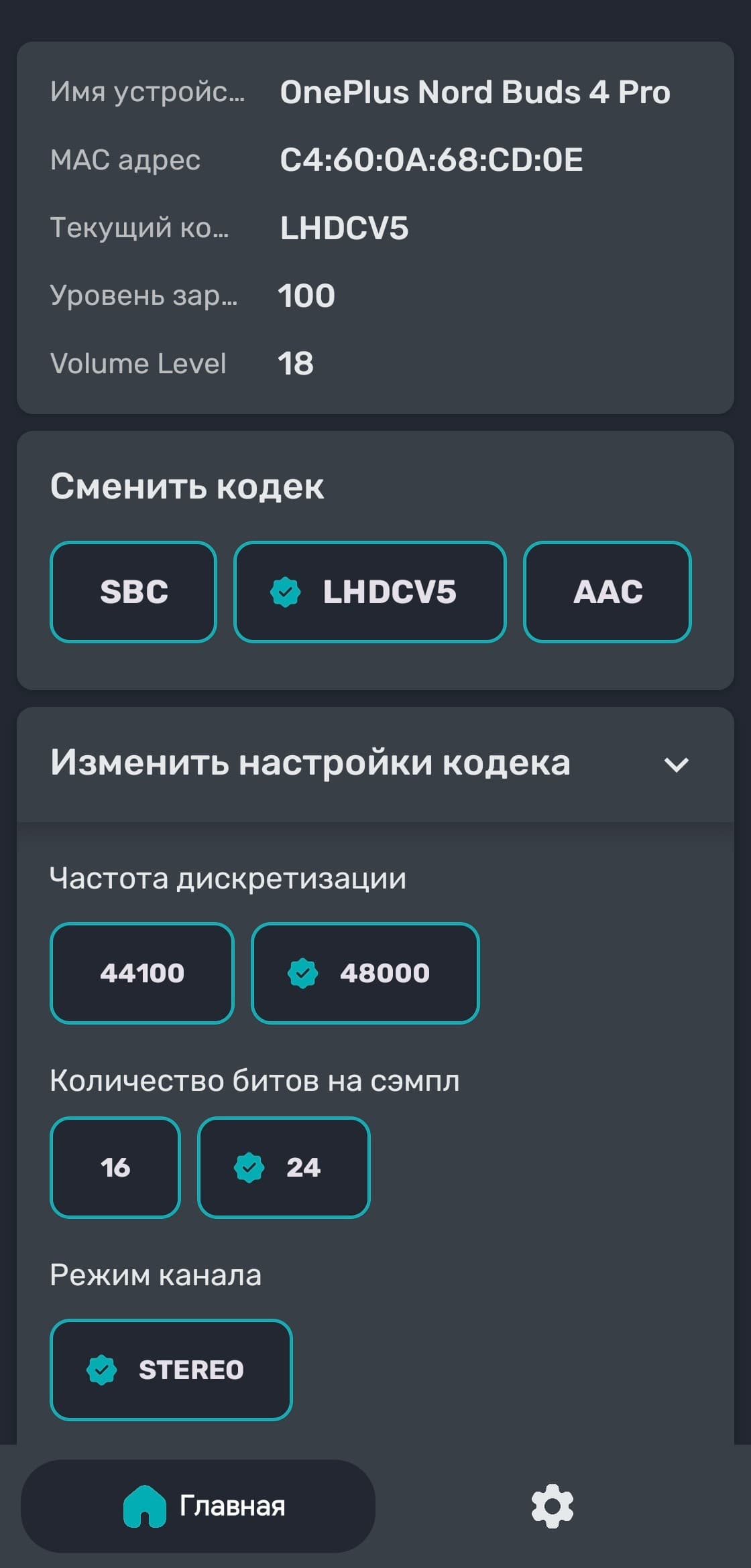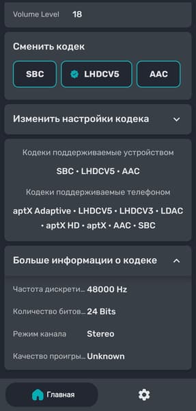 Устройство с поддержкой LHDC автоматически «подхватывает» его, никаких дополнительных действий вроде активации в приложении не требуется. С помощью утилиты Bluetooth Tweaker мы убедились, что речь действительно идет о пятой версии кодека.