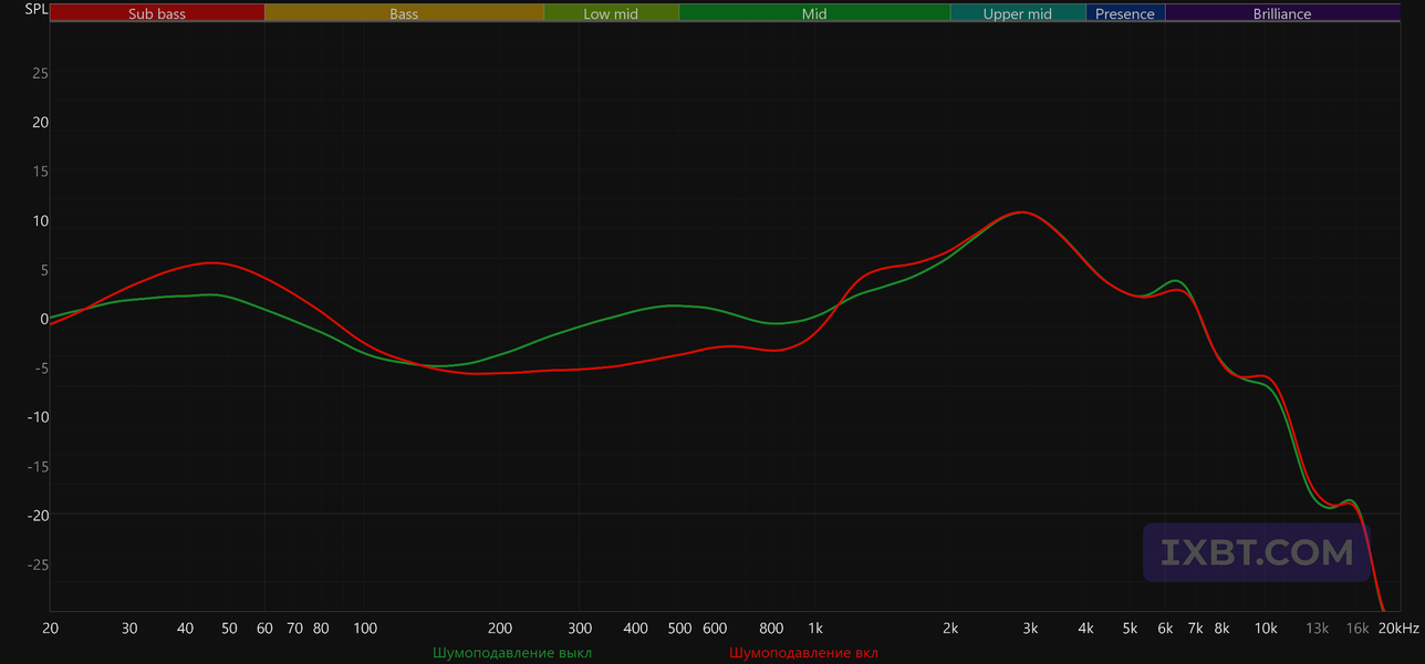 Системы активного шумоподавления, как правило, не лучшим образом влияют на воспроизведение тех частот, в которых они наиболее эффективны — прежде всего на бас. В данном случае это влияние заметно, но оно явно компенсируется встроенным DSP, который дополнительно акцентирует глубокий бас и одновременно слегка «подравнивает» середину. Получается на удивление неплохо, хотя профиль звучания меняется довольно заметно. Ну а в лучшую или худшую сторону — опять-таки исключительно дело вкуса.