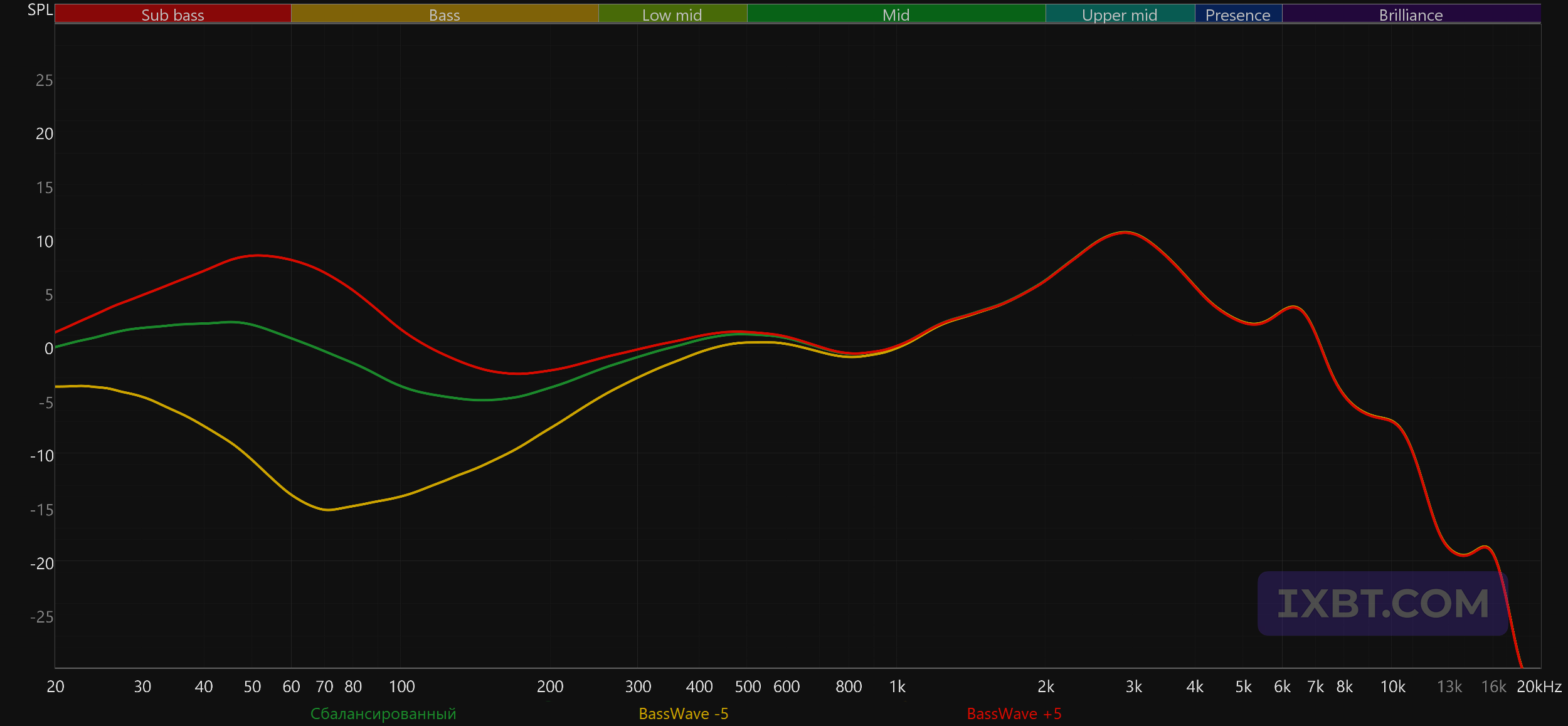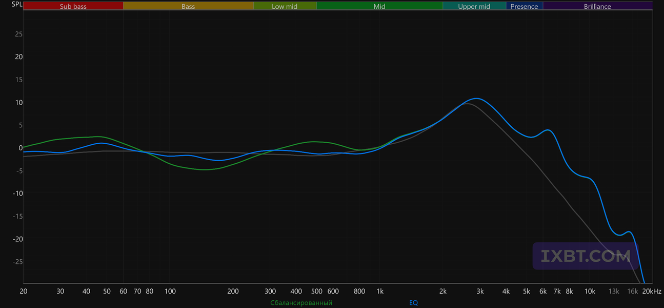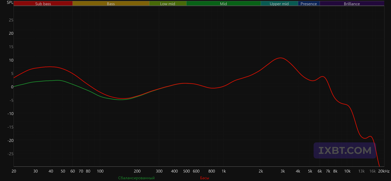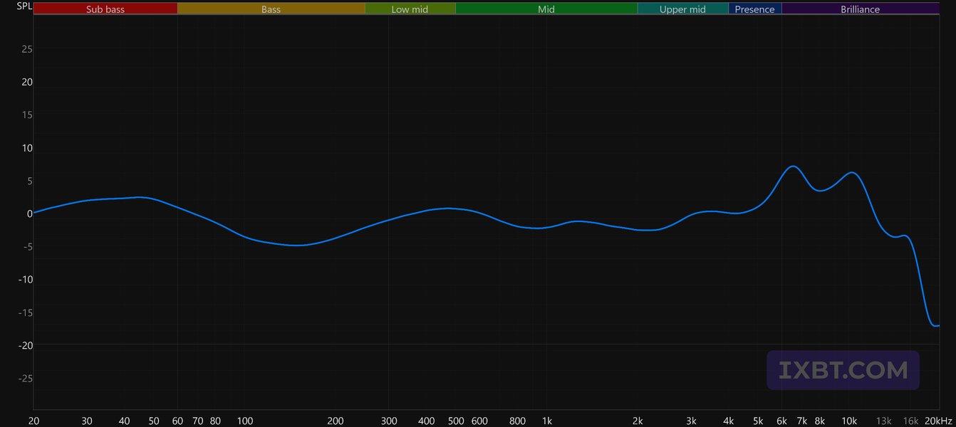 ВЧ-диапазон подается довольно сдержанно: небольшой акцент в районе 6—7 кГц может чуть подчеркнуть артикуляцию, но в целом заметен мало — он скорее немного докручивает звук, чем радикально его меняет. В целом подача далеко не мониторная и не ровная, задача здесь — подать музыку эффектно и интересно. В таких случаях все всегда упирается во вкус слушателя: кому-то нравится, кому-то нет.