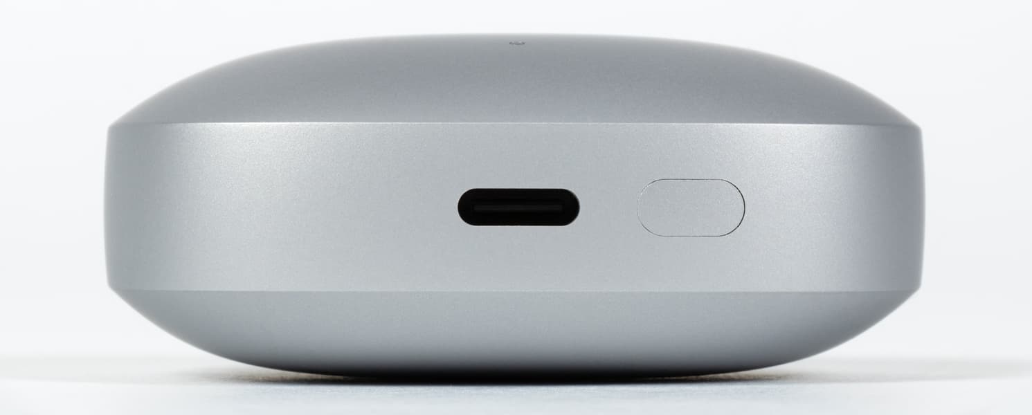 На дне размещен порт USB-C для зарядки. Все кабели, которые оказались под рукой во время тестирования, входили в него с мягким щелчком, но самую малость люфтили — проблемой это не назвать, хотя посадка чуть свободнее ожидаемого. Справа находится кнопка, запускающая сопряжение гарнитуры с источником звука. Она размещена заподлицо с поверхностью, поэтому почти незаметна и одновременно защищена от случайных нажатий.