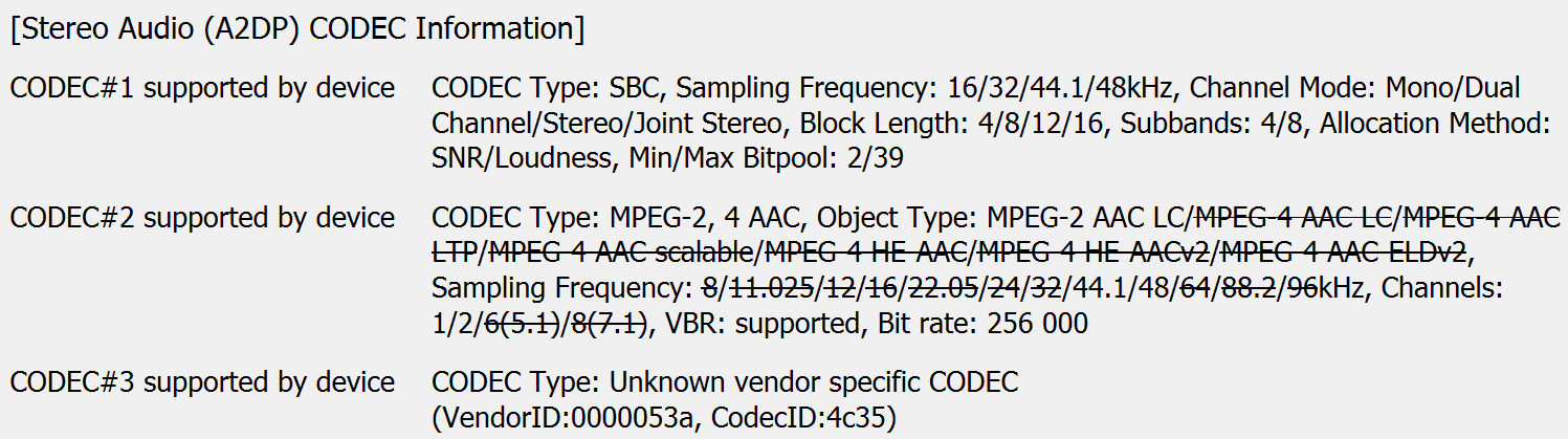 Ну а полный список поддерживаемых кодеков и их режимов мы, как обычно, получили с помощью утилиты Bluetooth Tweaker.