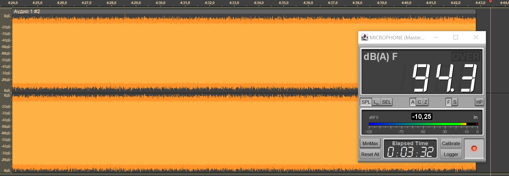 Безопасным уровнем звукового давления при прослушивании музыки считается 75 дБ, но на практике большинство слушателей предпочитает уровень 90-100 дБ. Мы транслируем в наушники белый шум, фиксируя уровень SPL в районе 95 дБ, сразу после старта воспроизведения запускаем запись сигнала с измерительного стенда — по длине получившегося трека легко понять, сколько проработал каждый из наушников.