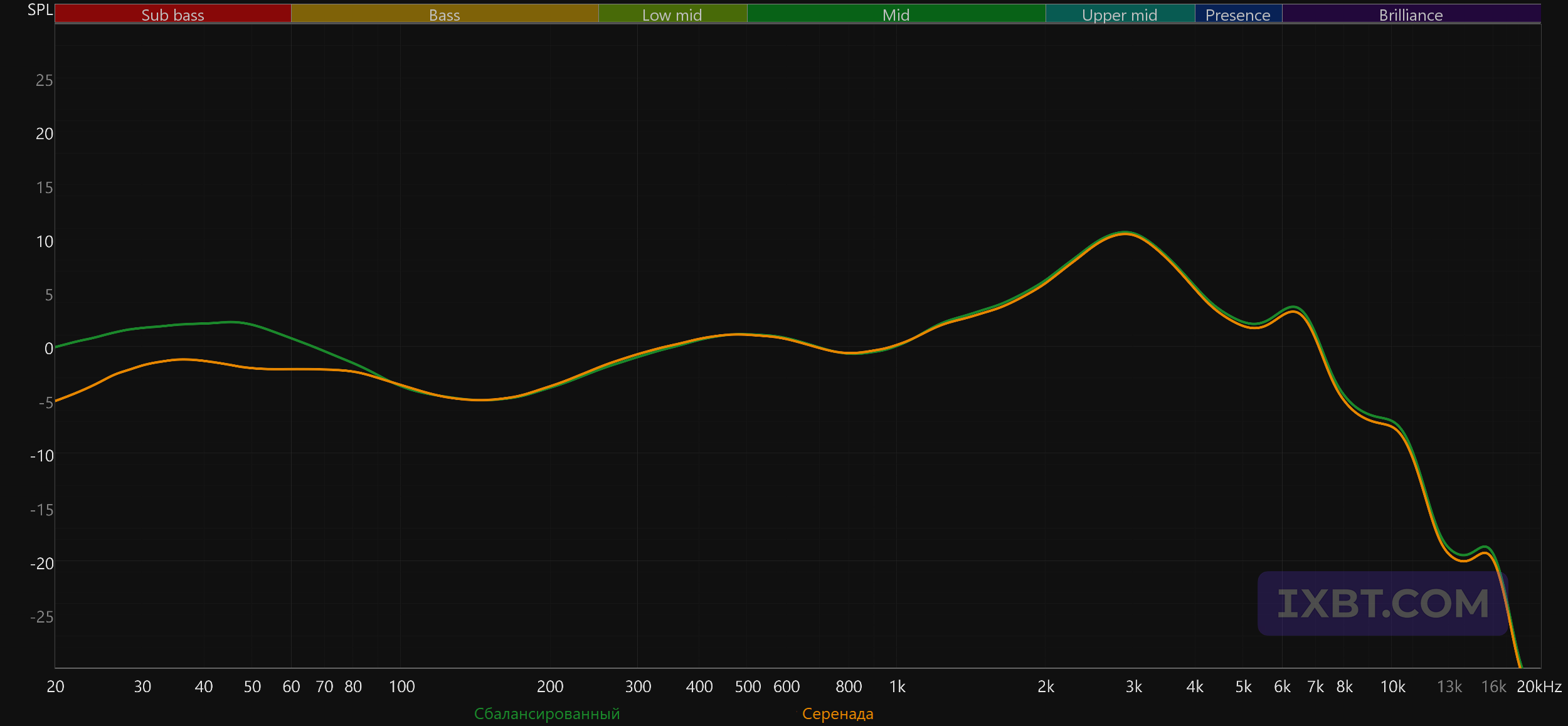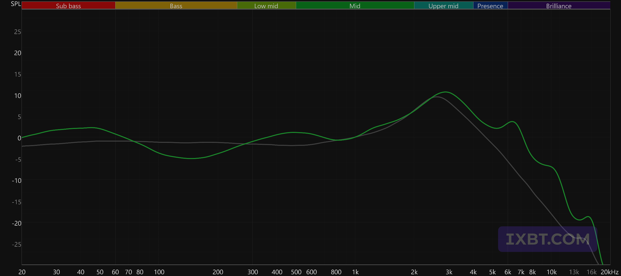 График выше показан на фоне кривой IDF (IEM diffuse field compensation), предоставленной производителем используемого стенда. Ее задача — помочь скомпенсировать резонансные явления в имитированном слуховом канале и особенности оборудования, создав «звуковой профиль», максимально корректно иллюстрирующий то, как звучание наушников воспринимается слушателем. Ее можно рассматривать как адаптированный под конкретное устройство аналог так называемой «кривой Хармана», созданной командой Harman International под руководством доктора Шона Олива. Скомпенсируем полученный график АЧХ в соответствии с кривой IDF. В таком виде он наиболее полно иллюстрирует субъективные впечатления от прослушивания, описанные выше.