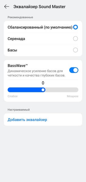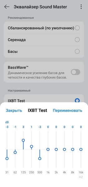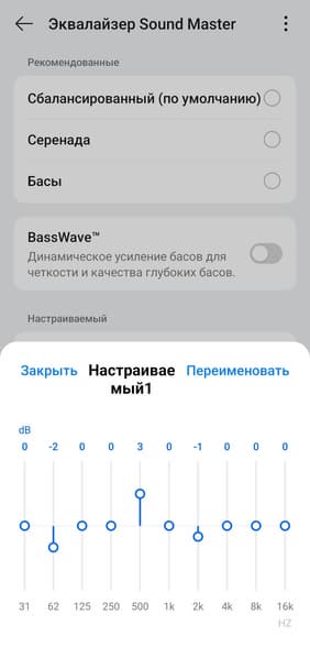 Регулятор BassWave, наоборот, работает крайне радикально, затрагивая не только бас, но и нижнюю середину. Обращаться с ним стоит поаккуратнее, но польза от него есть: например, в одно движение можно сделать звук более «серединистым» для прослушивания подкастов или аудиокниг, убрав ненужную в таком случае гулкость. Или, скажем, при фоновом прослушивании во время сна в самолете ослабить низкие частоты, которые в таком сценарии могут раздражать.