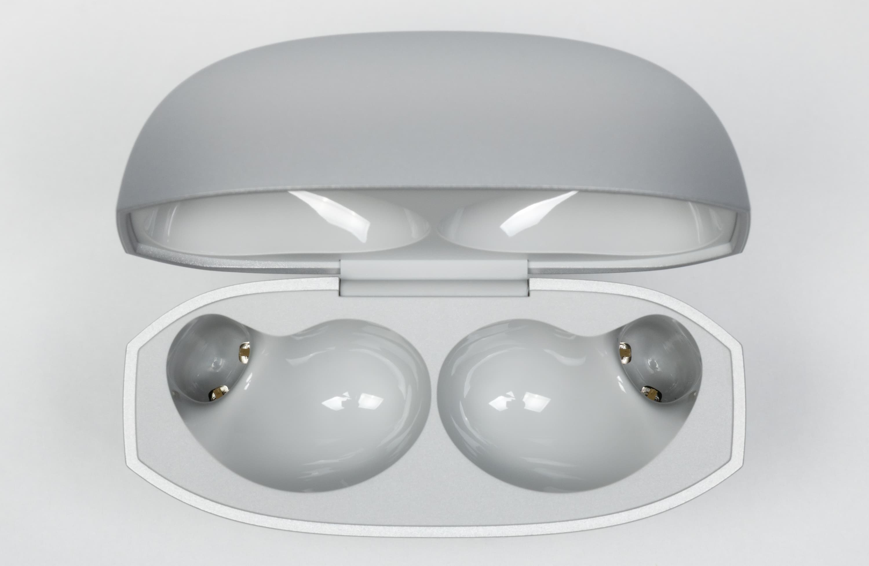 Внутри слотов для наушников видны подпружиненные контакты для зарядки. Сами посадочные места выполнены из глянцевого пластика — выглядит эффектно, но такой материал моментально собирает загрязнения, так что лишний раз его лучше не трогать.