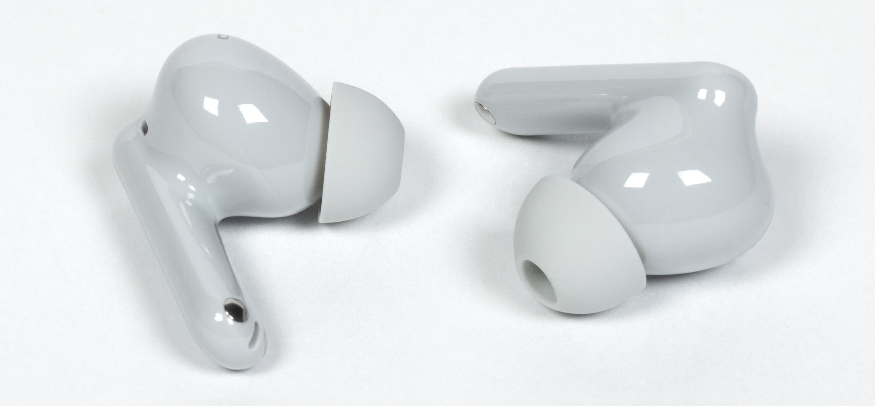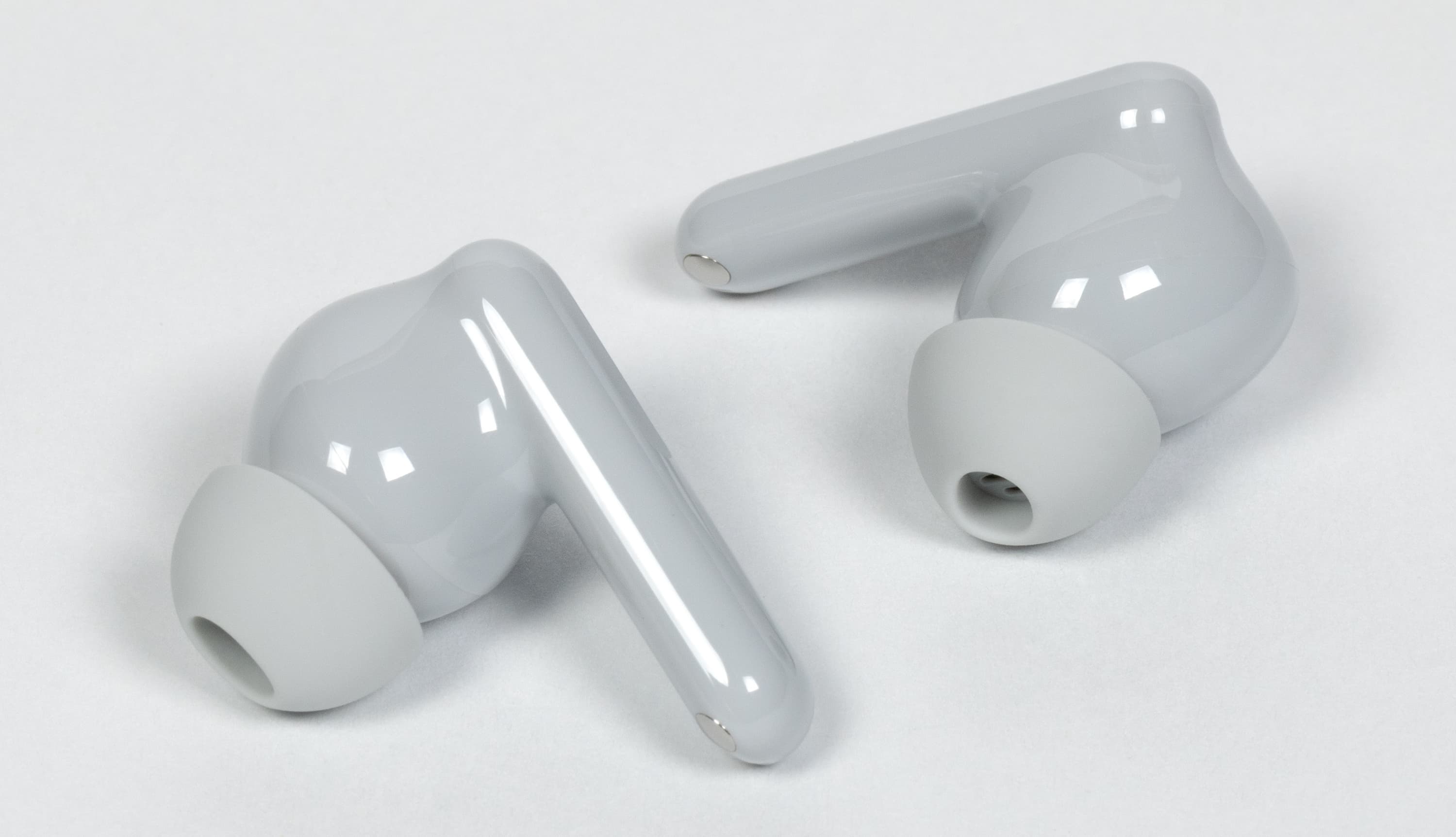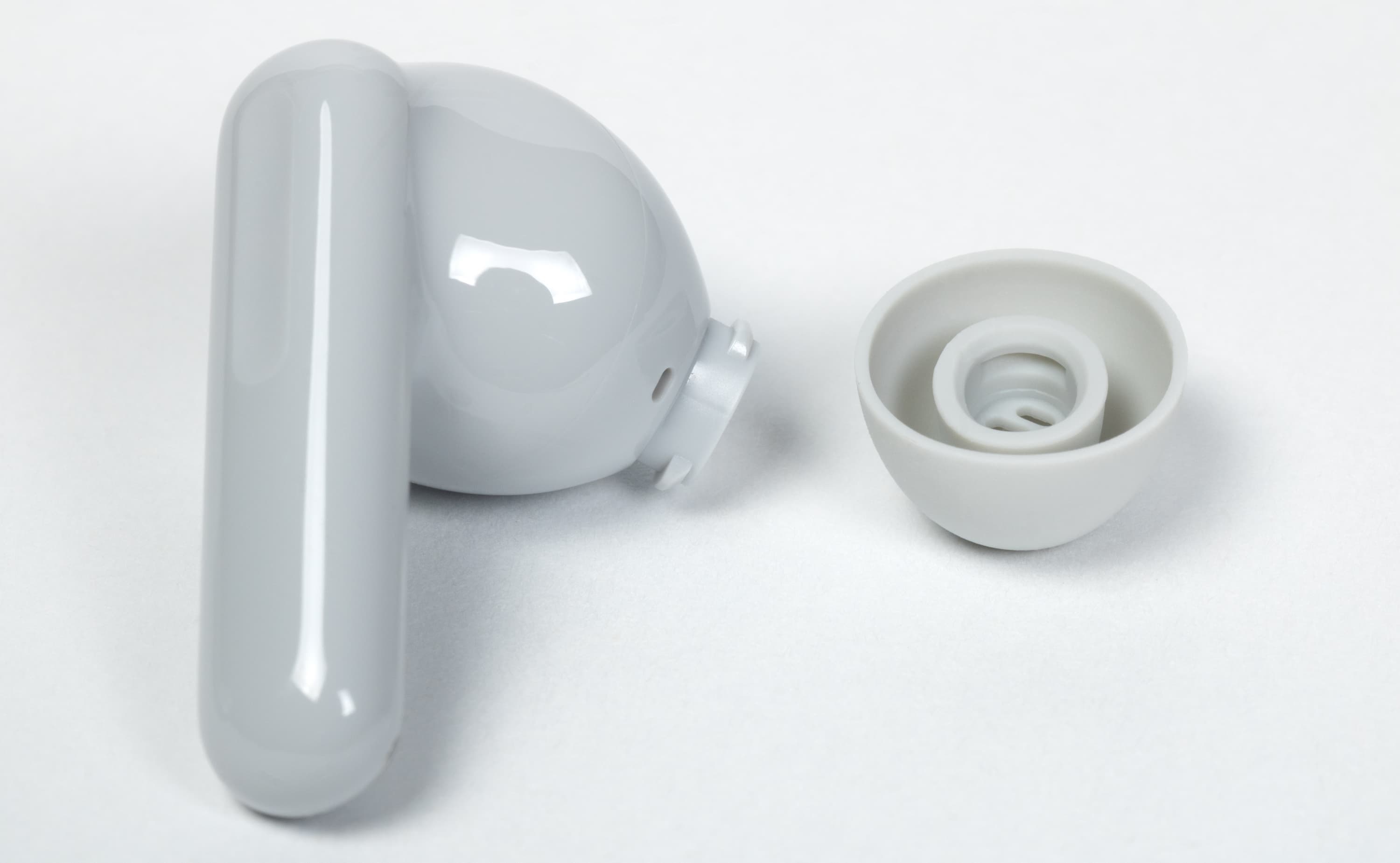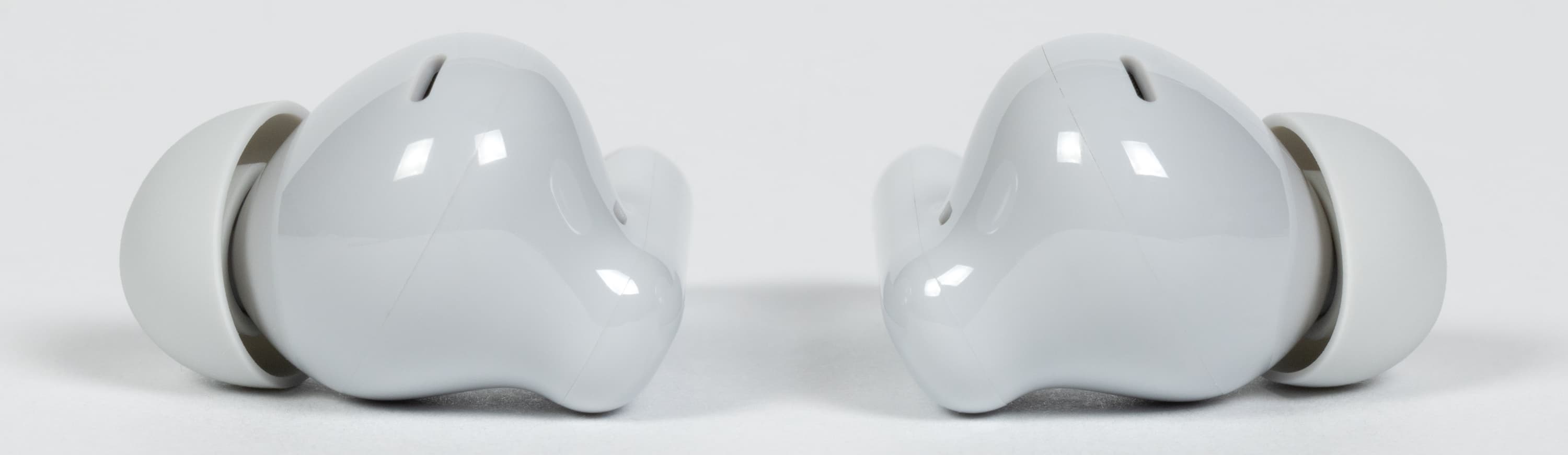 Форма у наушников в целом привычная: внутриканальная часть плюс выносная ножка. Они довольно легкие — всего 4,4 г. Производители давно соревнуются буквально за десятые доли грамма, но опыт подсказывает, что и они могут весьма заметно влиять на качество посадки.