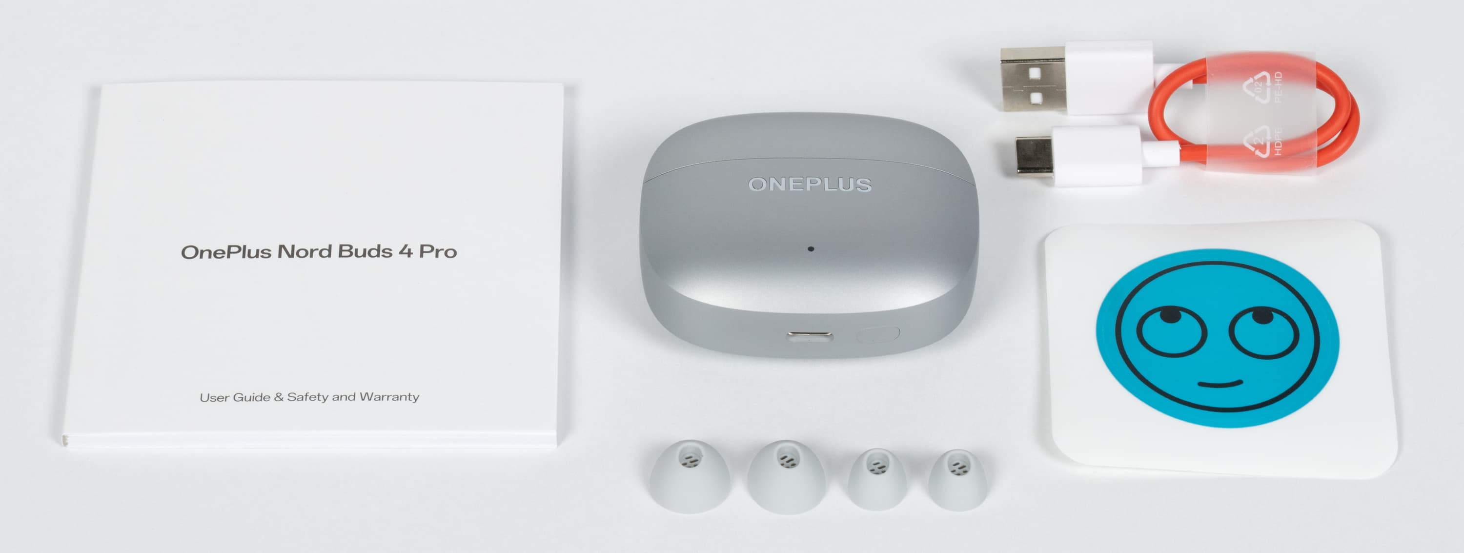 В комплект поставки входят наушники в кейсе, две пары силиконовых насадок (еще одна установлена по умолчанию), кабель USB-A — USB-C для зарядки, инструкция и сувенирная наклейка.