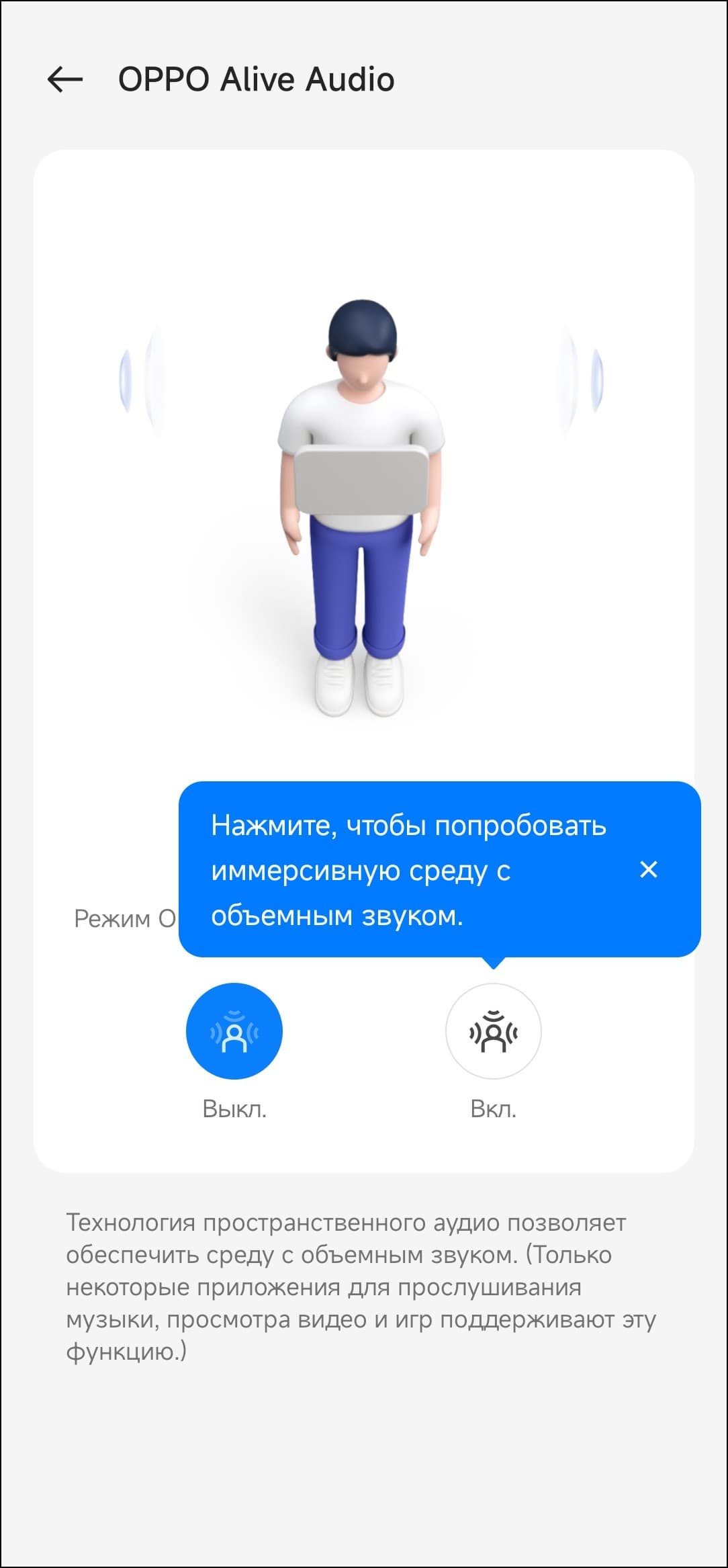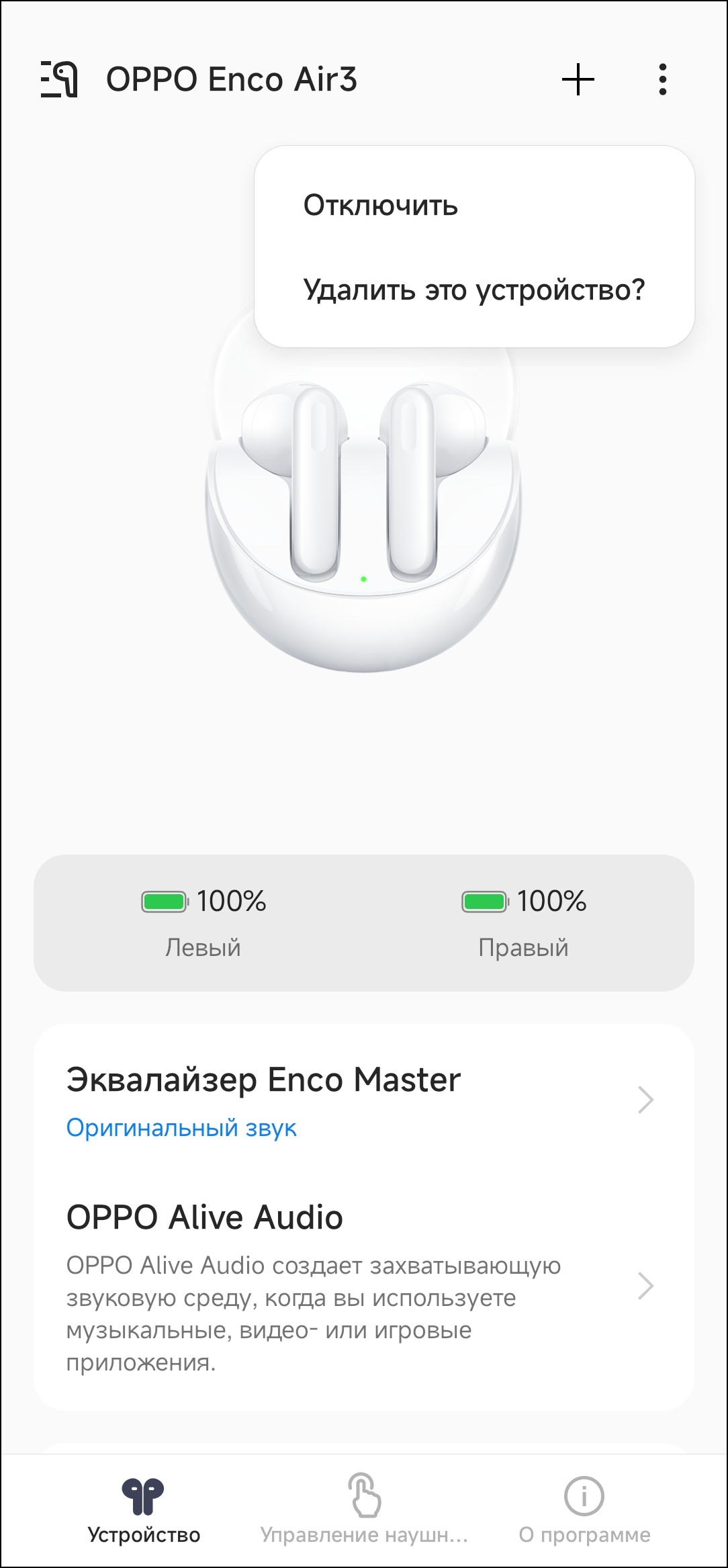 С главного экрана доступны выбор из трех пресетов эквалайзера и активация функции Alive Audio, предлагающей «объемный» звук в поддерживающих ее приложениях. Судя по тестовому контенту, она добавляет немного реверберации в звук, что действительно может создать иллюзию объема — в фильмах и играх можно попробовать, в музыке такое обычно звучит странно. Хотя некоторым слушателям может и понравиться — тут дело вкуса. Поэкспериментировать с этой функцией точно стоит — как-никак одна из главных «фишек» Enco Air3.