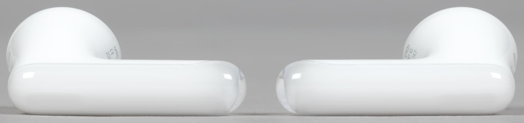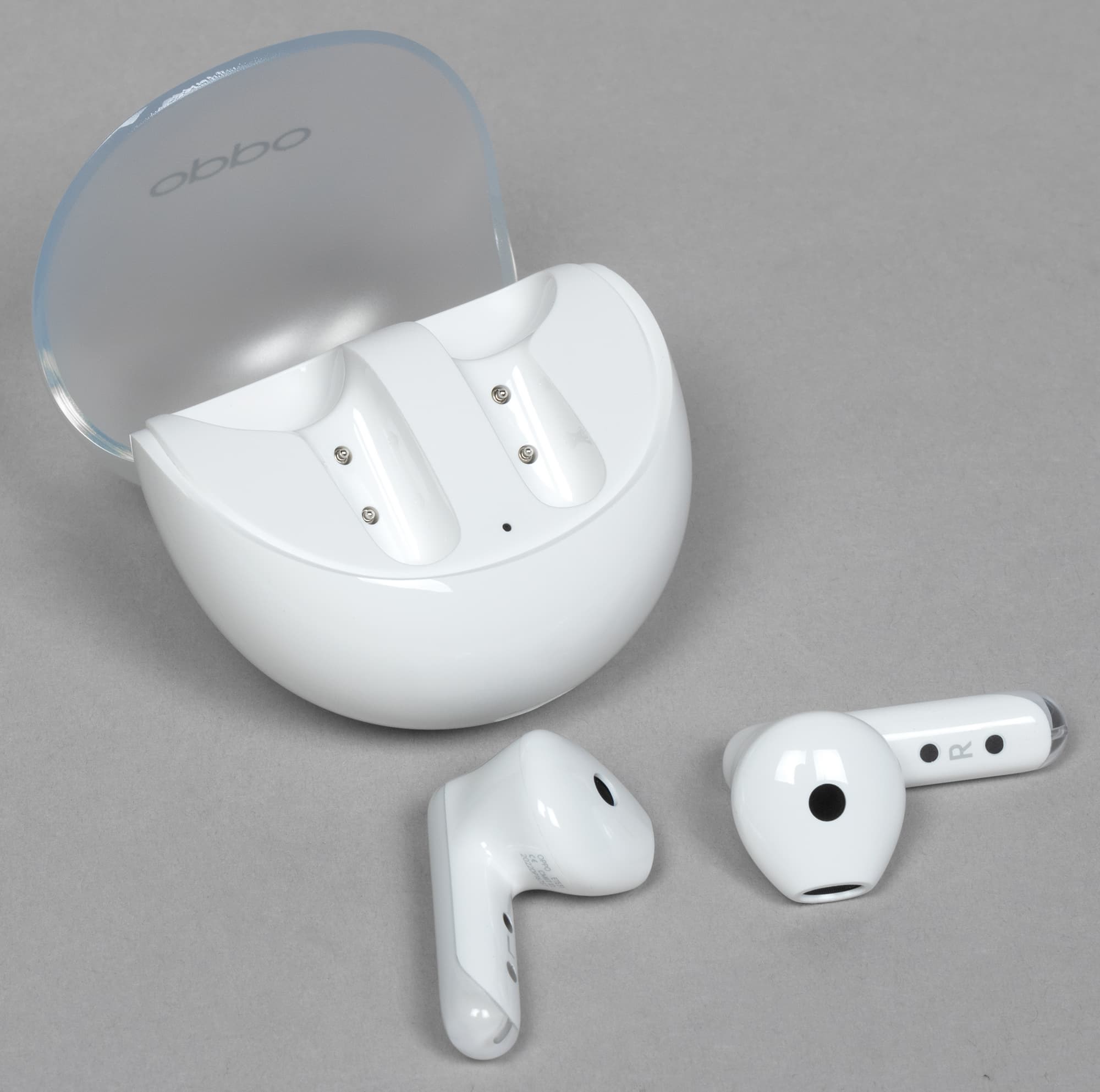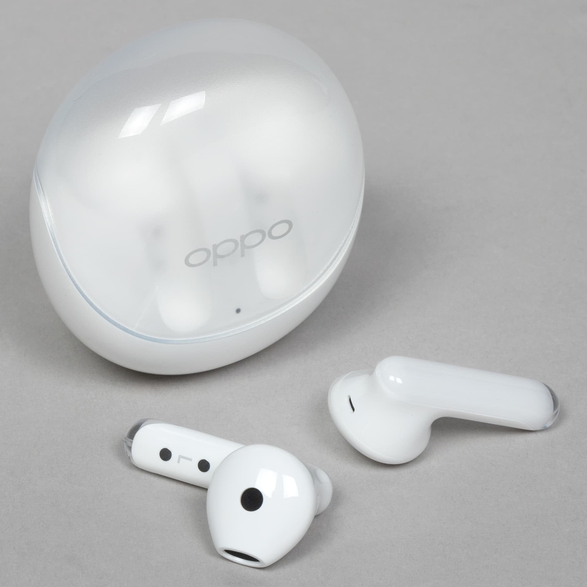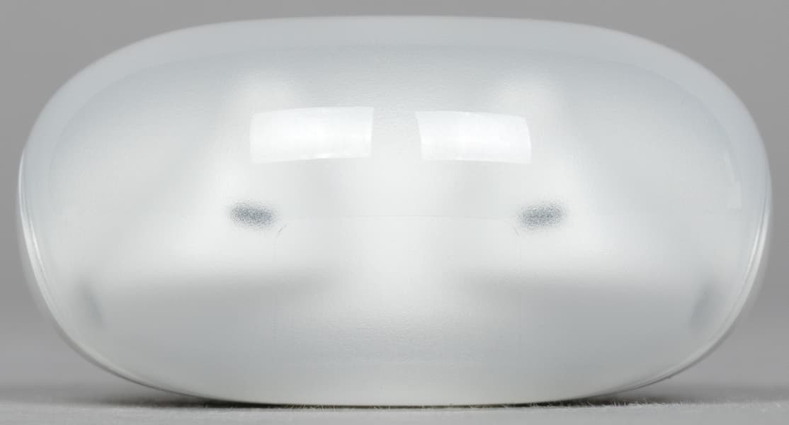 Крышка матовая, верхняя ее часть чуть менее прозрачна, чем боковая. Oppo Enco Air3 производится только в белом цвете, пластик используется глянцевый — пятна от прикосновений появляются легко, но на светлом фоне не очень заметны.