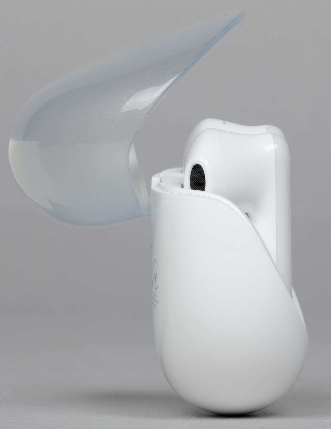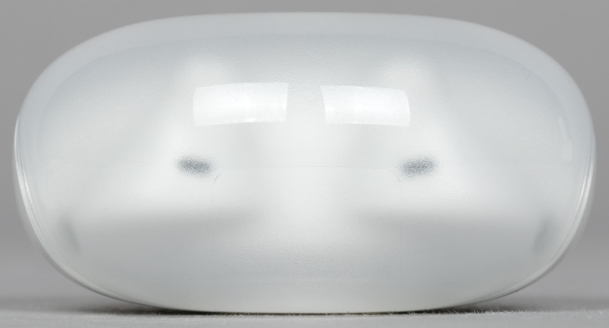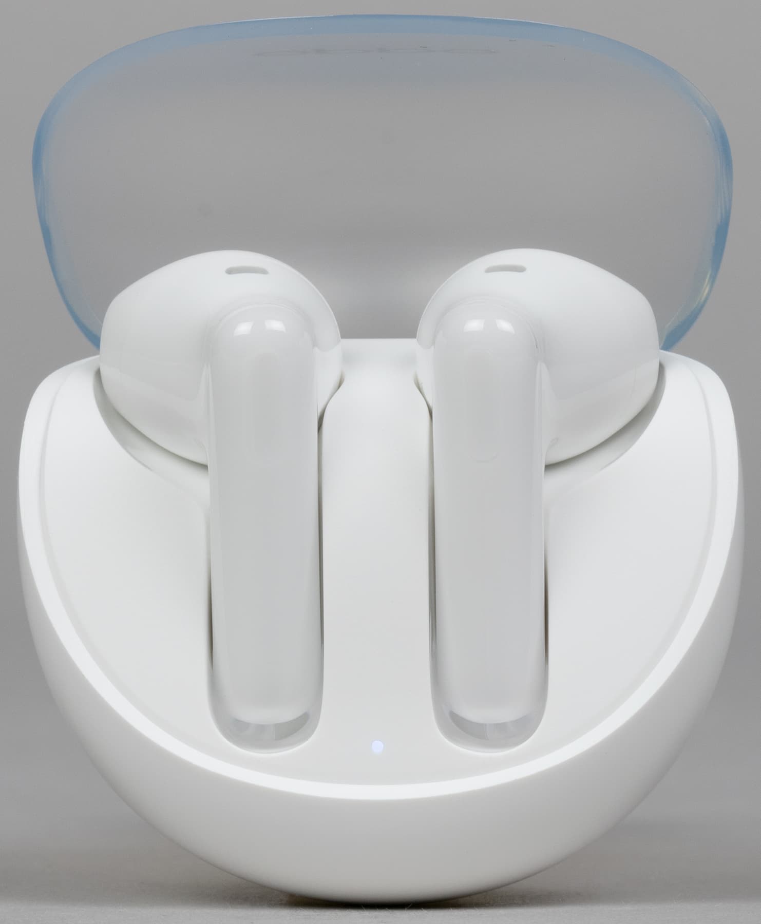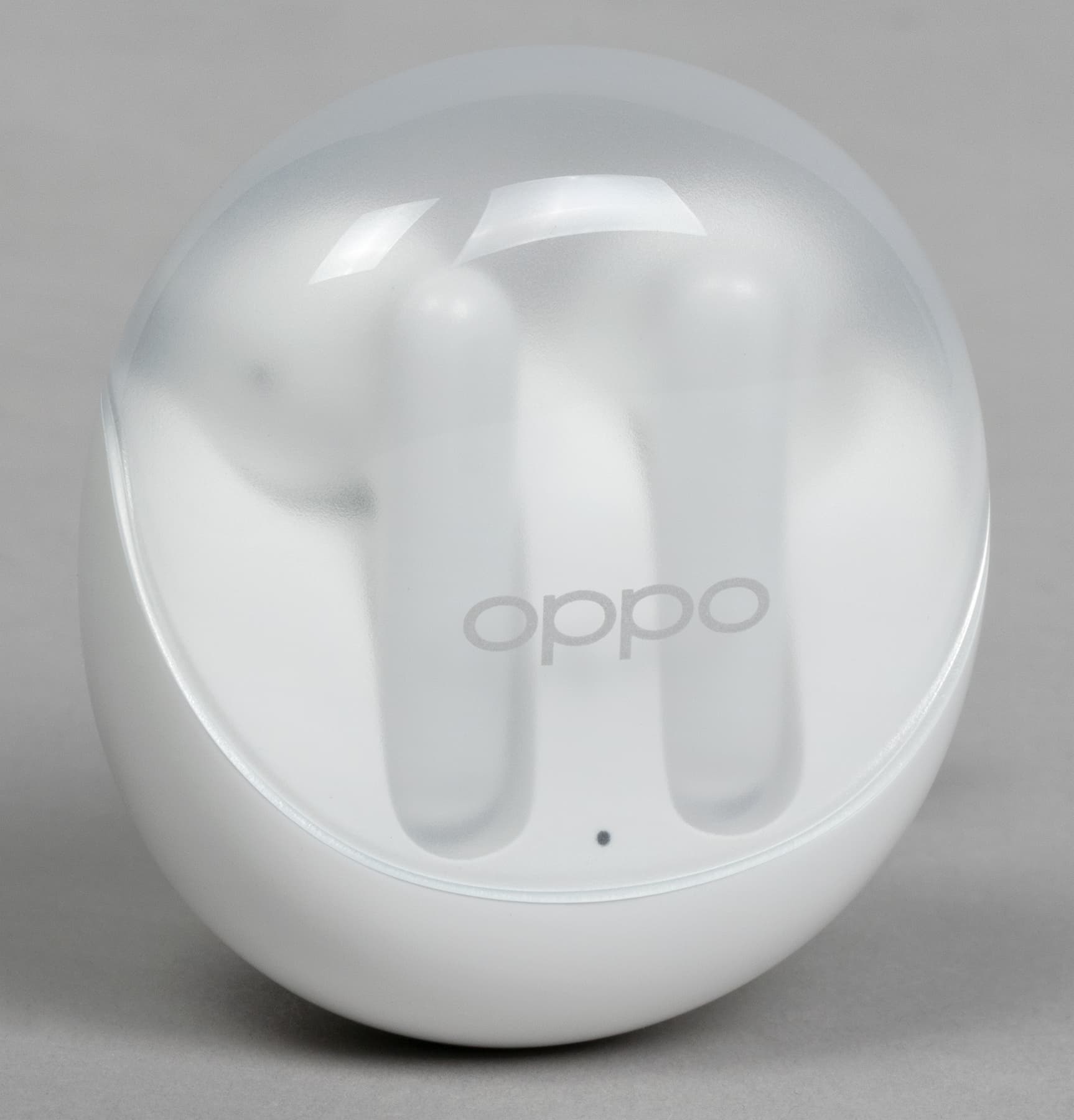 Крышка матовая, верхняя ее часть чуть менее прозрачна, чем боковая. Oppo Enco Air3 производится только в белом цвете, пластик используется глянцевый — пятна от прикосновений появляются легко, но на светлом фоне не очень заметны.