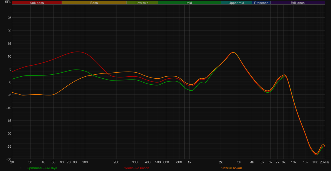 Пресет «усиление баса» действительно делает акцент на НЧ-диапазоне, но параллельно добавляет ему гулкости и снижает детализацию середины — убежденным «бассхедам» подойдет, но в целом ощущается не очень органично. «Четкий вокал» предсказуемо выделяет середину, но сильно уводит назад НЧ-регистр. Для музыки это не очень хорошо, а вот в подкастах пригождается — воспринимать речь становится ощутимо проще и приятнее.