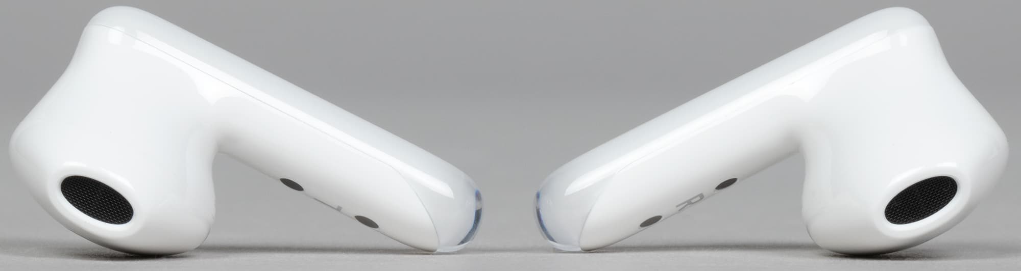 Между контактами нанесены обозначения правого и левого наушников. Округлая часть имеет симметричную каплевидную форму.