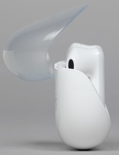 При этом при взгляде сверху хорошо заметно, что в целом форма округлой части не так проста, как может показаться на первый взгляд. В частности, носик звуковода имеет изгиб, обеспечивающий более плотный контакт с ушным проходом.