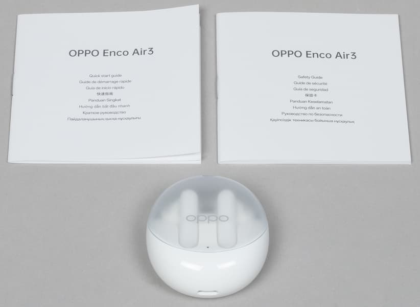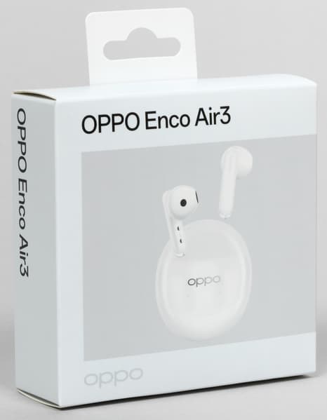 Поставляются Oppo Enco Air3 в коробке из картона средней плотности, на которую нанесены изображения устройства и его описания. Внутри кейс с наушниками удерживается с помощью пластикового ложемента.