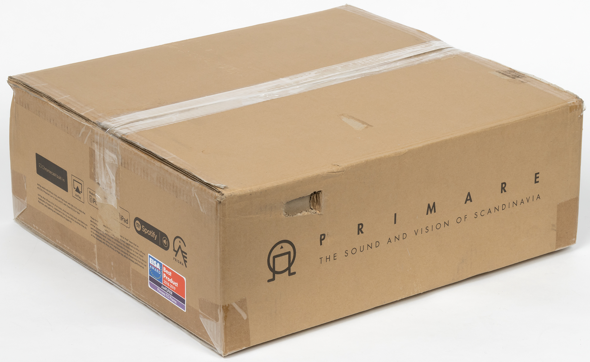 Поставляется усилитель в скромной картонной коробке с нанесенными на нее логотипом производителя, краткими характеристиками и значками используемых технологий.