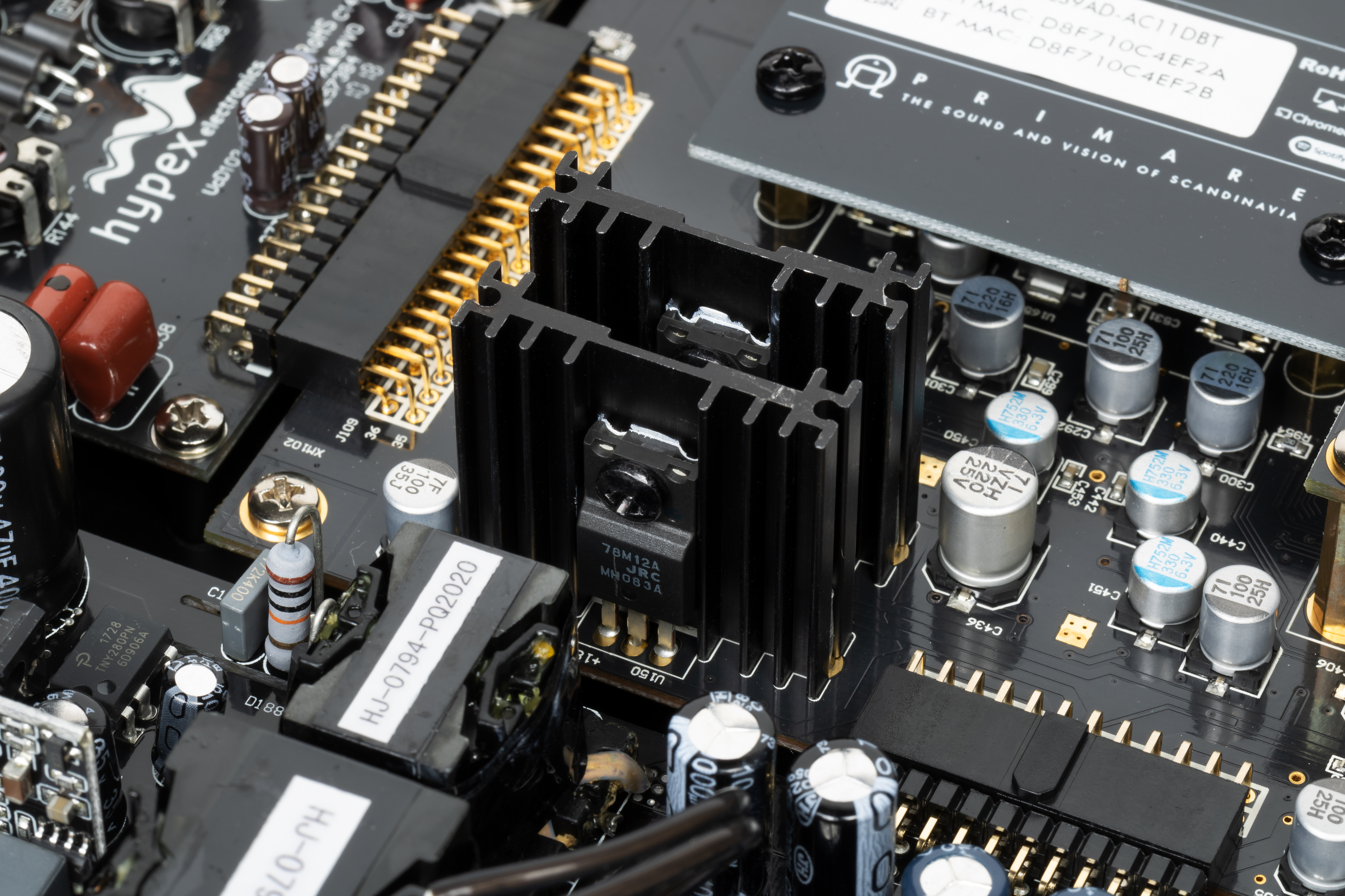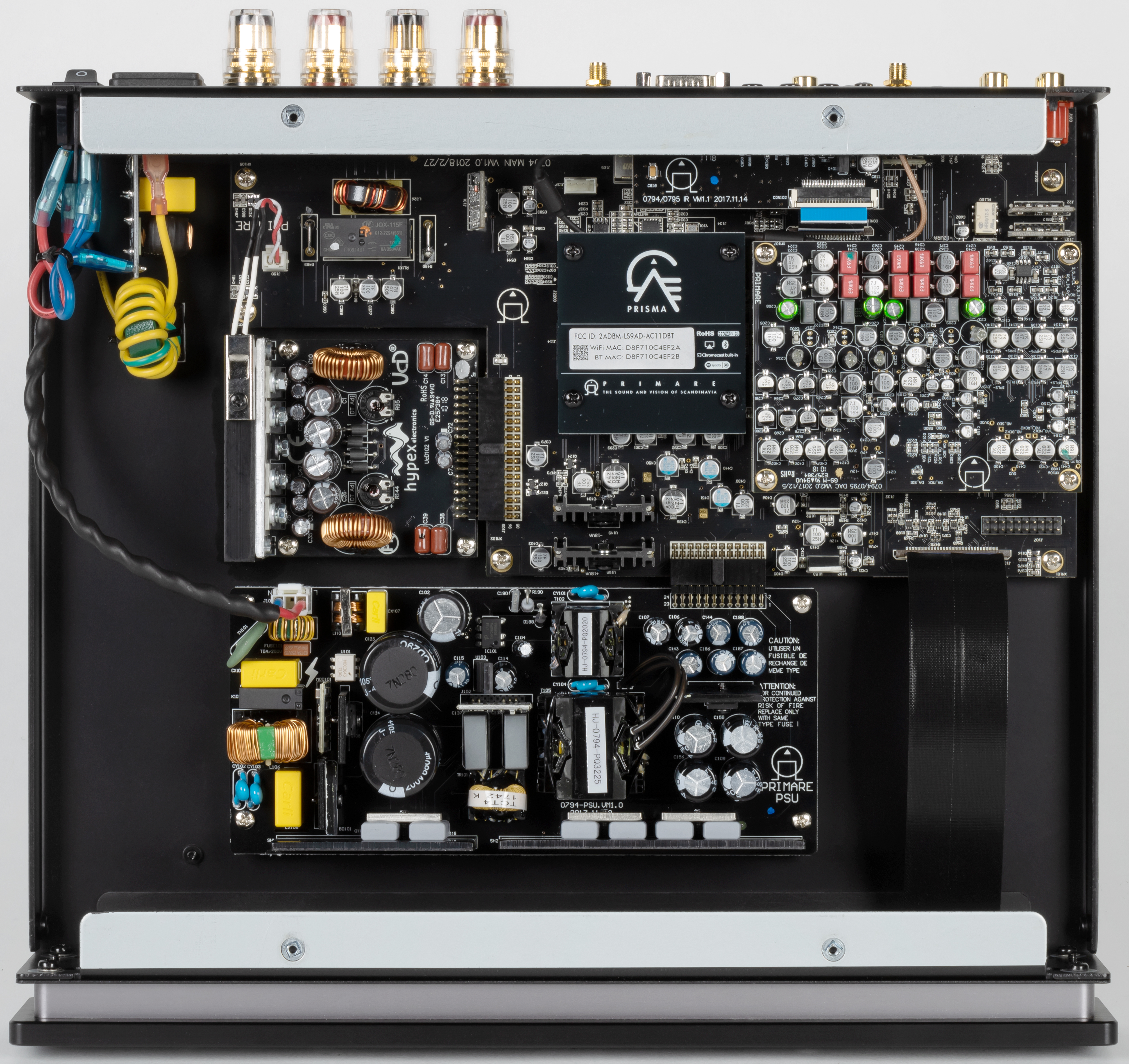 Для начала посмотрим на платы сверху, чтобы представить общую картину. А потом немного поговорим про различные компоненты. Сразу отметим секцию усиления UCD102 голландской компании Hypex, продукты которой в последнее время стали чуть ли не «индустриальным стандартом» для высококлассной аудиотехники.