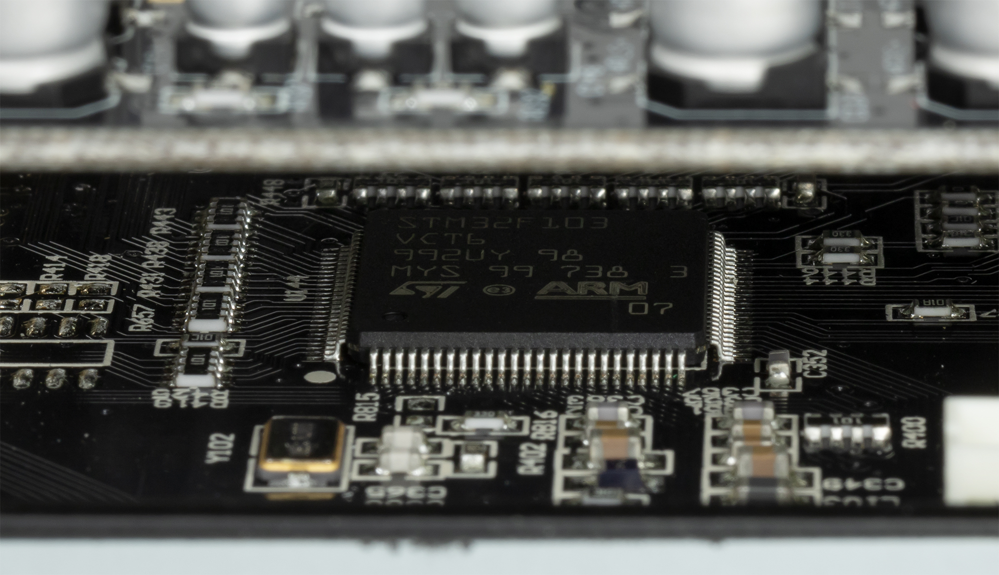 Заглянув под первый уровень блока, видим ARM-микроконтроллер STM32F103VCT6, также знакомый нам по NP5 Prisma.