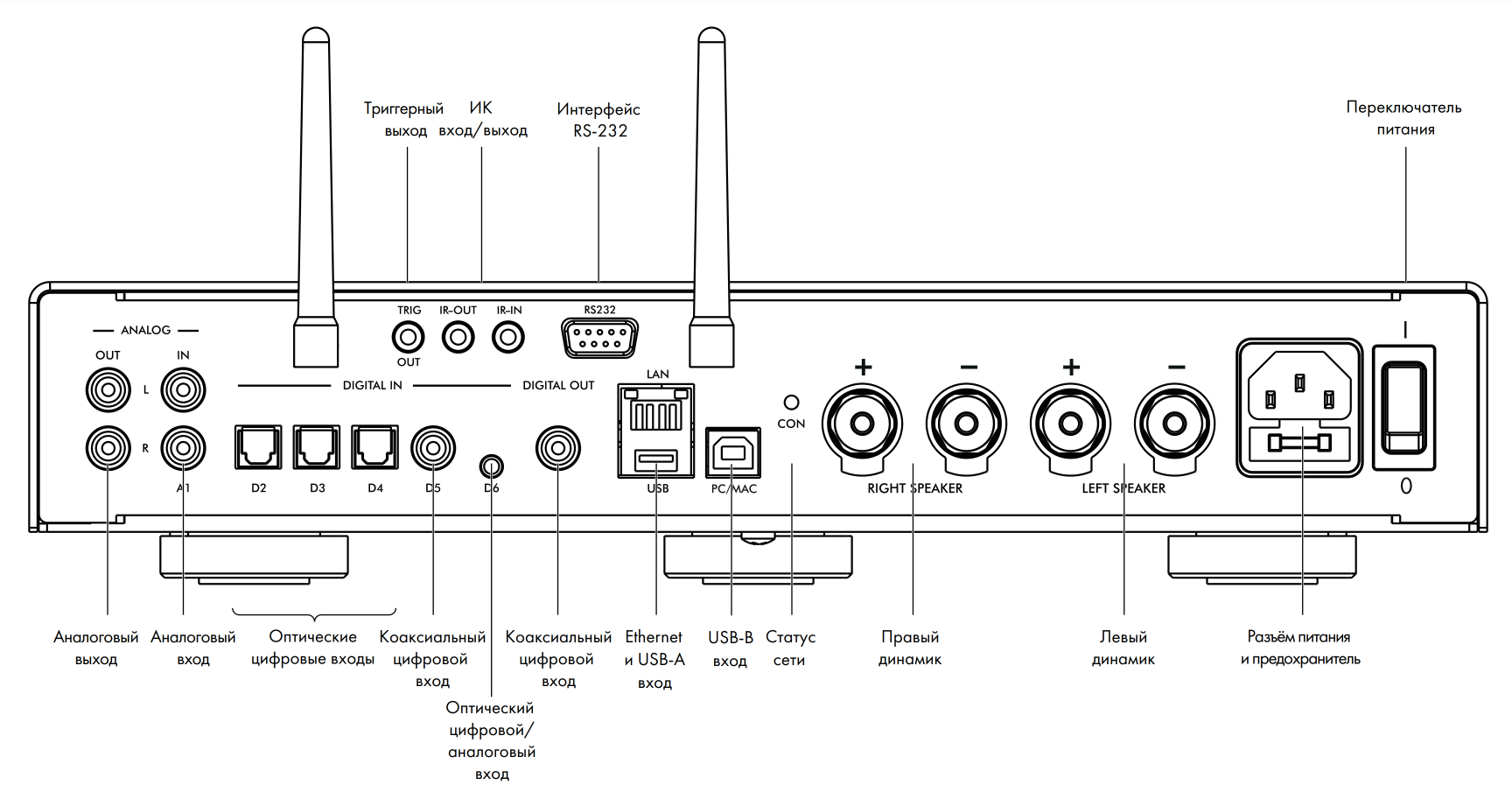 Для описания содержимого задней панели просто воспользуемся иллюстрацией из инструкции, где каждый разъем наглядно показан и подписан.