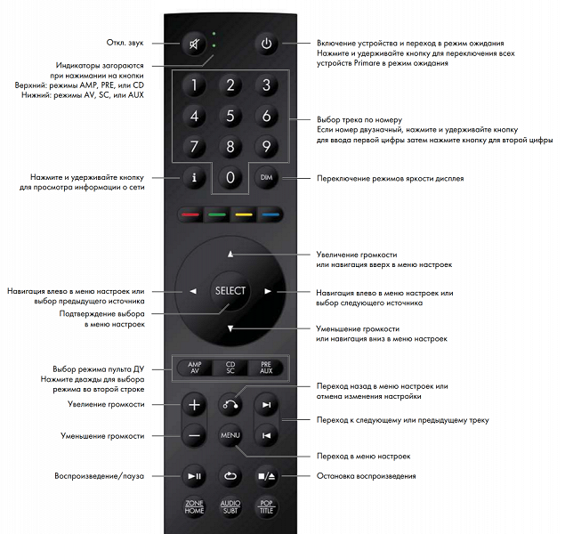 Управление Primare I15 Prisma может осуществляться как с помощью приложения, так и посредством кнопок на передней панели или пульта ДУ. С клавишами на панели мы разобрались чуть выше — благо, их там немного. А вот с пультом все гораздо интереснее. Чтобы не вдаваться в долгие описания, вновь воспользуемся картинкой из инструкции: