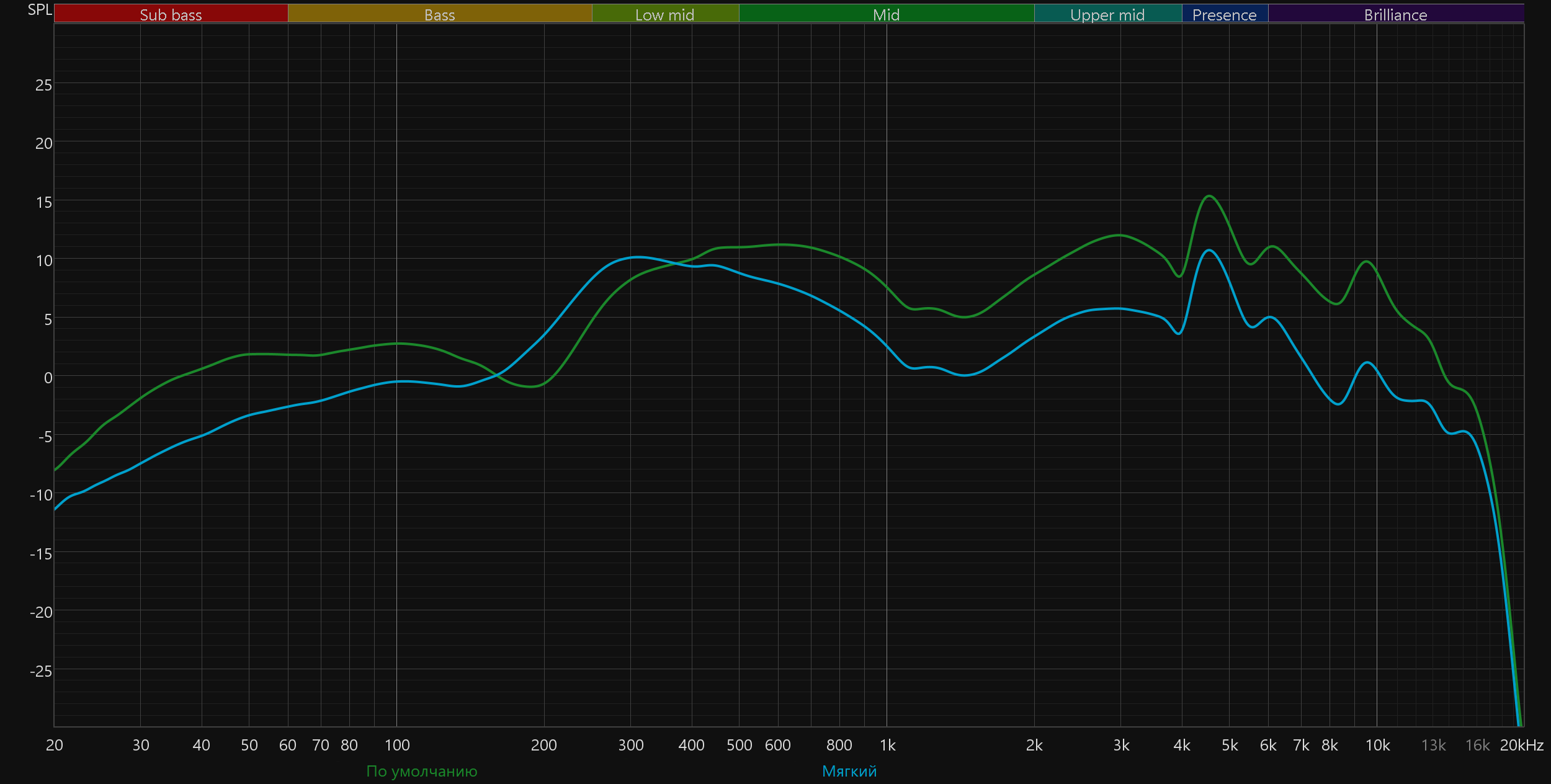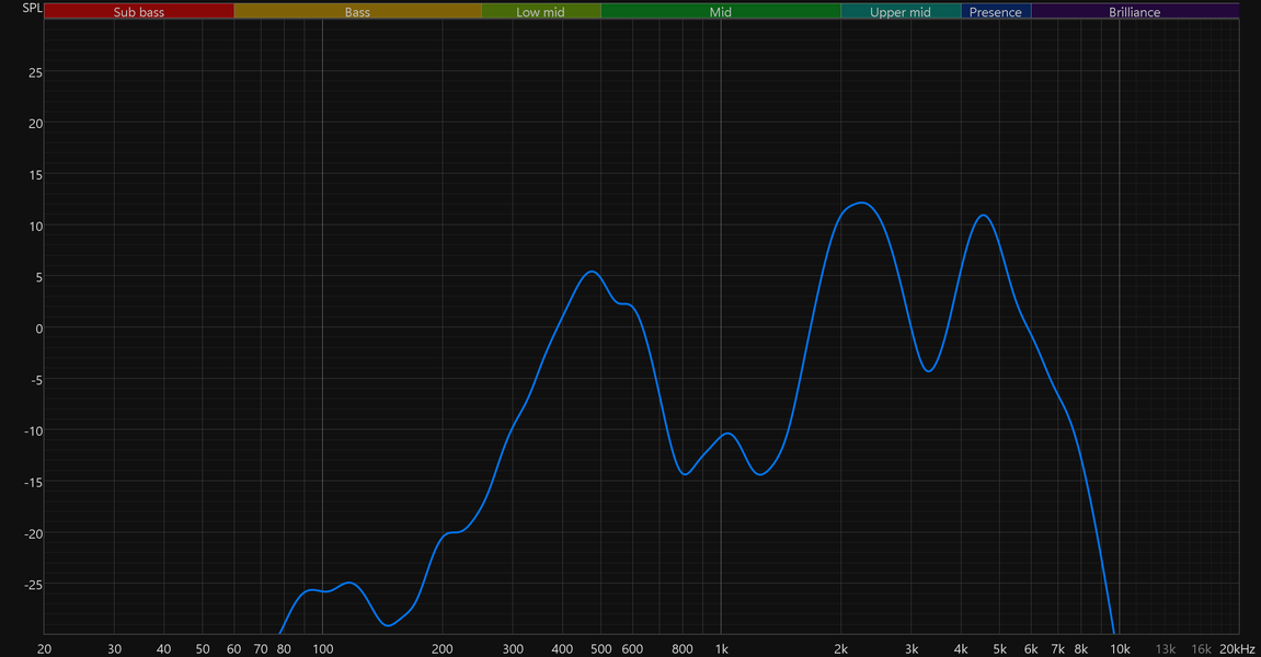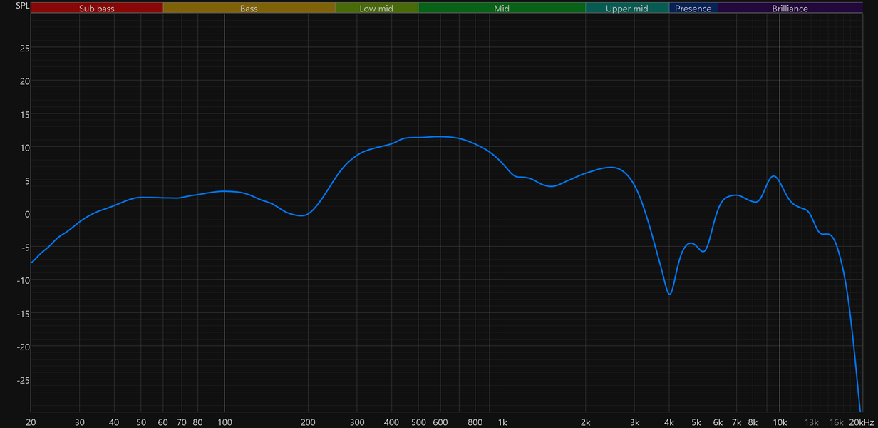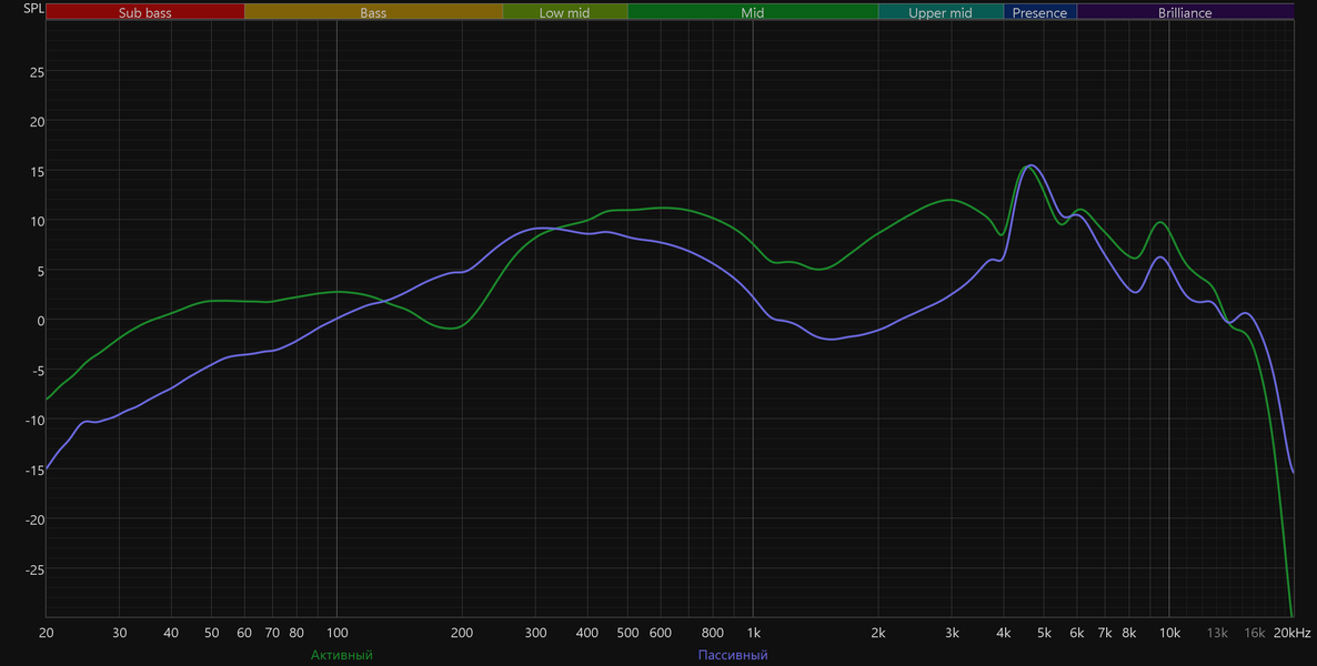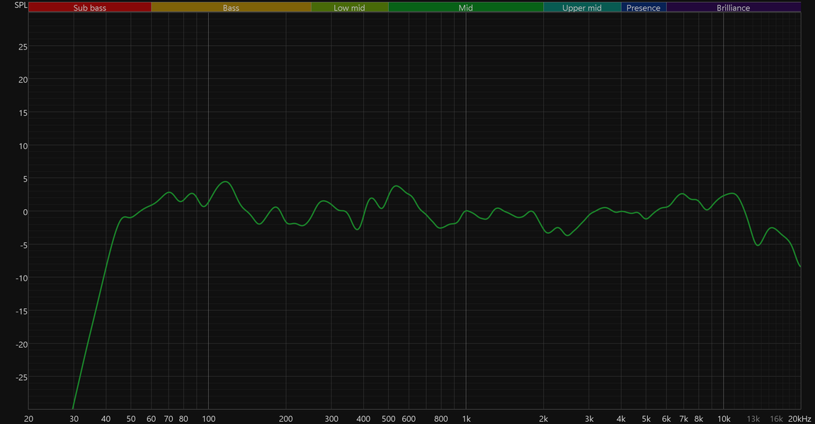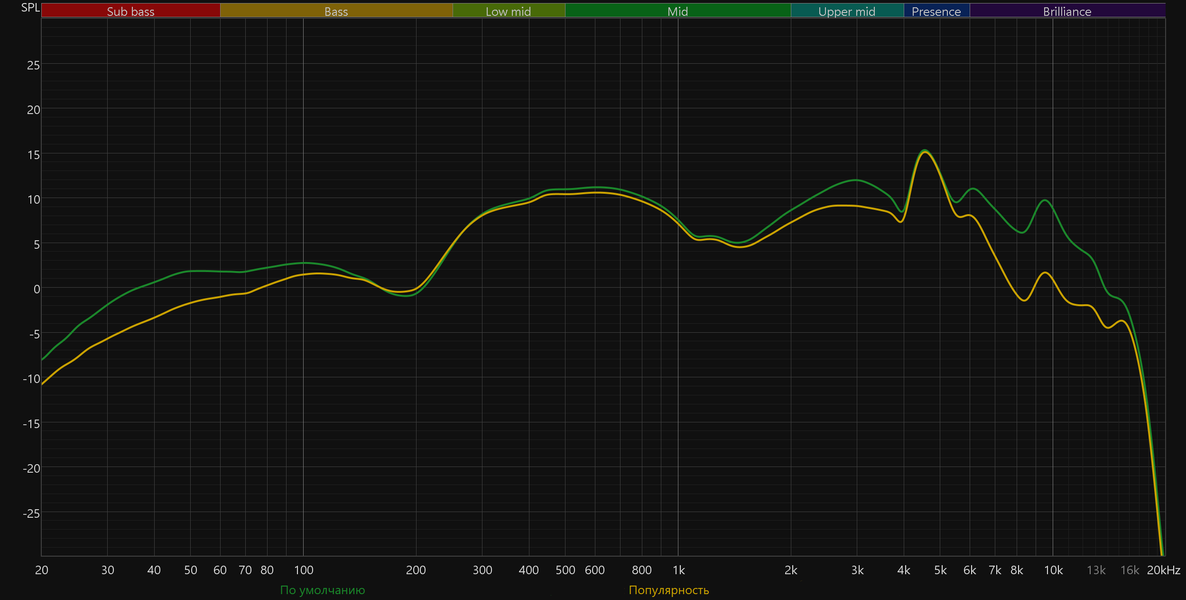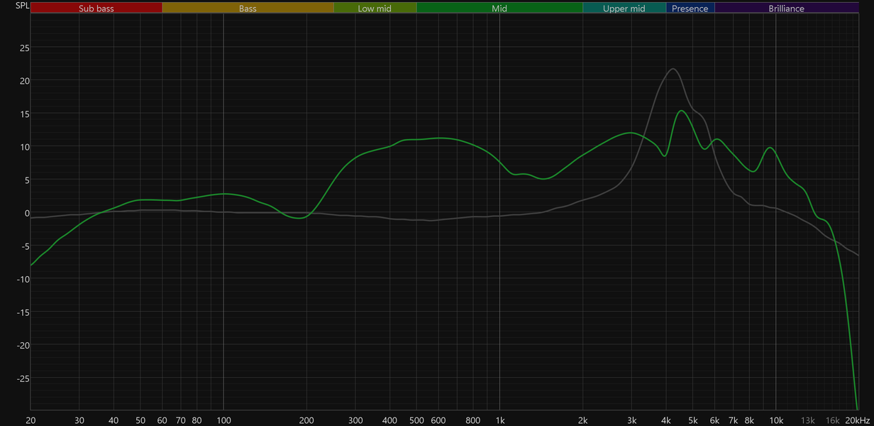 График АЧХ выше показан на фоне целевой кривой, предоставленной производителем используемого стенда. Она является адаптированным под конкретное устройство аналогом так называемой «кривой Хармана», созданной командой Harman International под руководством доктора Шона Олива. Люди неодинаково воспринимают звук разной частоты, поэтому даже самые точные измерения могут не соответствовать реальному пользовательскому опыту. Для компенсации этих различий и используется целевая АЧХ. Близкое к ней звучание оценивалось сотнями участников экспериментов как нейтральное, сбалансированное, естественное и так далее. Скомпенсируем полученный график АЧХ в соответствии с целевой кривой.