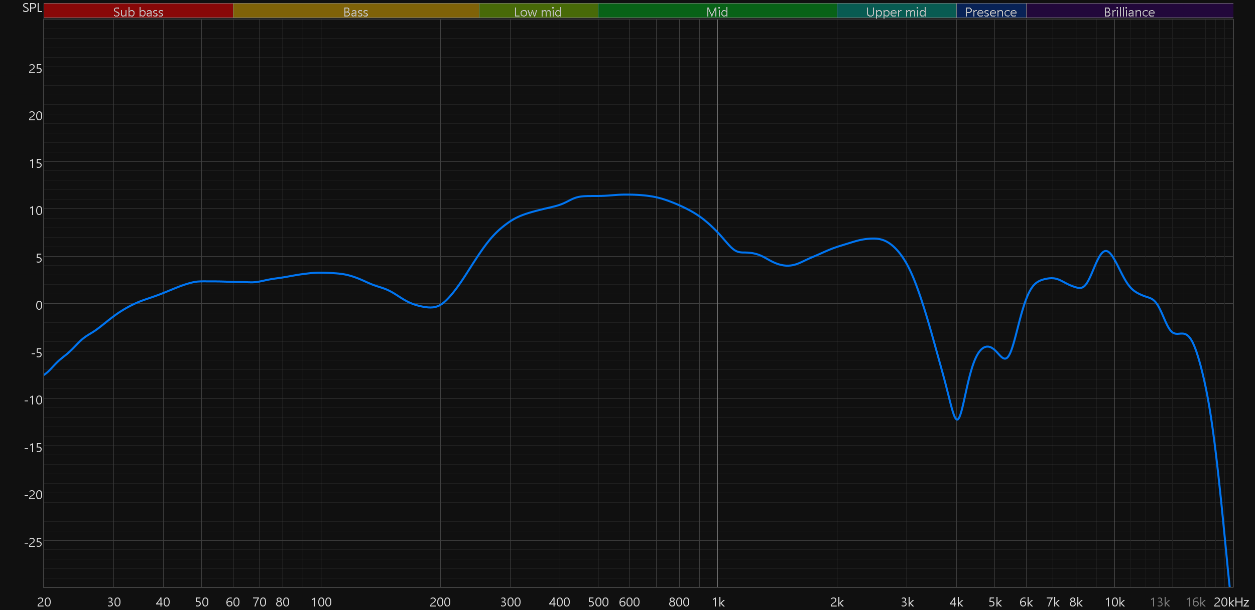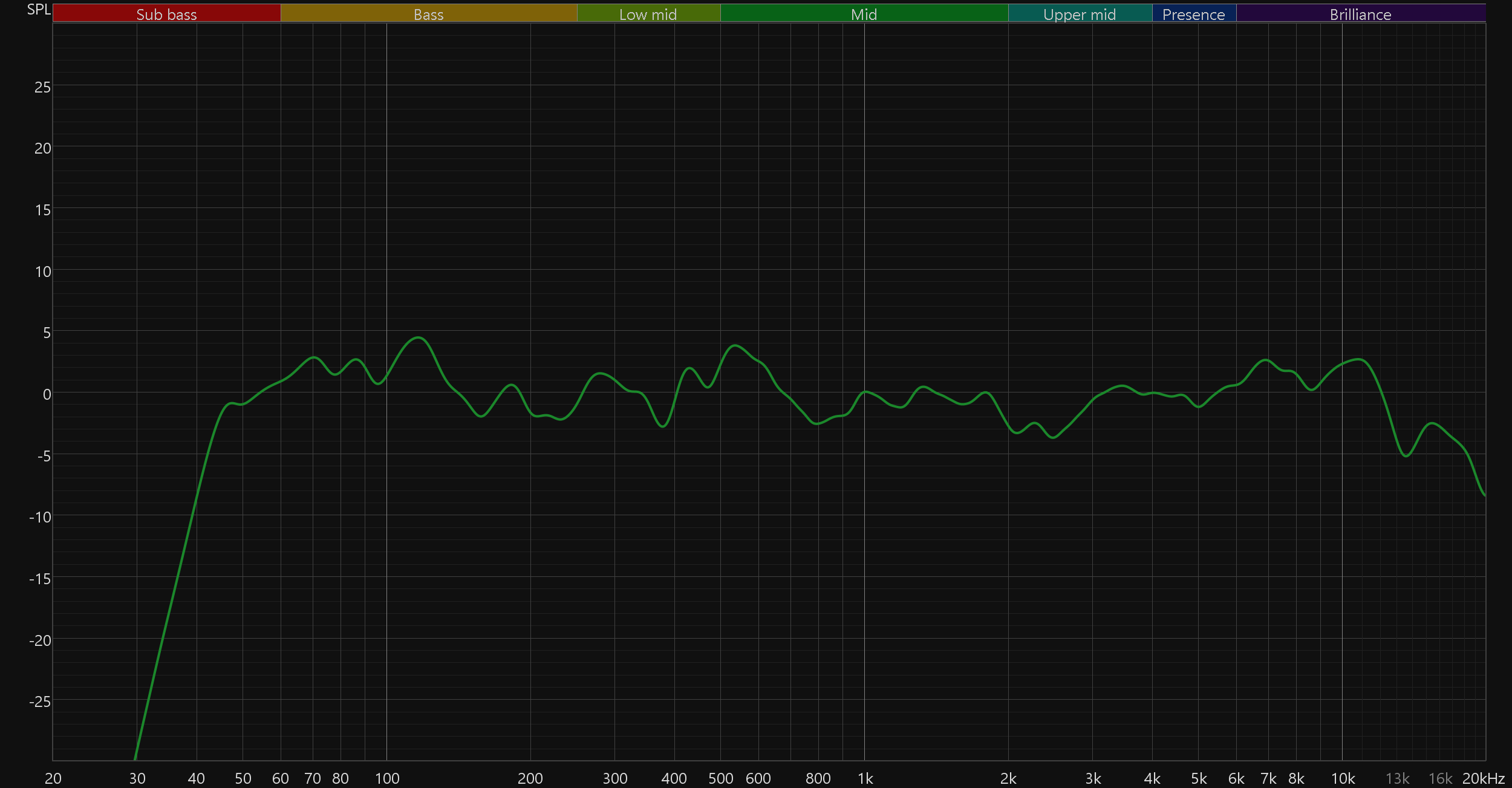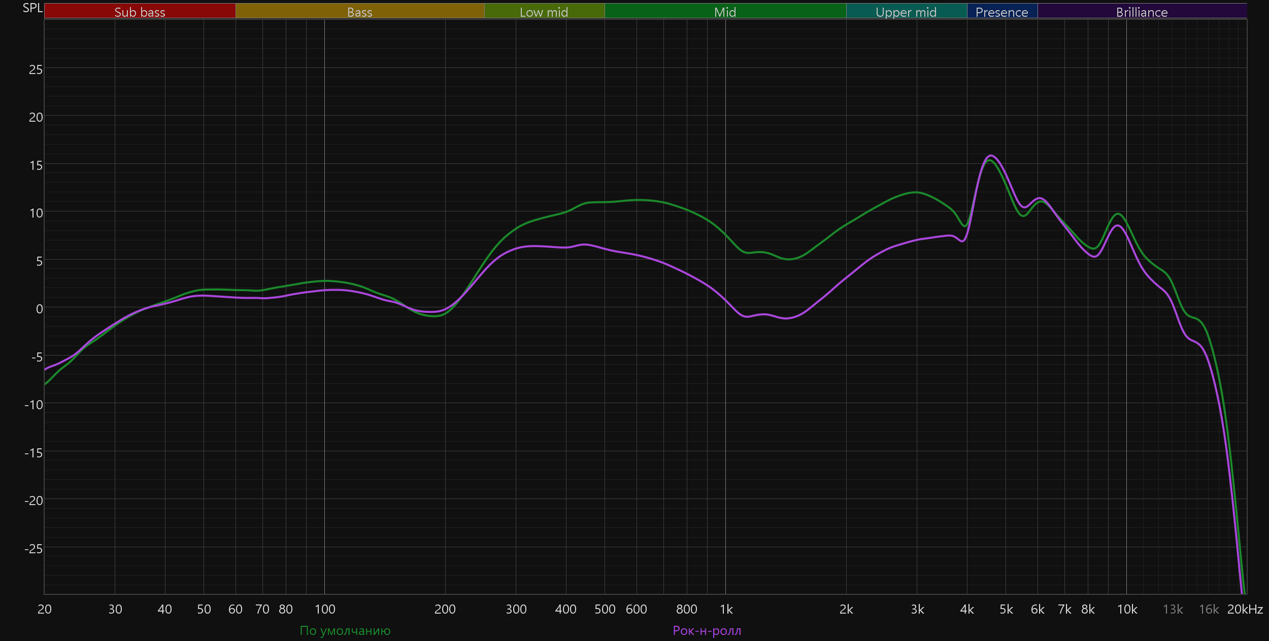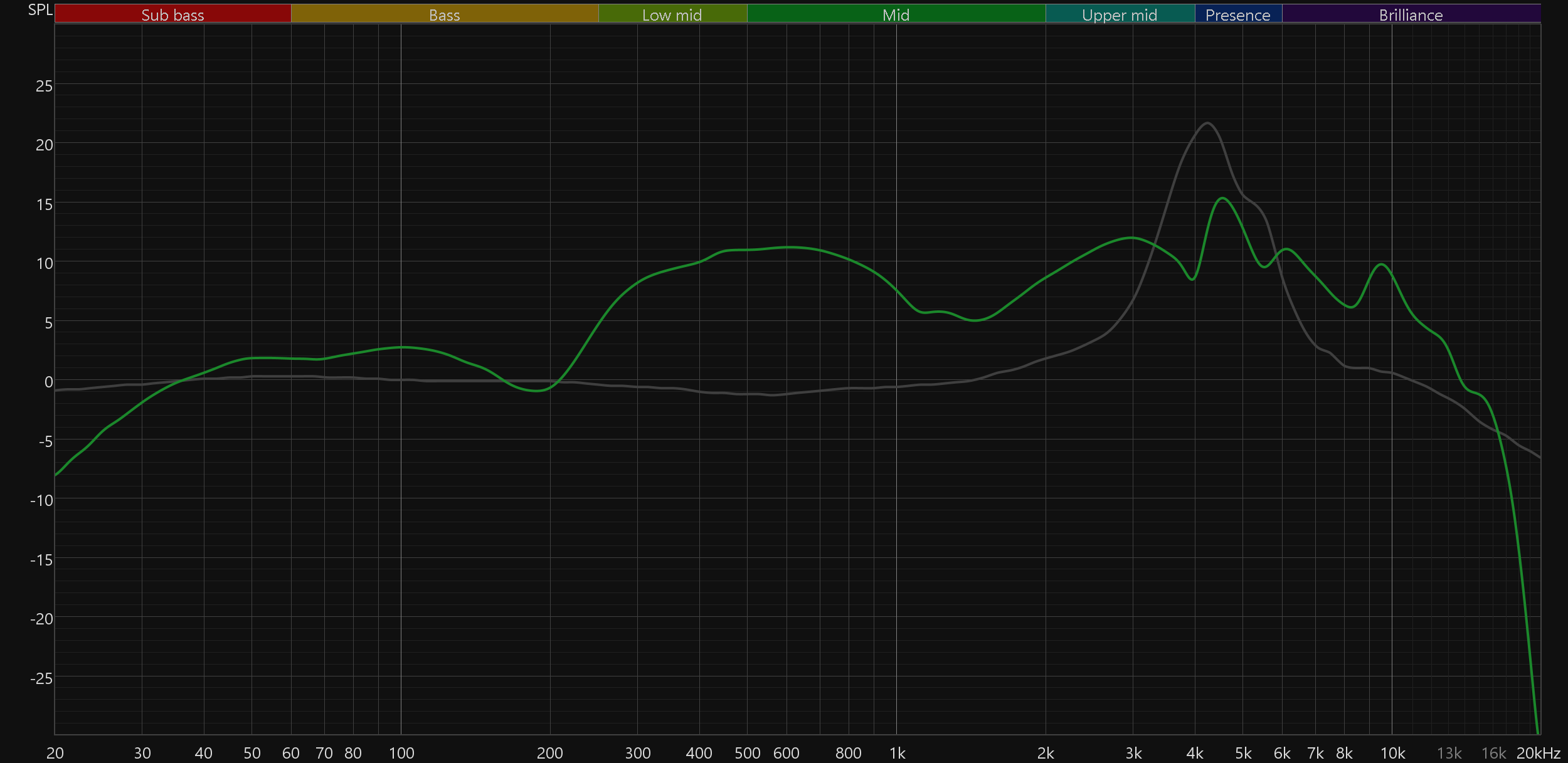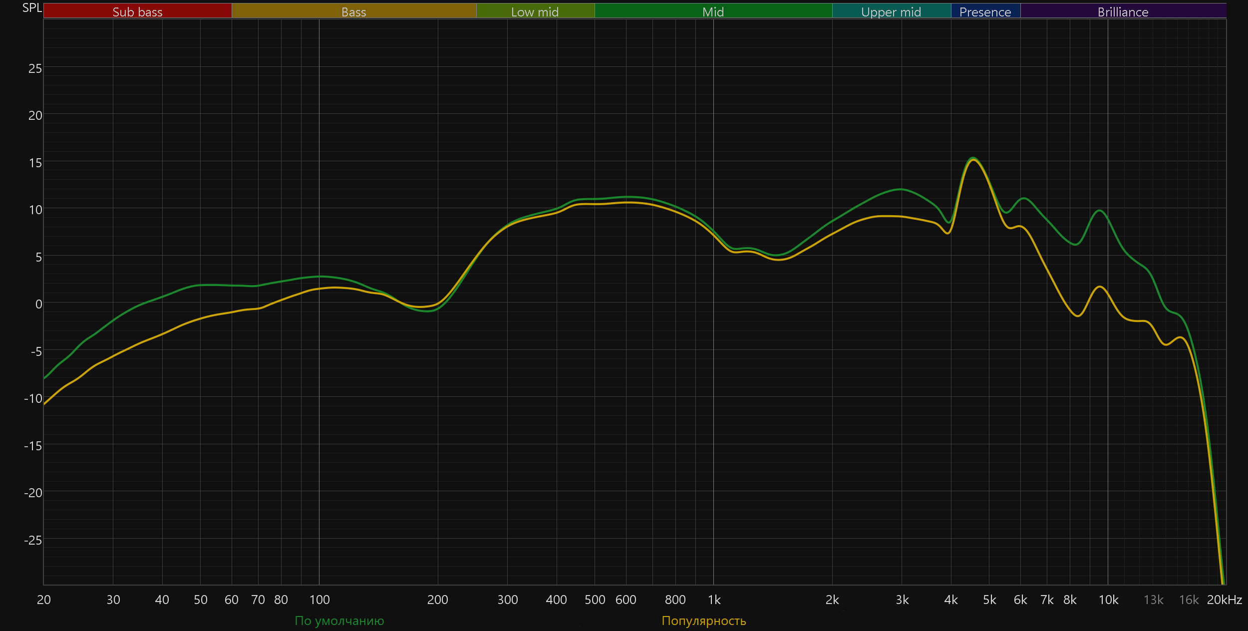 График АЧХ выше показан на фоне целевой кривой, предоставленной производителем используемого стенда. Она является адаптированным под конкретное устройство аналогом так называемой «кривой Хармана», созданной командой Harman International под руководством доктора Шона Олива. Люди неодинаково воспринимают звук разной частоты, поэтому даже самые точные измерения могут не соответствовать реальному пользовательскому опыту. Для компенсации этих различий и используется целевая АЧХ. Близкое к ней звучание оценивалось сотнями участников экспериментов как нейтральное, сбалансированное, естественное и так далее. Скомпенсируем полученный график АЧХ в соответствии с целевой кривой.