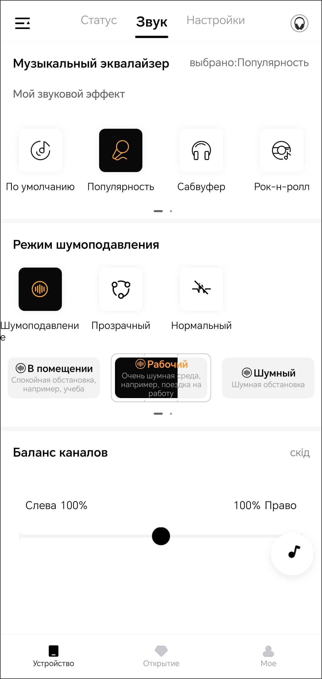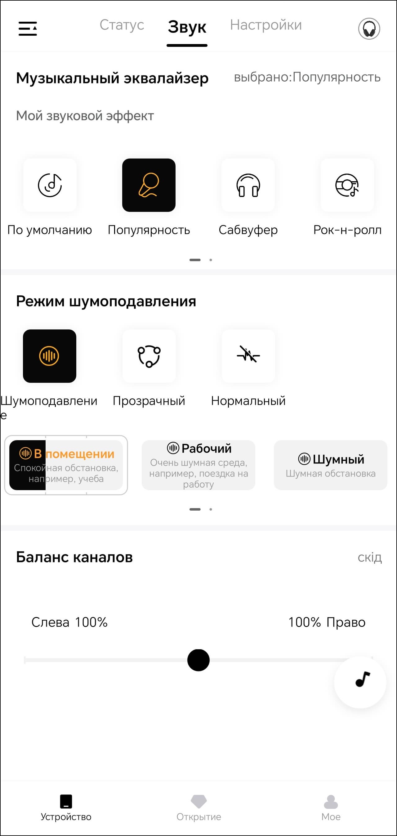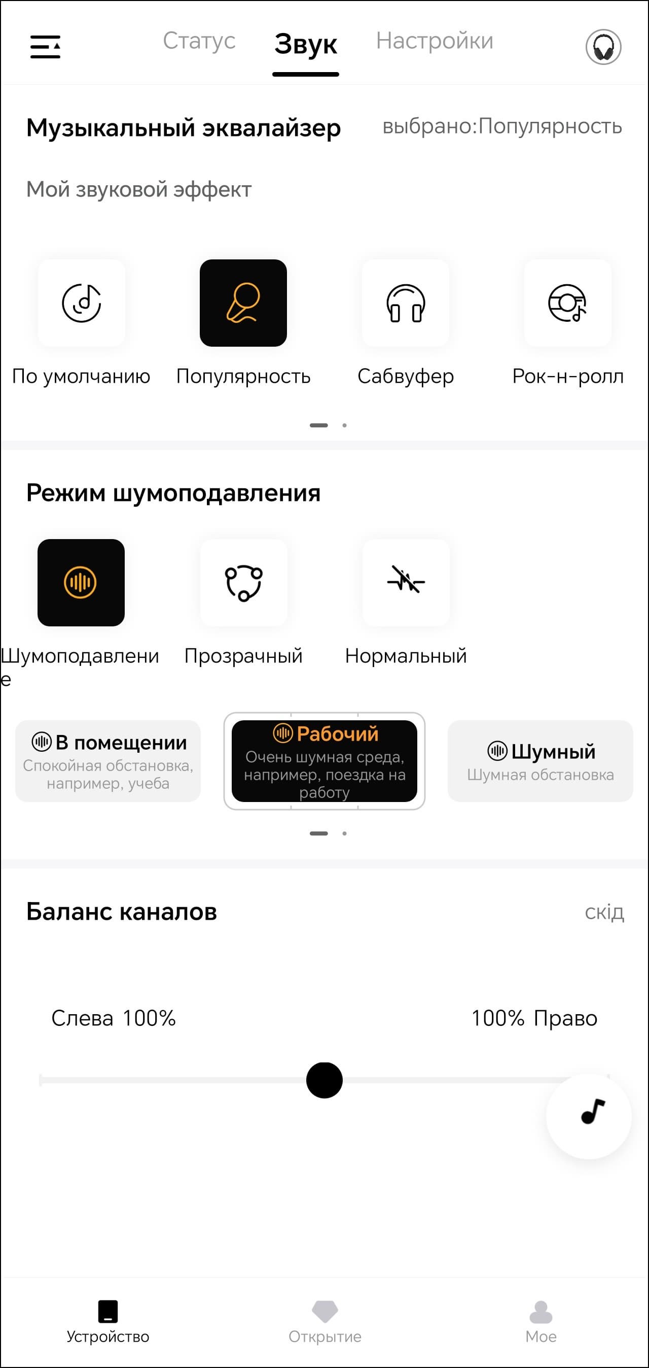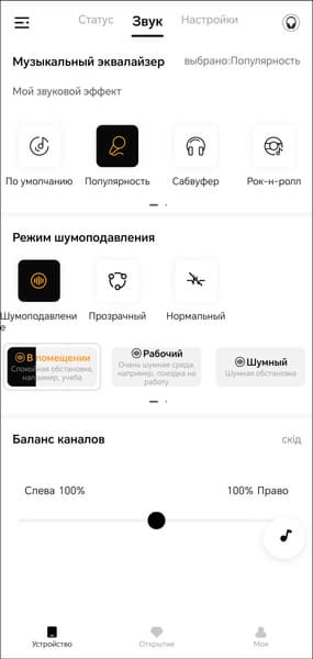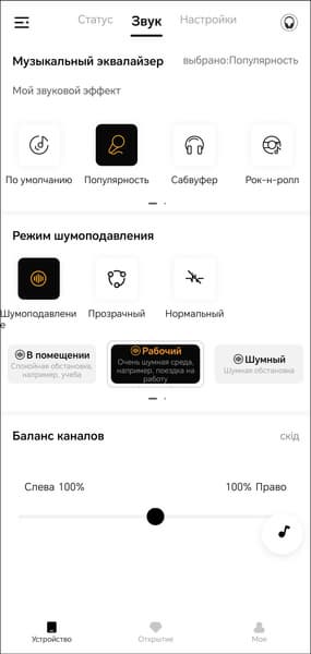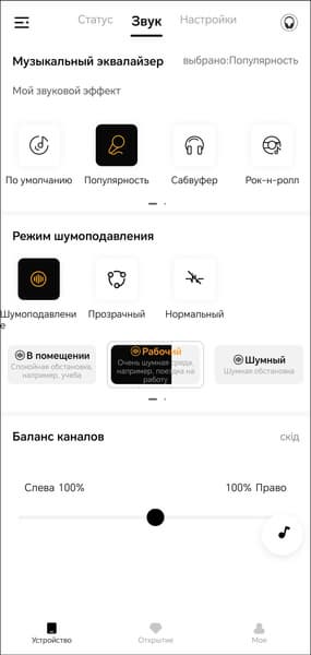 На первой вкладке устройства мы видим только его изображение и уровень зарядки встроенного аккумулятора. Всё самое интересное находится на следующей. Там размещены модули выбора пресетов эквалайзера и создания своих, а также режима шумоподавления.