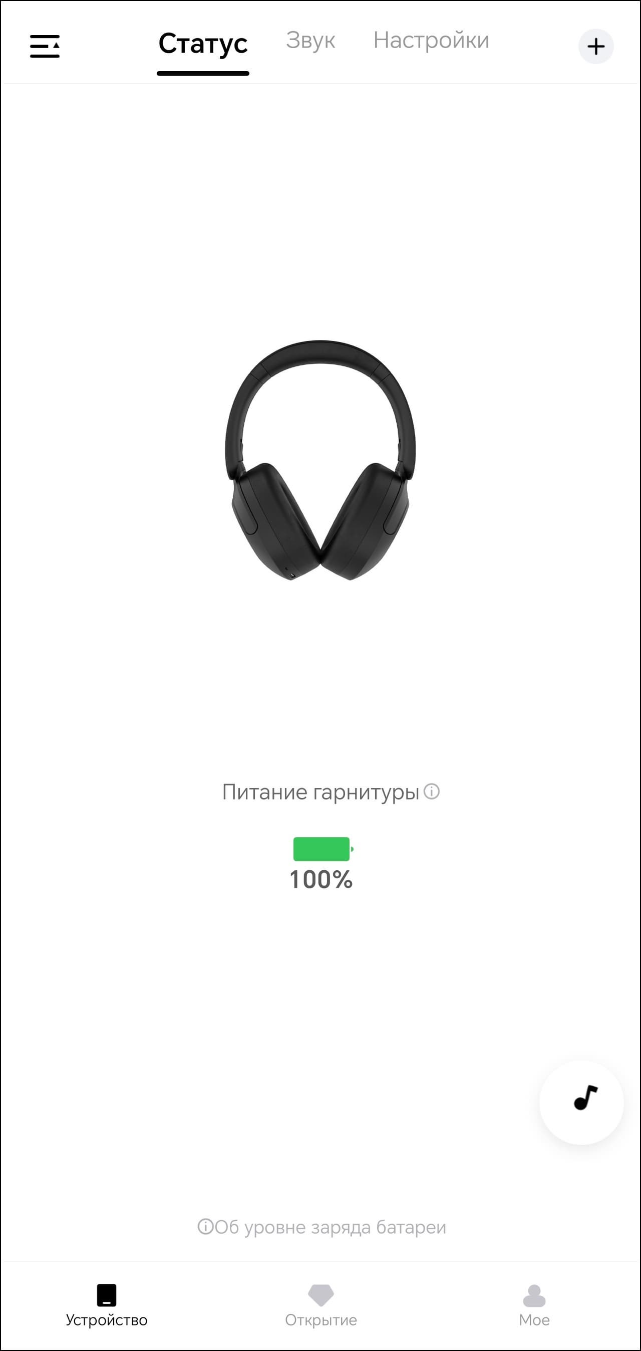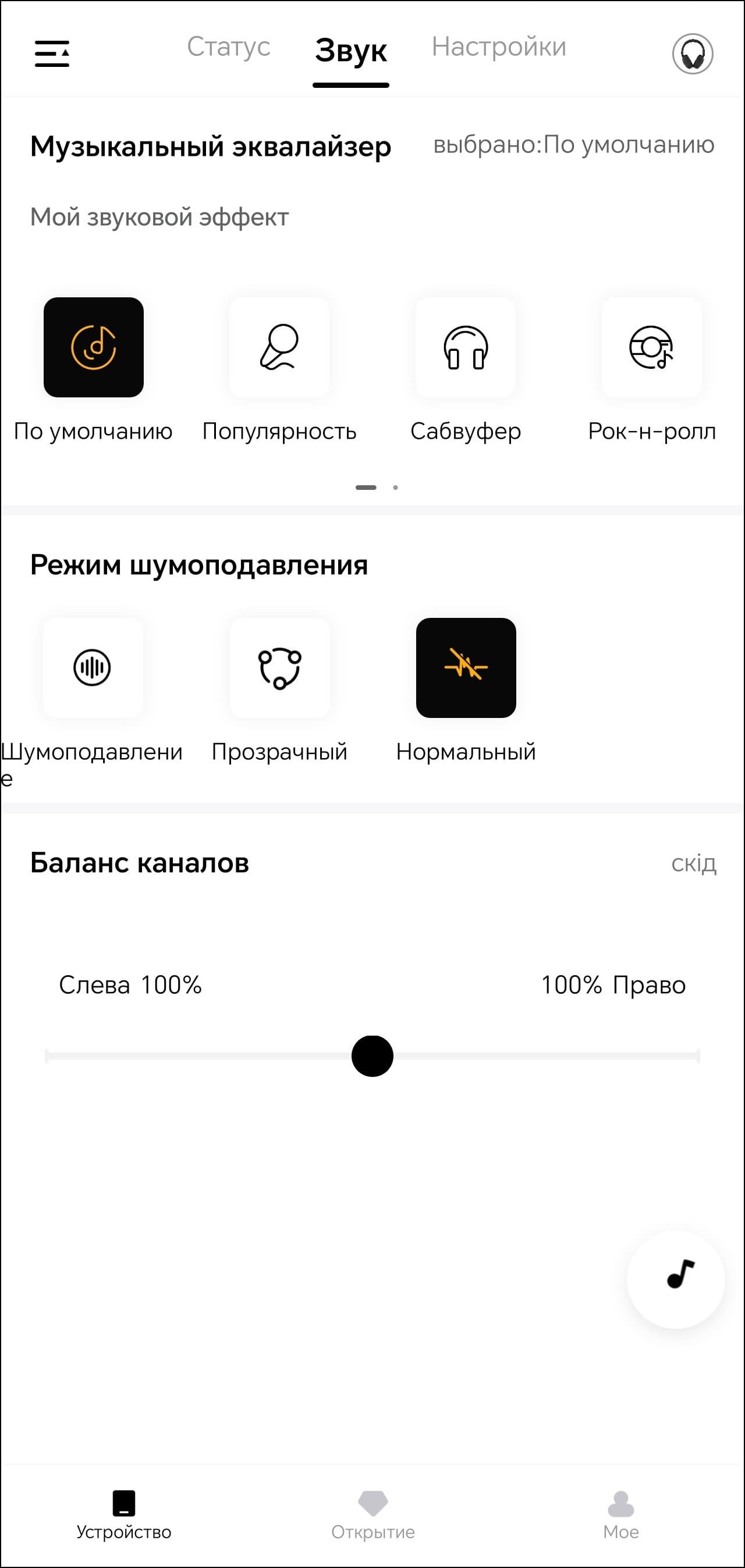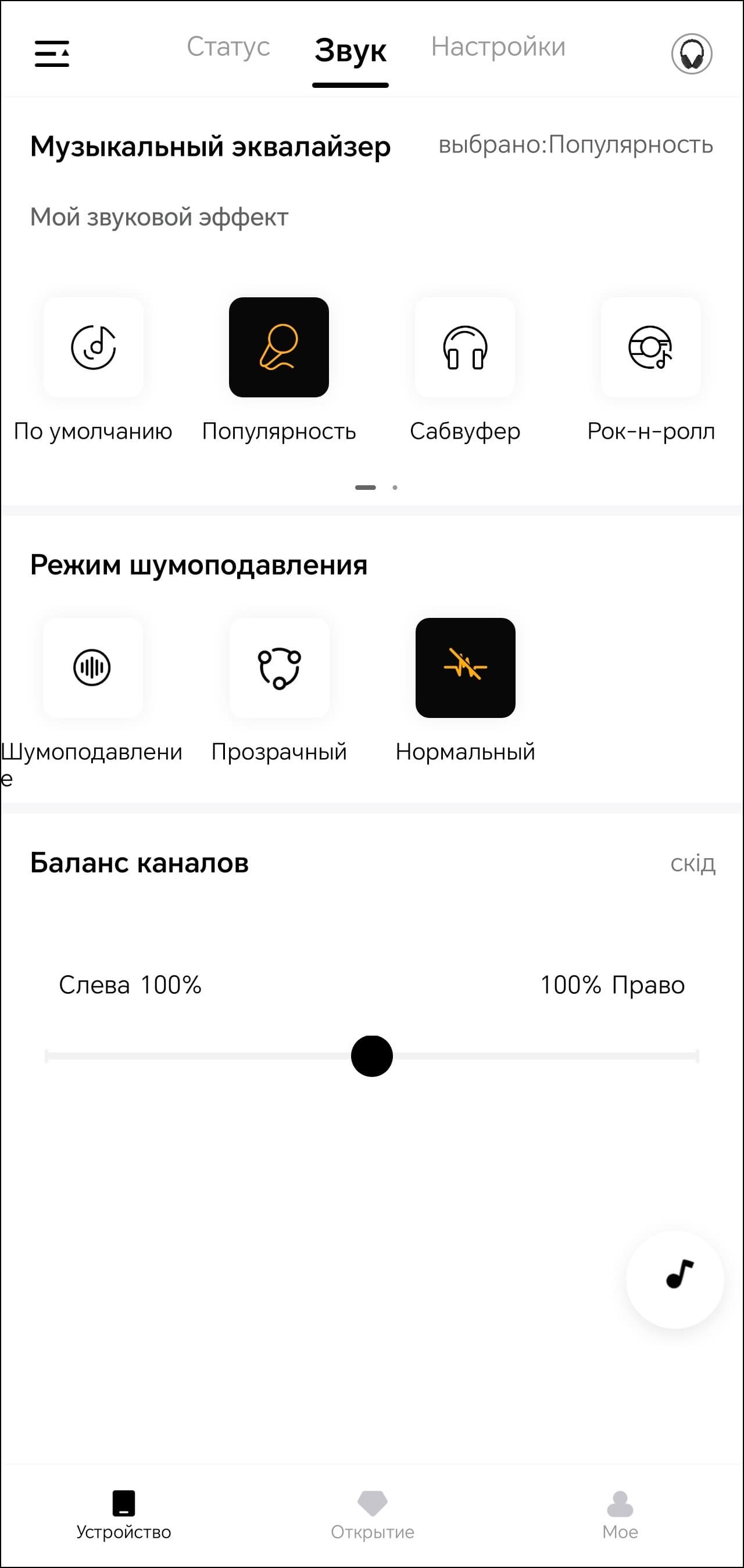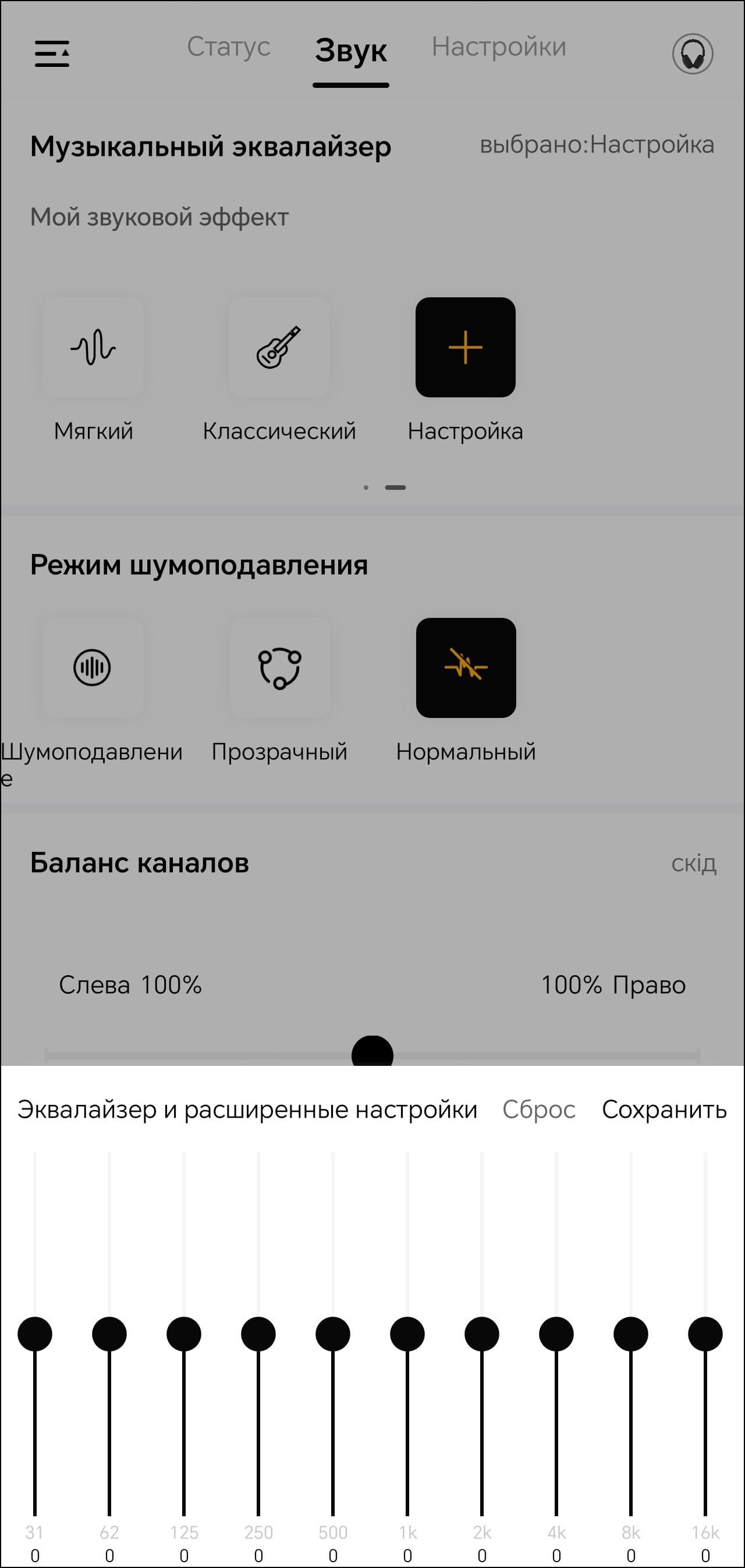 На первой вкладке устройства мы видим только его изображение и уровень зарядки встроенного аккумулятора. Всё самое интересное находится на следующей. Там размещены модули выбора пресетов эквалайзера и создания своих, а также режима шумоподавления.