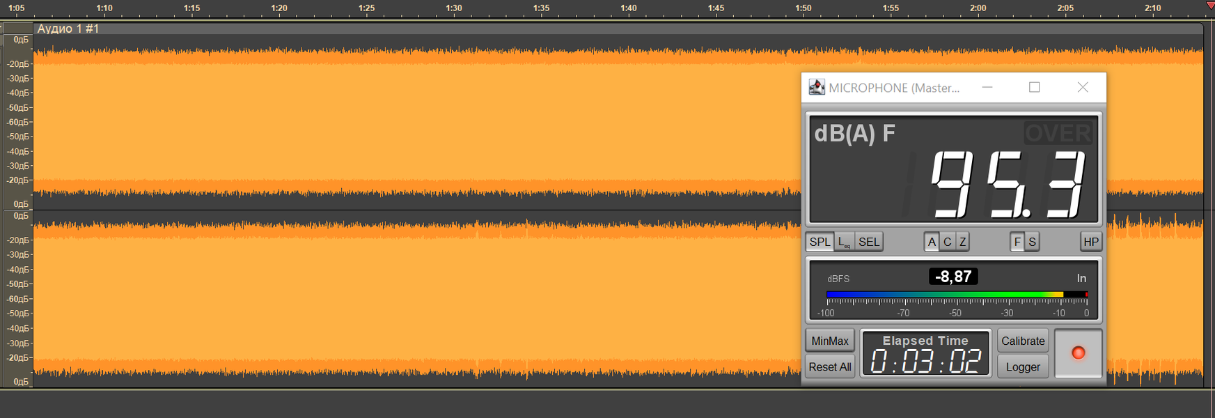 Вкратце напомним нашу методику тестирования автономности беспроводных наушников. Безопасным уровнем звукового давления при прослушивании музыки считается 75 дБ, но на практике большинство слушателей предпочитает уровень 90-100 дБ. Мы транслируем в наушники белый шум, фиксируя уровень SPL в районе 95 дБ, сразу после старта воспроизведения запускаем запись сигнала с измерительного стенда — по длине получившегося трека легко понять, сколько устройство проработало.