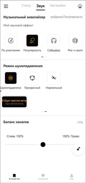 При этом режимы «шумодава» теперь еще и обладают регуляторами агрессивности шумоподавления — потенциально это очень интересная возможность, но реализована она средненько, к чему мы еще вернемся. Режим «Шум против ветра» спрятан за краем экрана — чтобы добраться до него, надо сдвинуть список влево, предварительно догадавшись, что это возможно. Что помешало дизайнерам приложения разместить кнопки в два ряда — одна из многочисленных загадок ПО QCY.