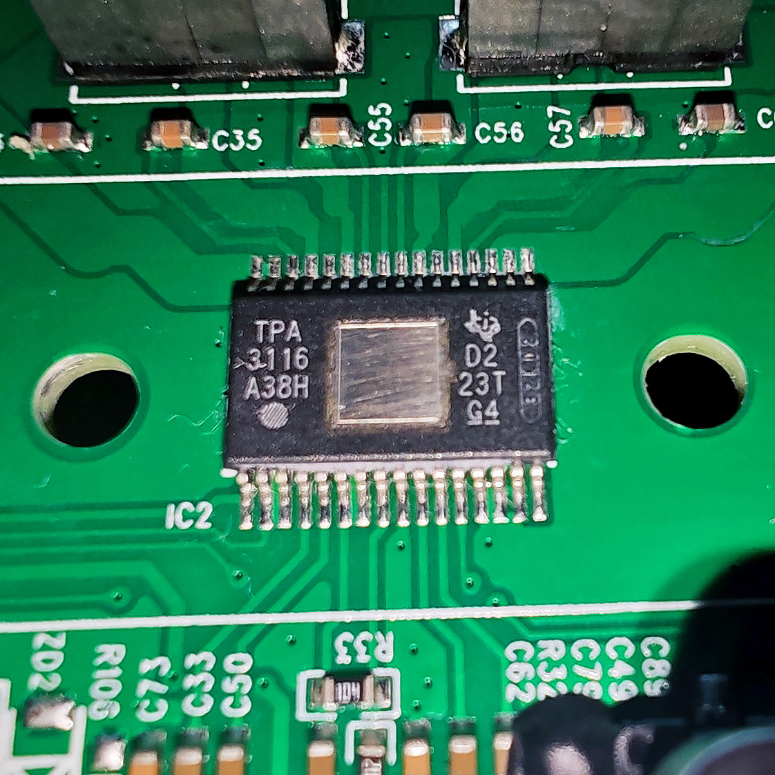 В качестве усилителя класса D выступает TPA 3116 D2 производства Texas Instruments, выдающий 2×50 Вт при нагрузке 4 Ом.