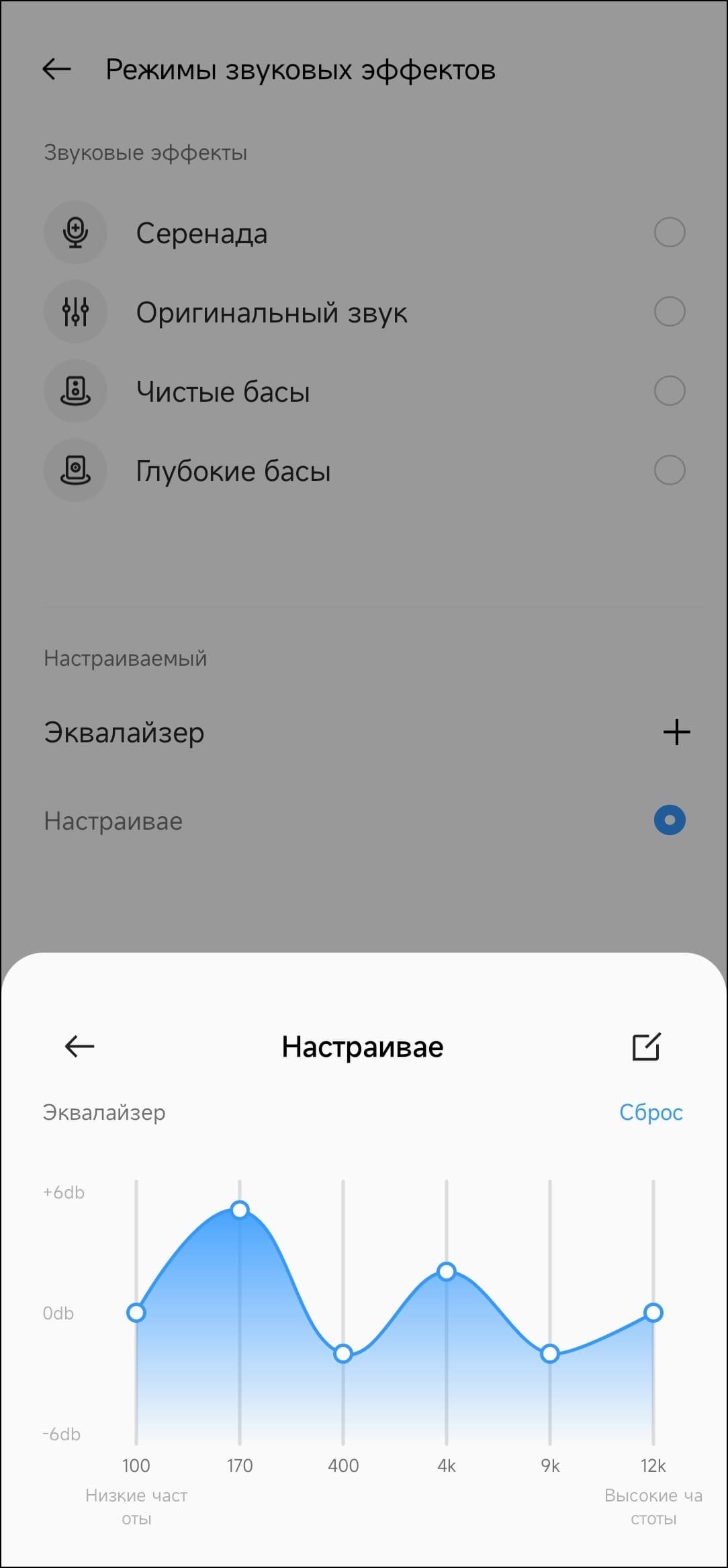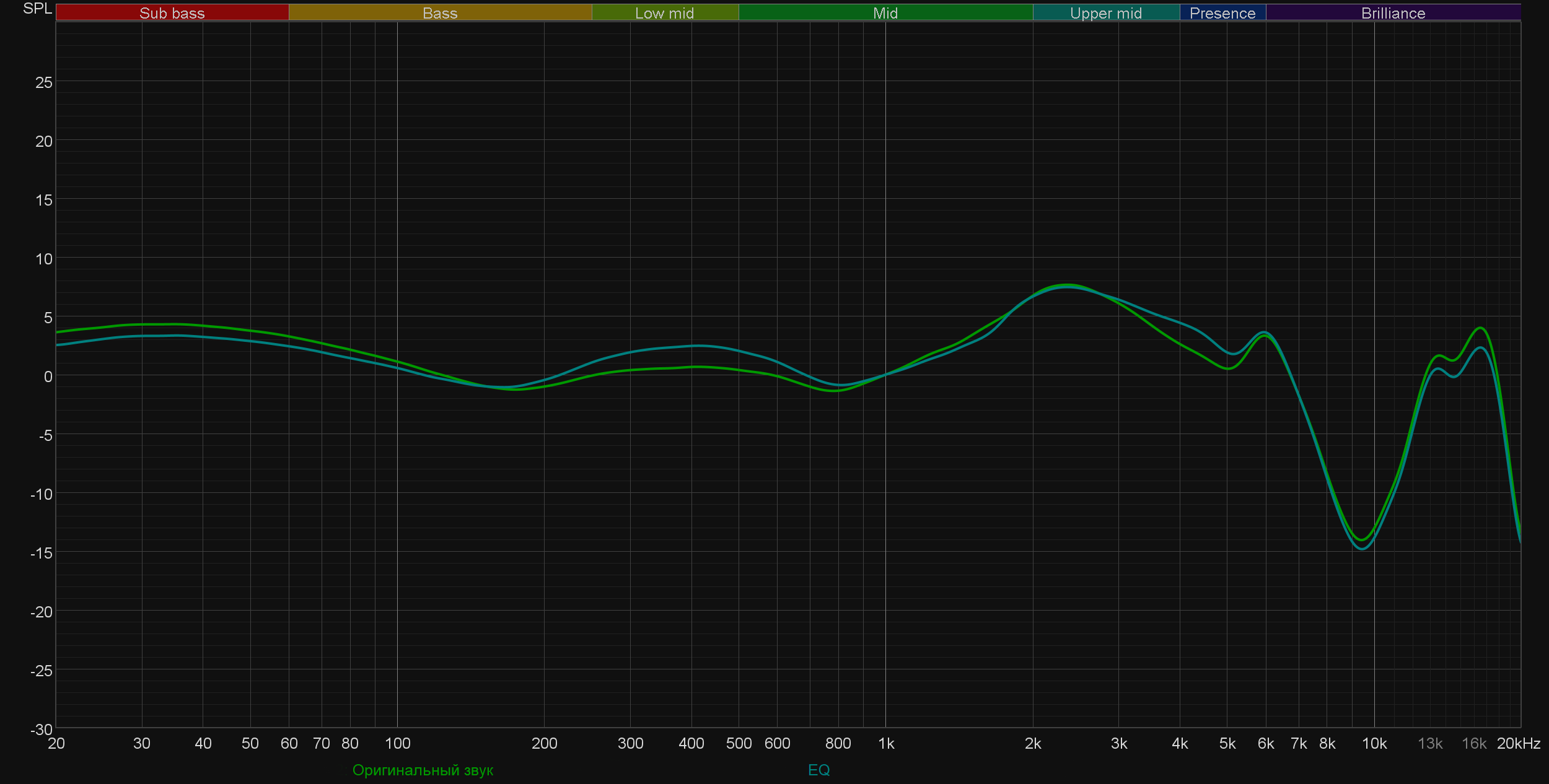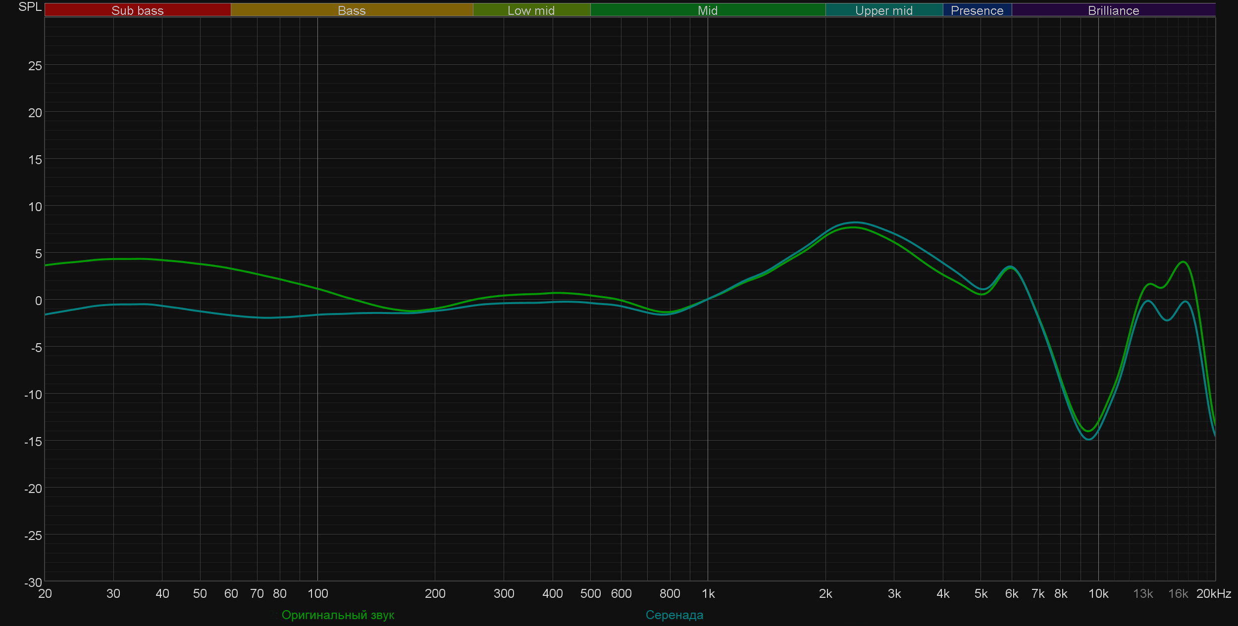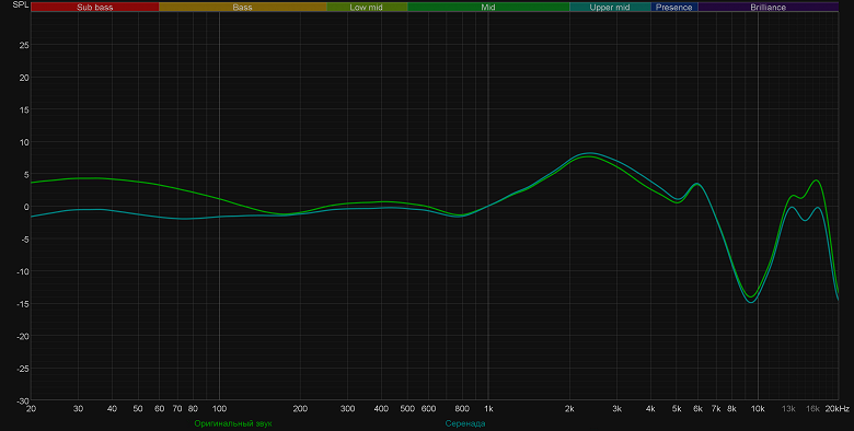 При активации профиля «Серенада» гарнитура практически полностью снимает выделение НЧ-диапазона, «выравнивает» нижнюю середину — звучание получается практически нейтральным и с акцентом на вокальных партиях.