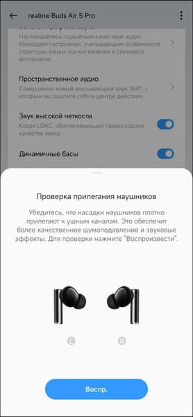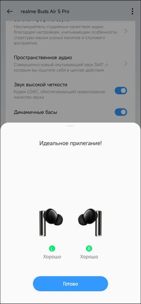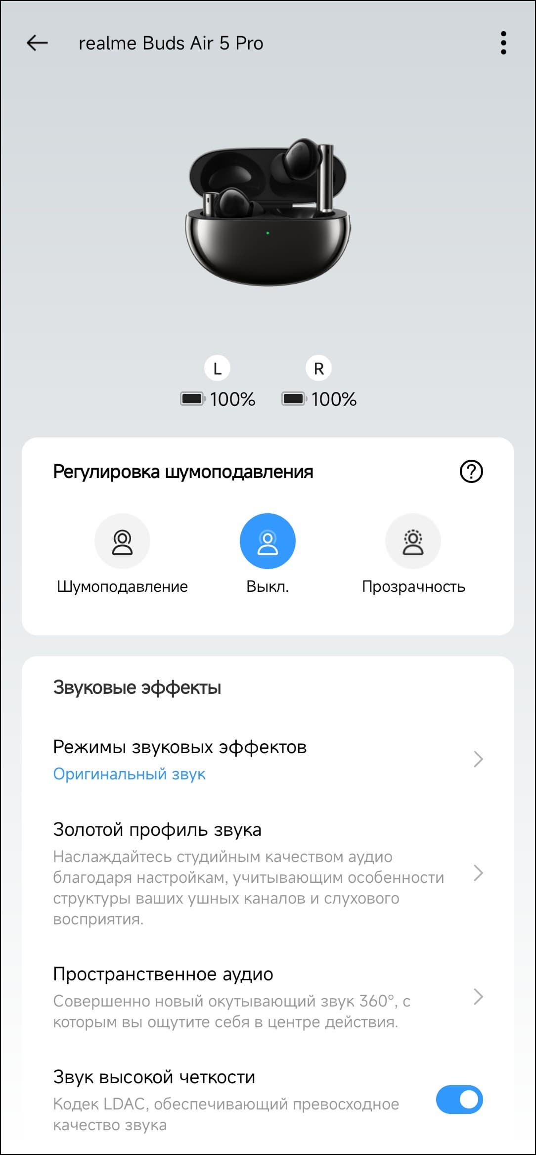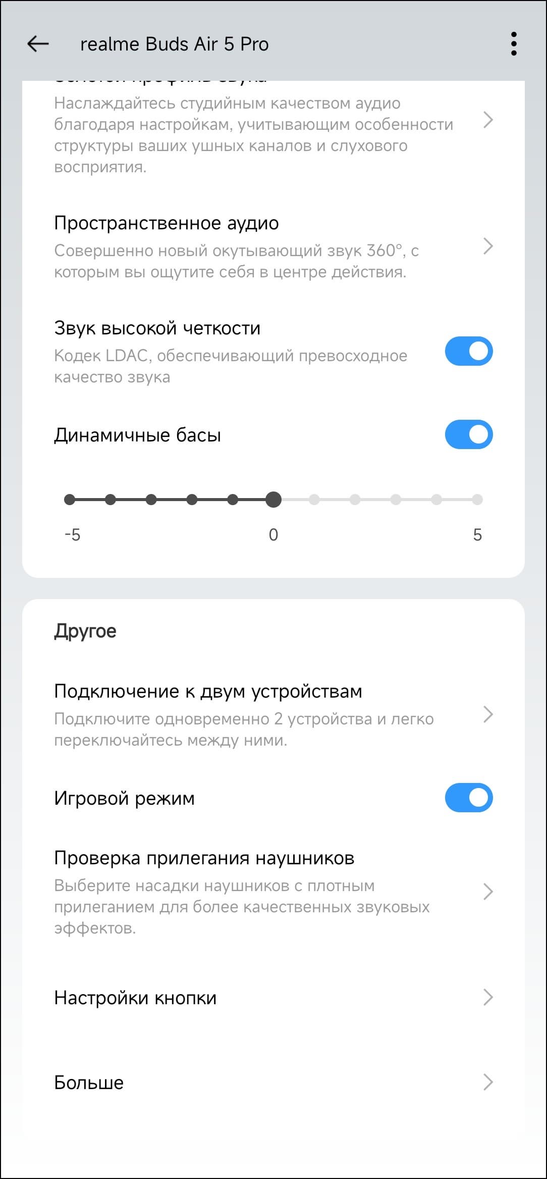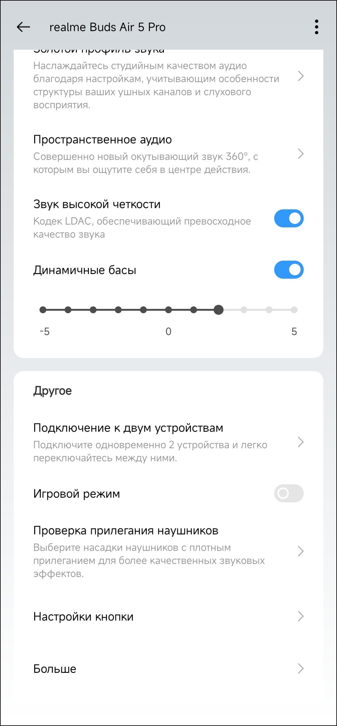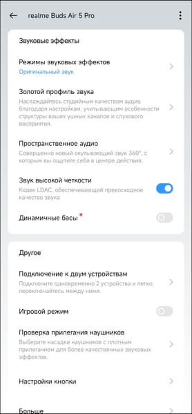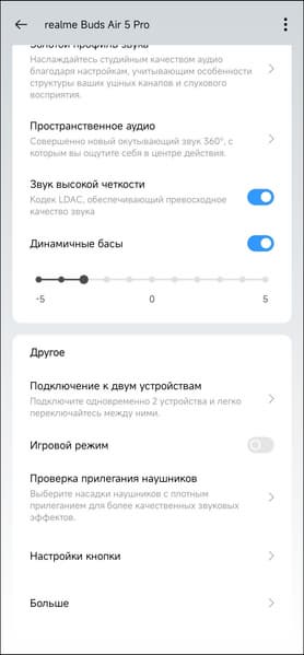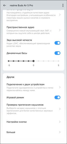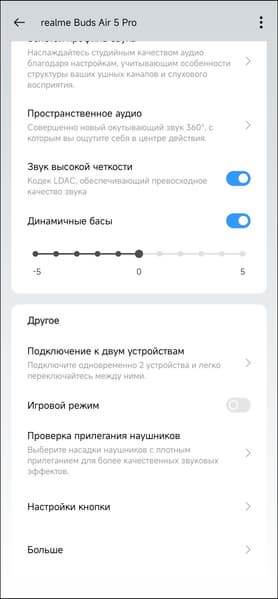 В нашем случае Realme Buds Air 5 Pro сразу задействовала кодек LDAC, но этого могло и не произойти — очень часто по умолчанию активируется AAC, а более «продвинутый» вариант приходится задействовать через приложение или меню смартфона, об этом стоит помнить.