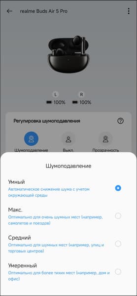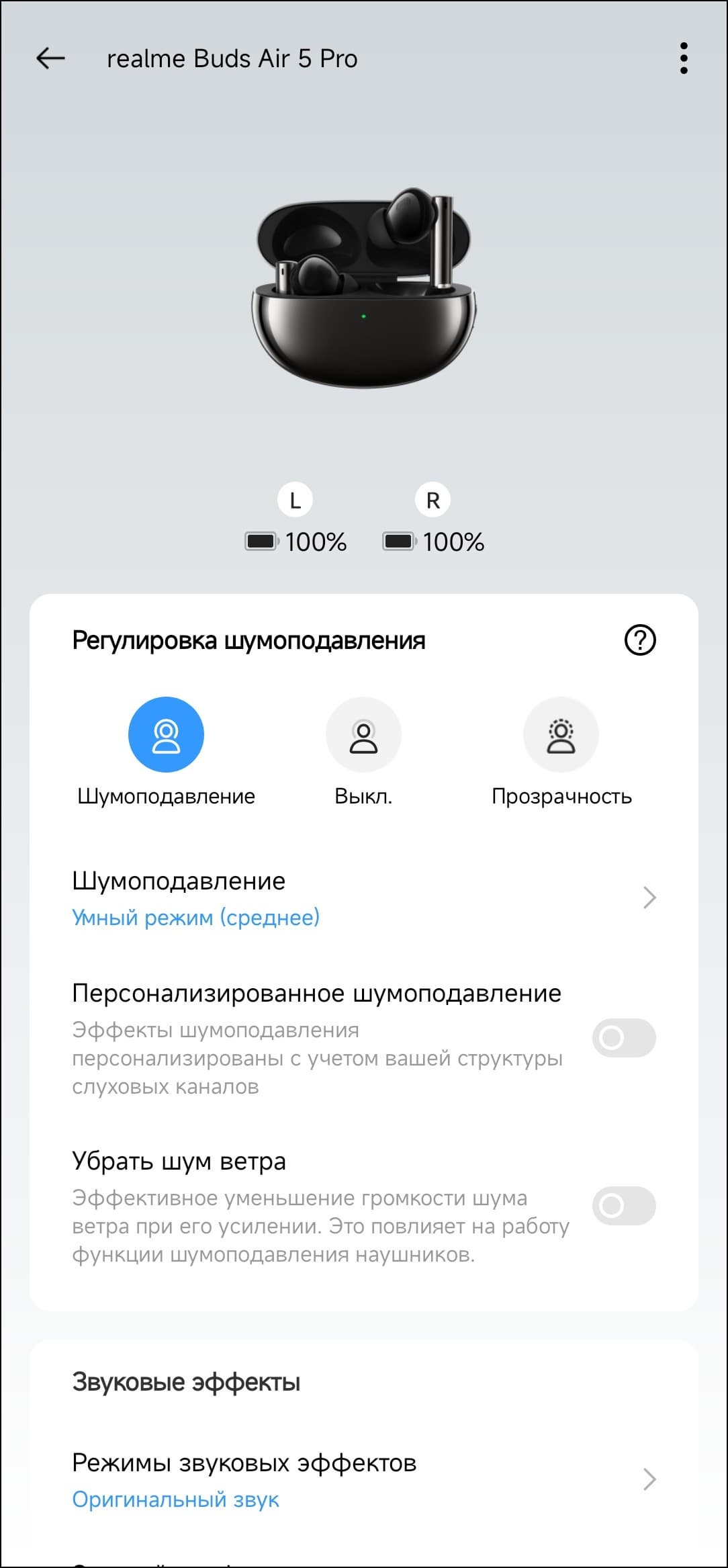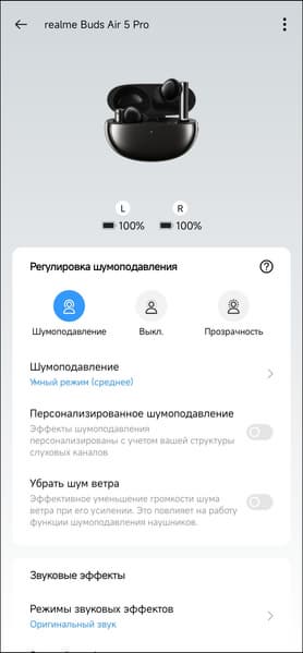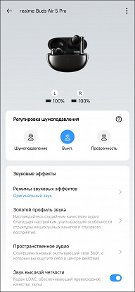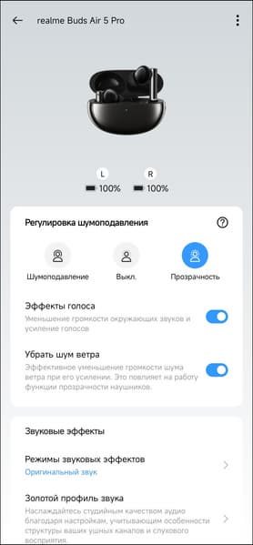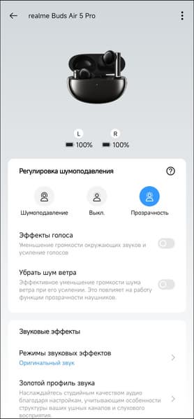 Про установку приложения Realme Link мы уже неоднократно говорили — не будем повторяться. На главной странице устройства можно увидеть уровни зарядки наушников и кейса (демонстрируется только когда наушники находятся в нем, а крышка открыта). Далее мы видим клавиши включения шумоподавления и «режима прозрачности», в котором микрофоны гарнитуры транслируют внешние звуки в ее динамики. У «прозрачности» есть свои опции — можно акцентировать так называемые «голосовые частоты» и убрать шум ветра. Работают они эффективно, при активации обеих звук приобретает неестественную окраску, зато собеседника в шумной обстановке зачастую слышно лучше, чем без наушников.