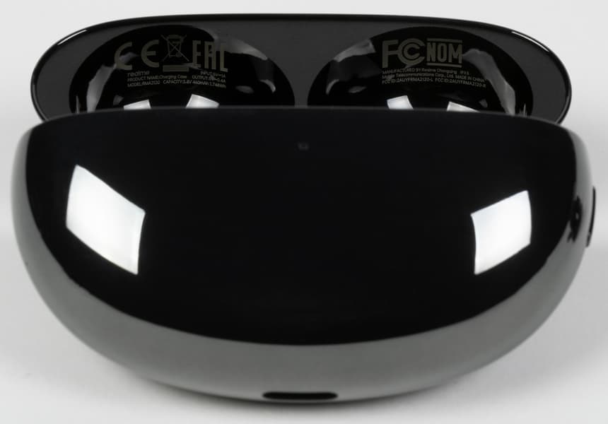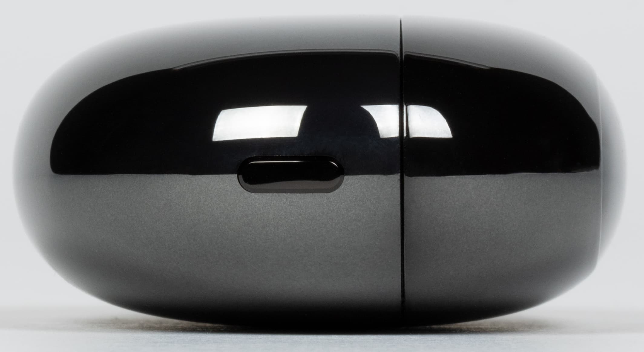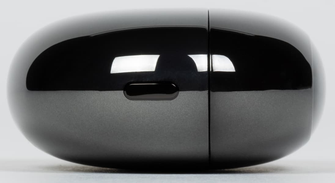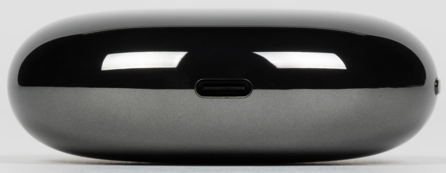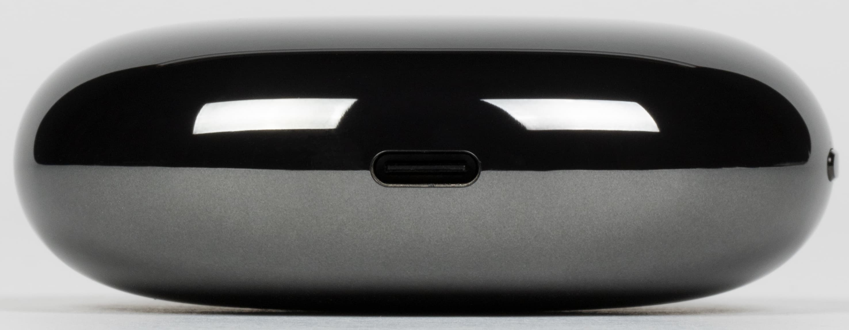 На дне мы видим порт USB Type C для зарядки. Передняя и задняя поверхности кейса сделаны плоскими, благодаря чему он легко помещается в кармане.